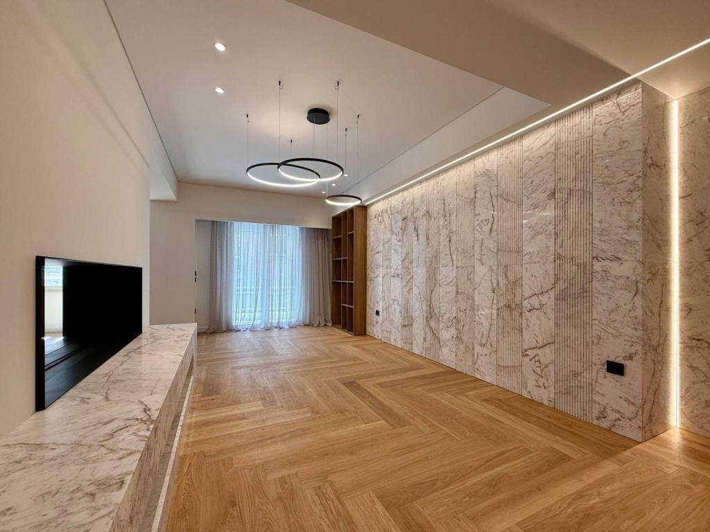 Located in an elegant building from the late 1960's this entirely redesigned 111 m2 property is a stunning architectural achievement. It blends harmoniously diachronic wooden floors with bright marble pieces giving the flat exclusive character. Carefully selected lighting fixtures emphasize the fluidity of the lay-out. The front side presents a living area smartly separated from the kitchen/dining area by a long fire place open to both sides. To the balcony both rooms merge to form a spacious square-shaped area including the outside space. From the balcony one can catch Saint Georges Church topping Lycavettus Hill on the one side and a bit o Ymittos mountain on the other. Kitchen is fully equipped (even a built-in wine cooler is provided) and a discret guests' WC stands in a corner. The two master bedrooms stand on the opposit side of the property enjoying both their own full bathroom each with a distinctive equipment, a bathtub for the larger and a showertub for the other. On foot to Lycavettus hill or to Mavili Square and even to Kolonaki center the location is very convenient.