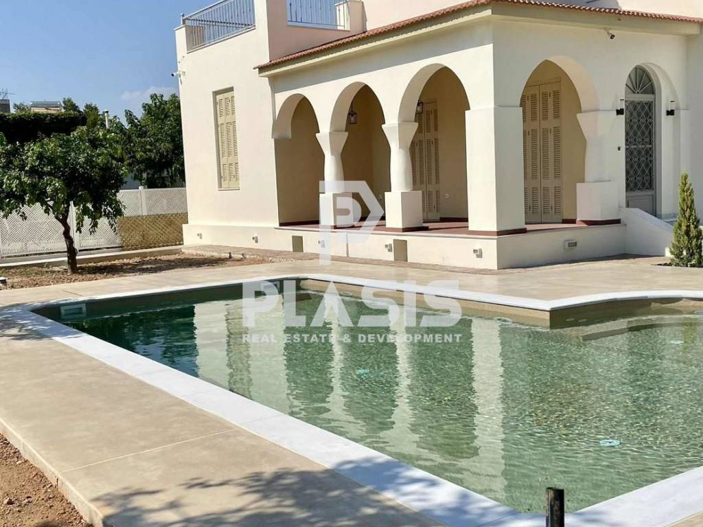 Villa For rent, floor: Ground floor, 1st (2 Levels), in Elliniko - Kato Elliniko. The Villa is 240 sq.m. and it is located on a plot of 625 sq.m.. It consists of: 4 bedrooms, 3 bathrooms, 1 wc, 1 kitchens, 1 living rooms and it also has 1 parkings (1 Closed). The property was built in 1960 and it was renovated in 2025. Its heating is Autonomous with Fan coil, Heating per level, Air conditioning, Solar water system, Boiler, Sound insulation, Thermal insulation are also available, it has Alluminum frames with Double glazed windows, the energy certificate is: A and its floors are Wooden, Mosaic. The property's status is: Renovated, Excellent condition, it is close to Tram, Transportation, Park, Sea, Seaside, it has Nature, Openness view. The Villa is Painted, With Facade, Bright, Airy, Sunny, Airy, Detached, Luxury, Mansion, Neoclassical, Preserved and it also has the following unique features and advantages: Window Screens, Electric Appliances, Storage, Internal staircase, Swimming pool, Garden, Security door, CCTV, Security alarm, Pets allowed, Quiet neighborhood. Price: €7.500. Plasis Real Estate Γλυφάδα, contact phone: 2109601909, email: info@plasis.com.gr, website: