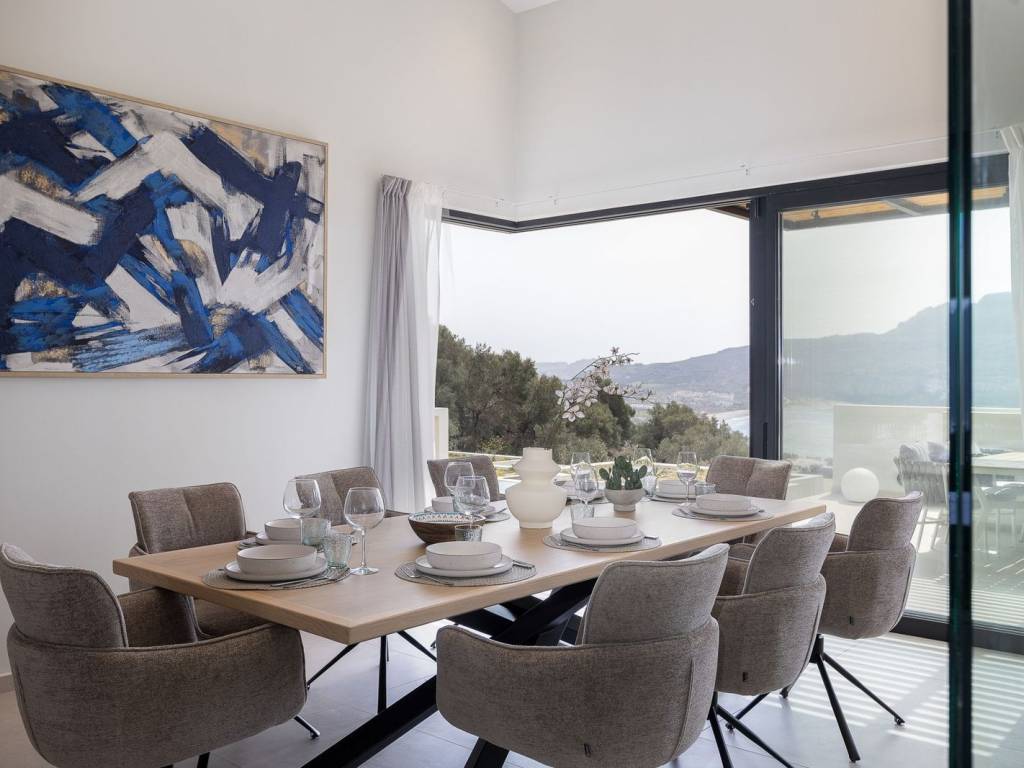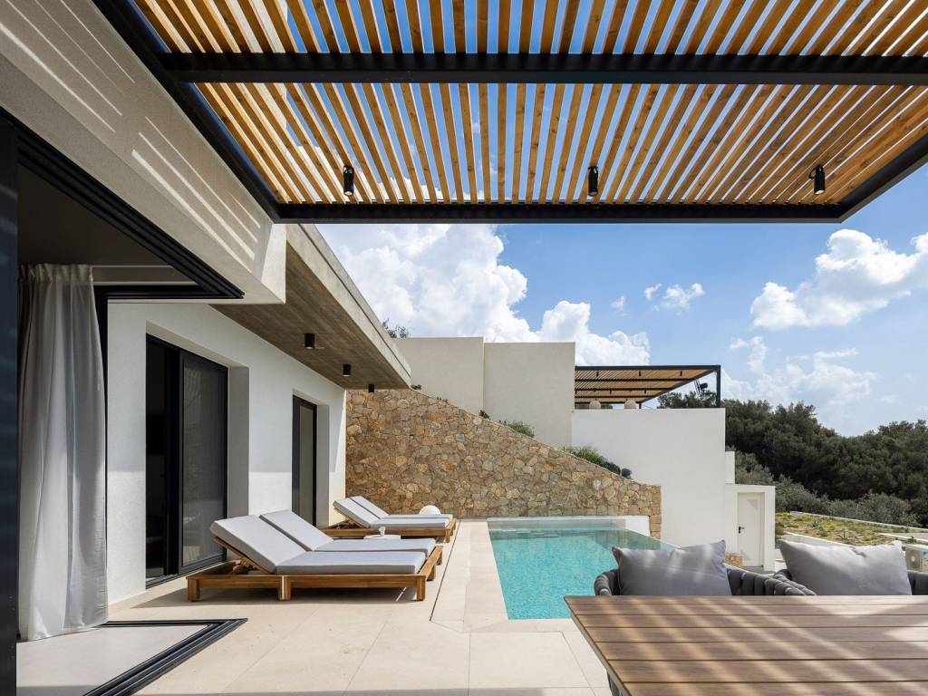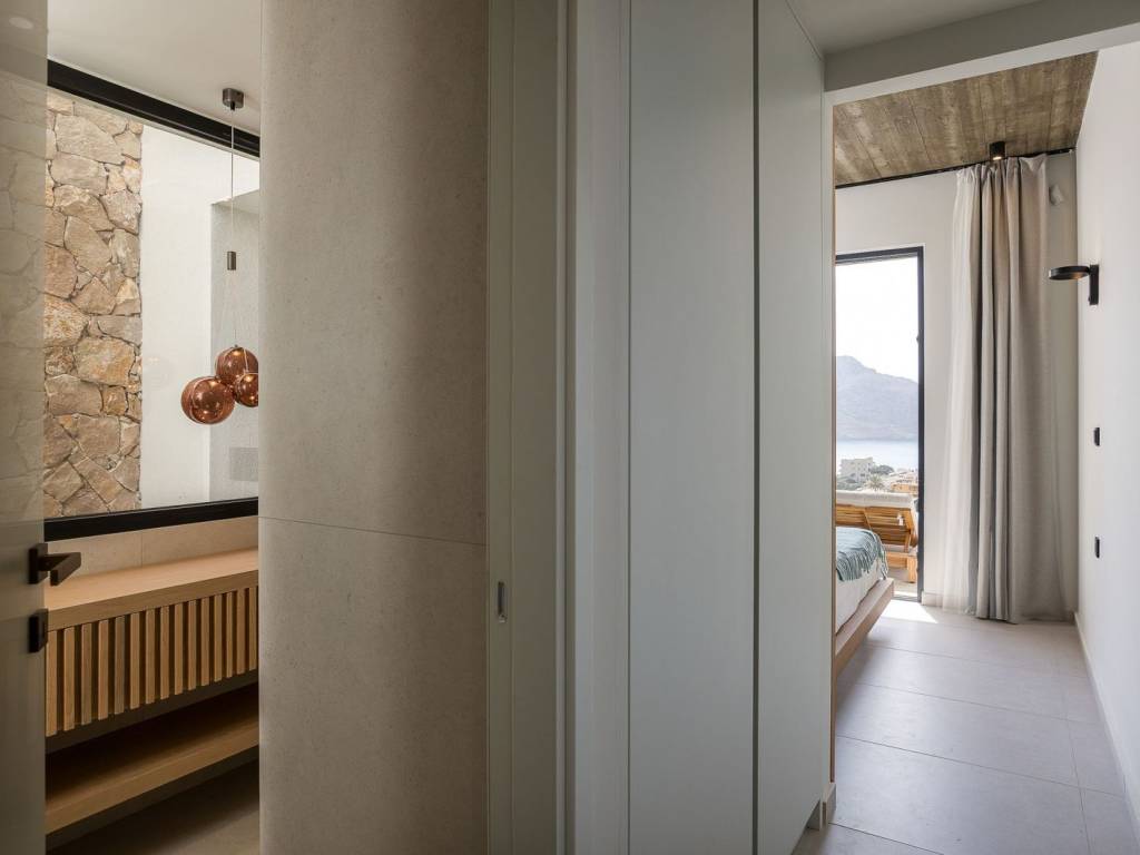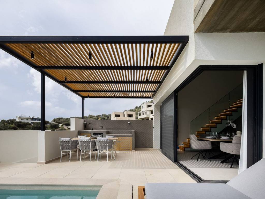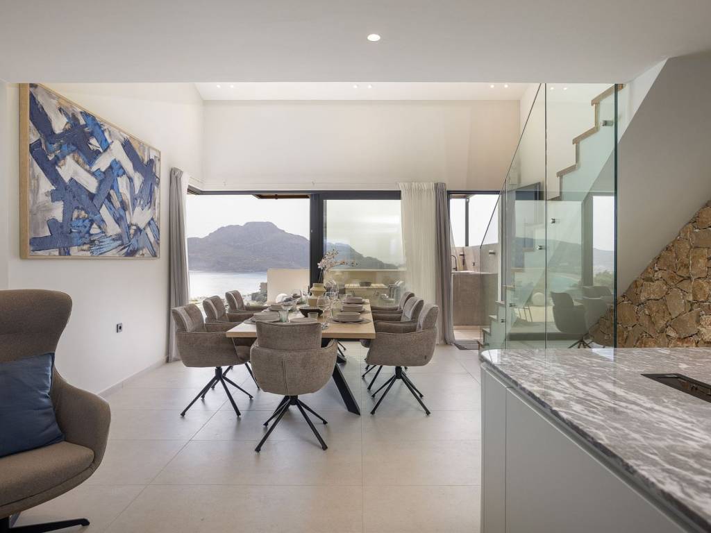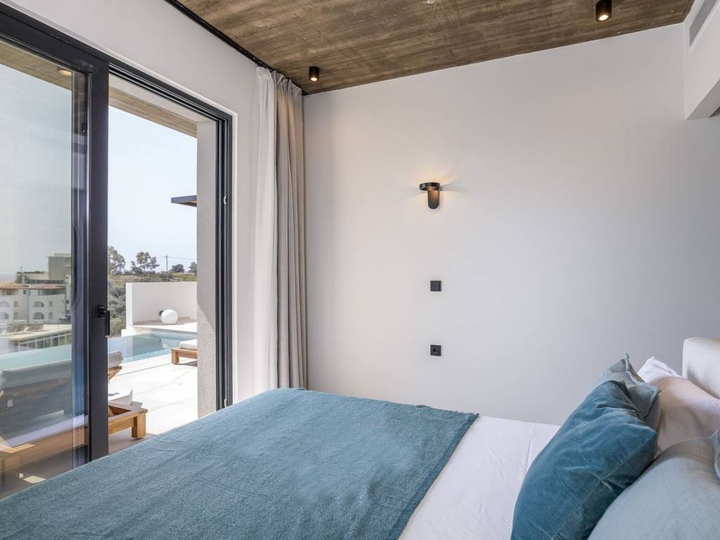 Large floor-to-ceiling sliding doors from both the living area and bedrooms create a seamless transition to the outdoors, opening onto a sun deck and private pool area, ideal for enjoying open sea views and Creteâs Mediterranean climate.