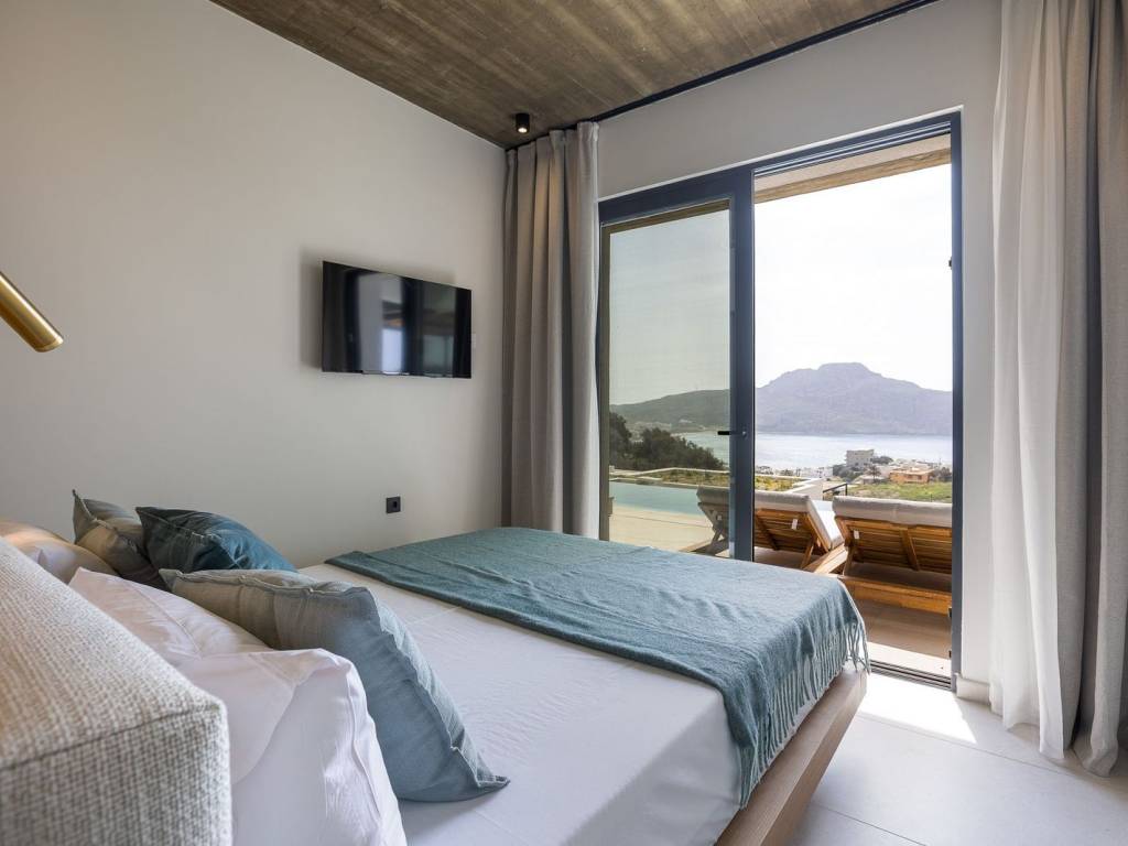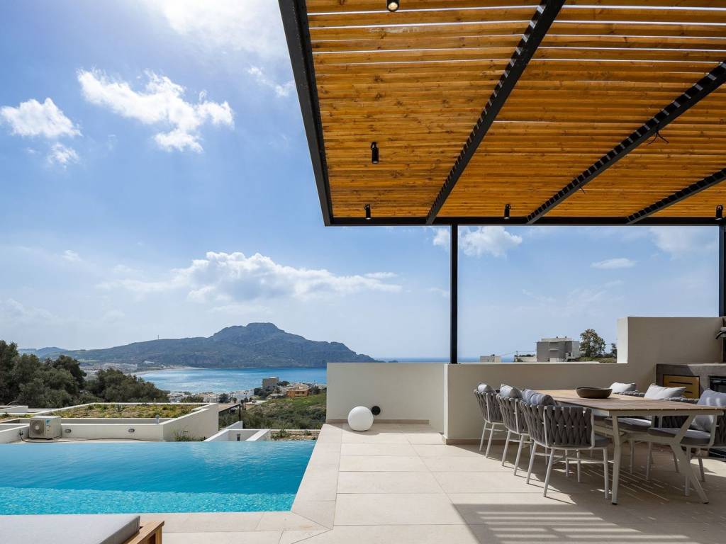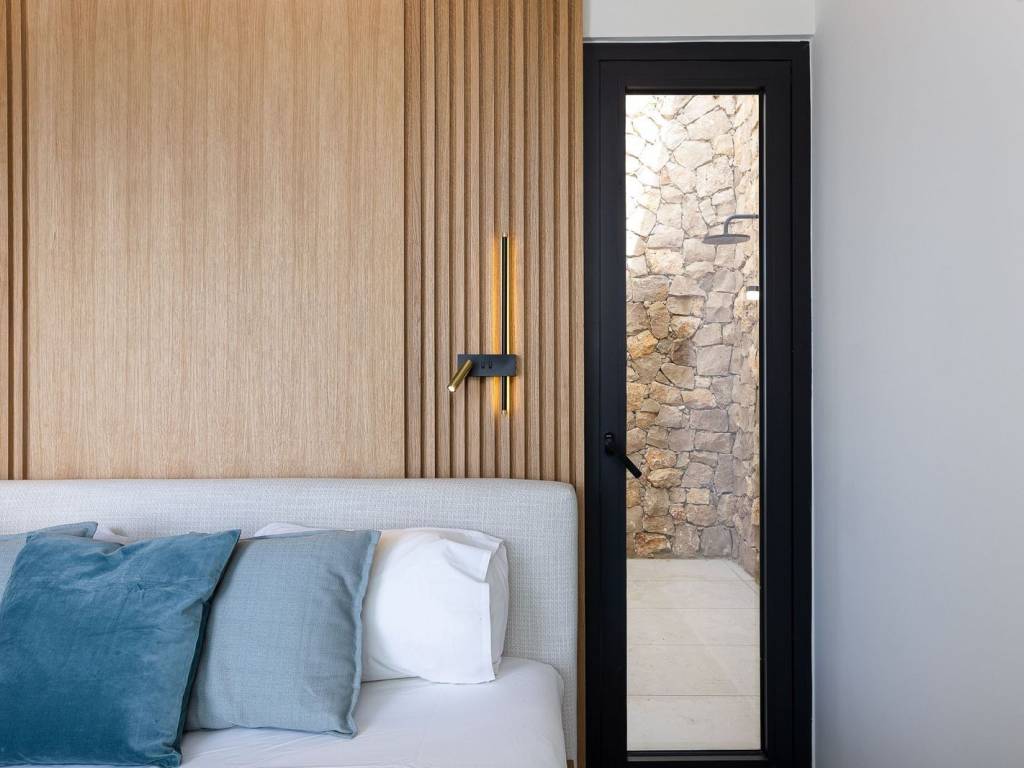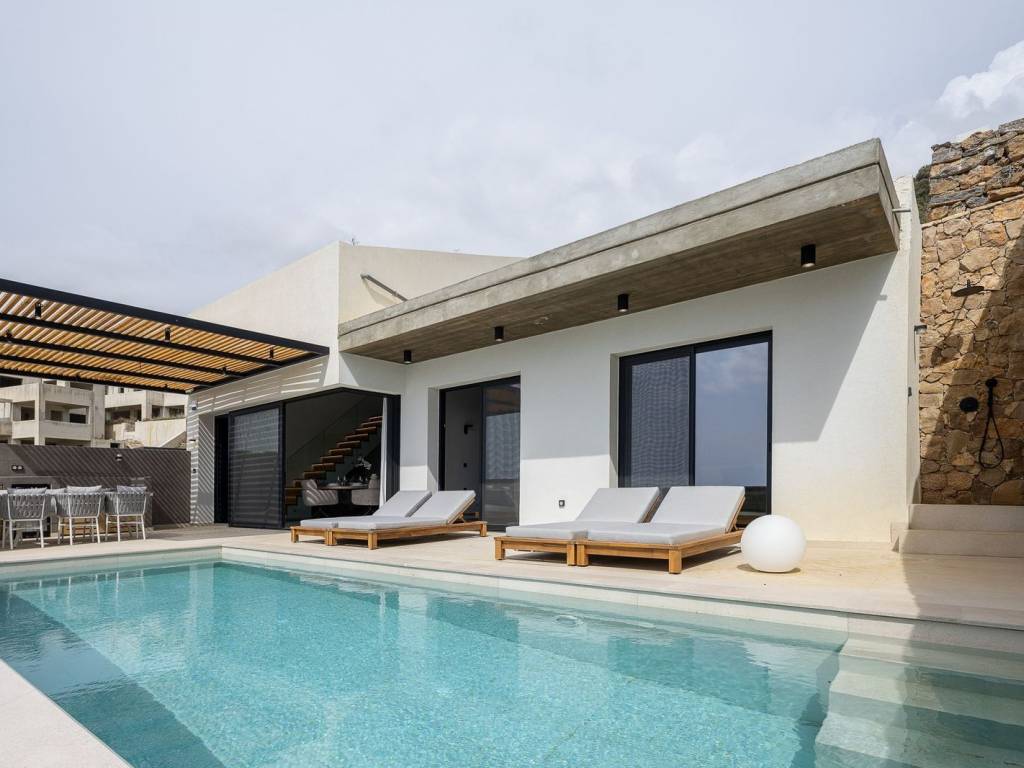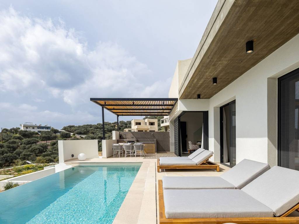 Large floor-to-ceiling sliding doors from both the living area and bedrooms create a seamless transition to the outdoors, opening onto a sun deck and private pool area, ideal for enjoying open sea views and Creteâs Mediterranean climate.