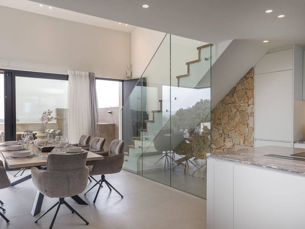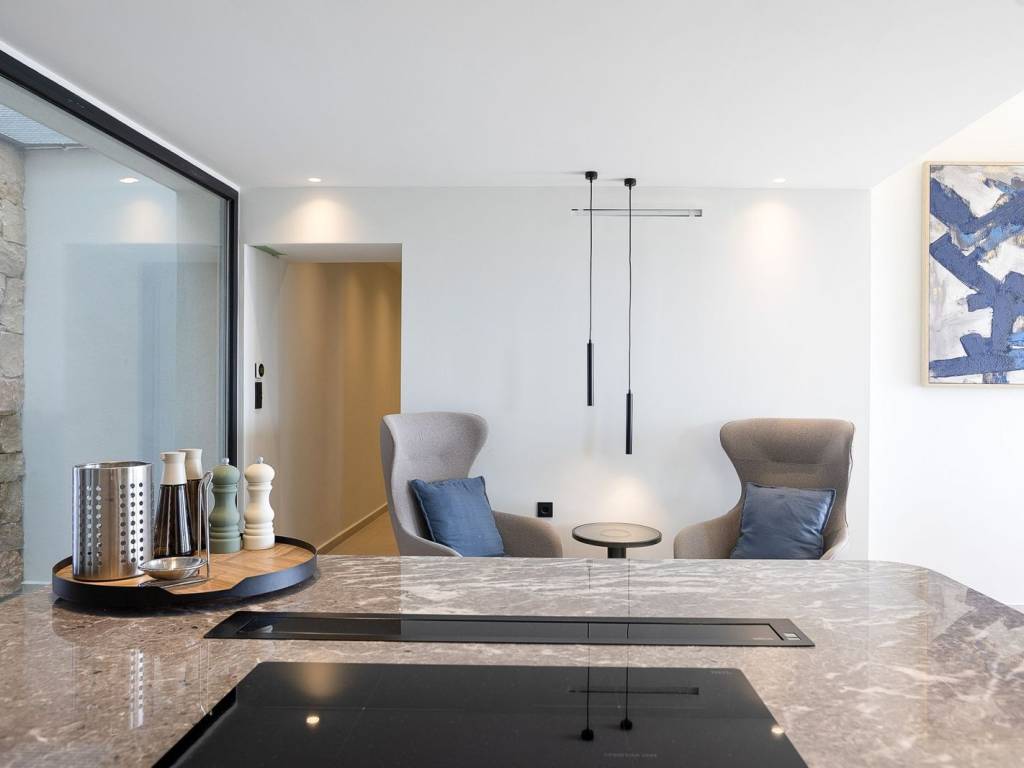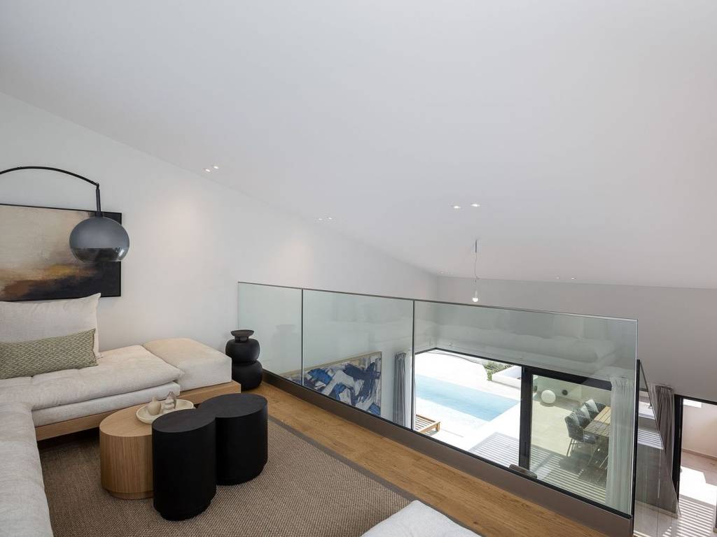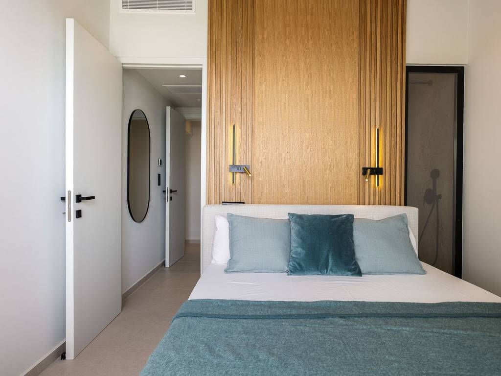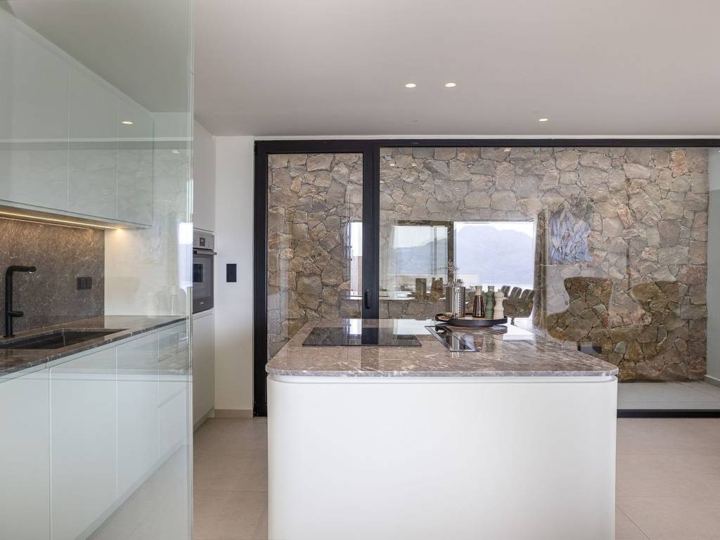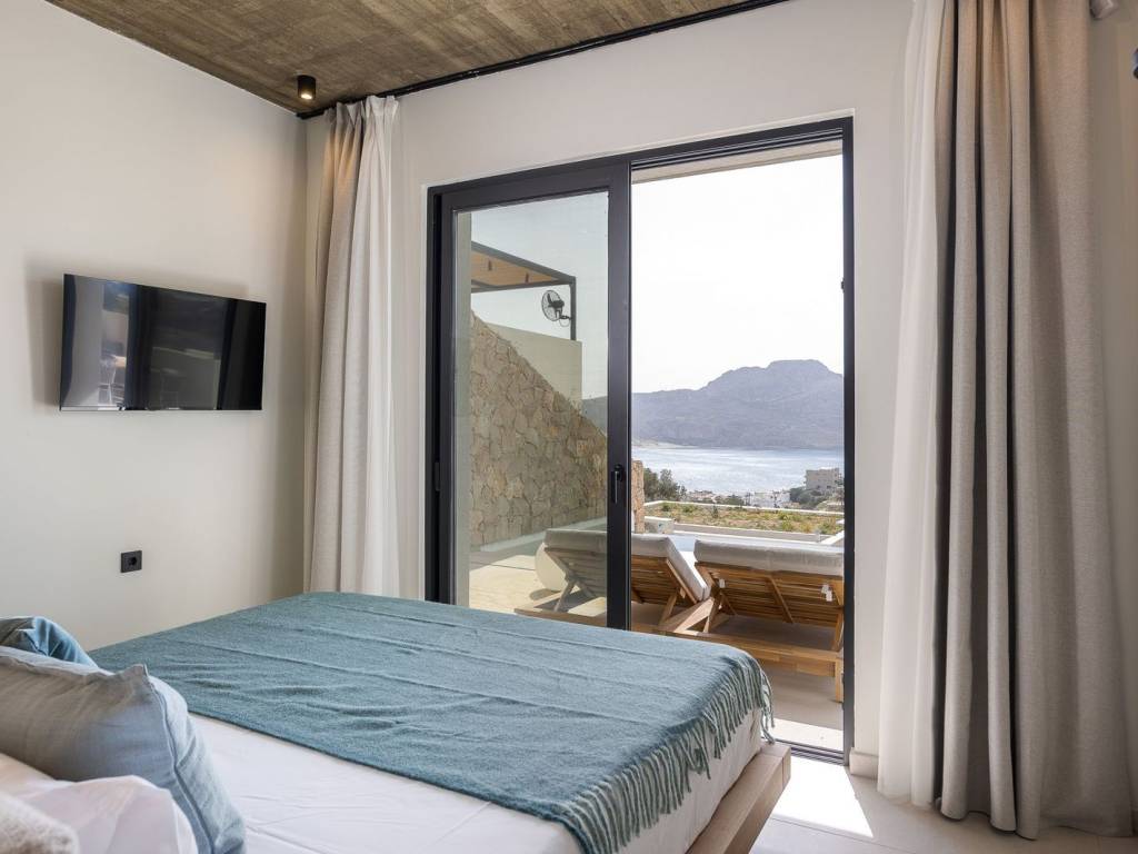 Large floor-to-ceiling sliding doors from both the living area and bedrooms create a seamless transition to the outdoors, opening onto a sun deck and private pool area, ideal for enjoying open sea views and Creteâs Mediterranean climate.