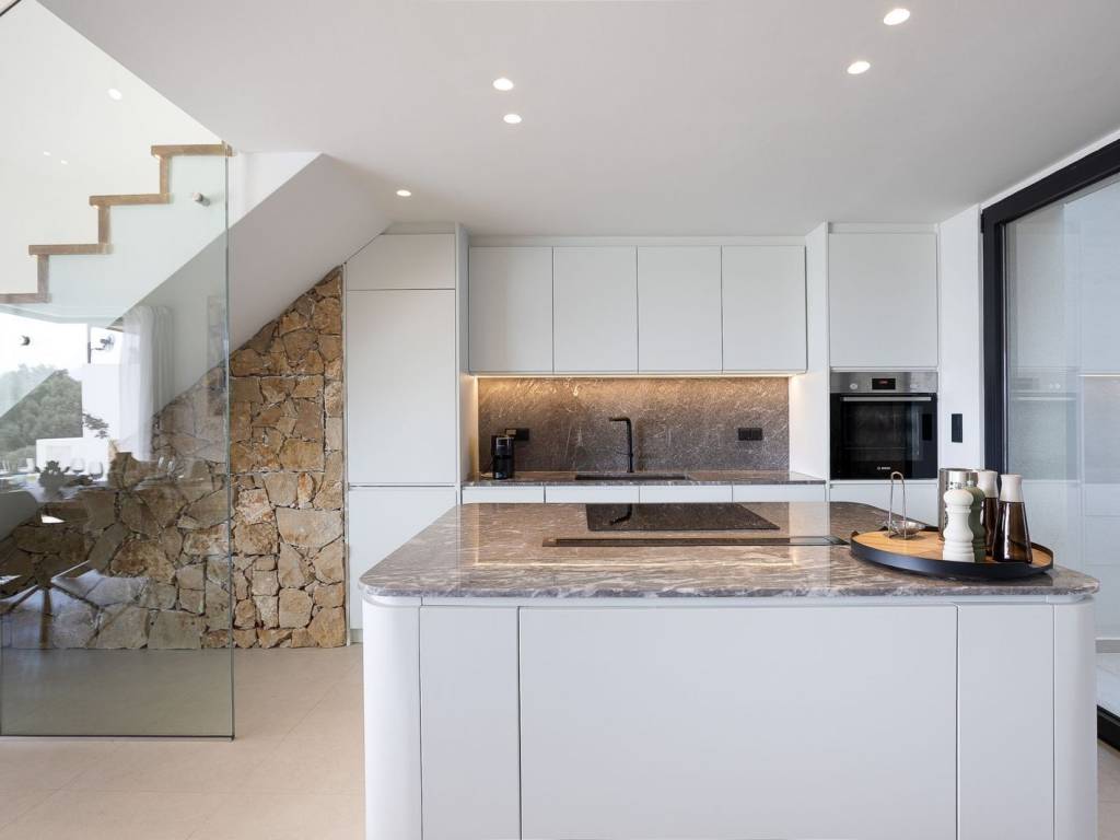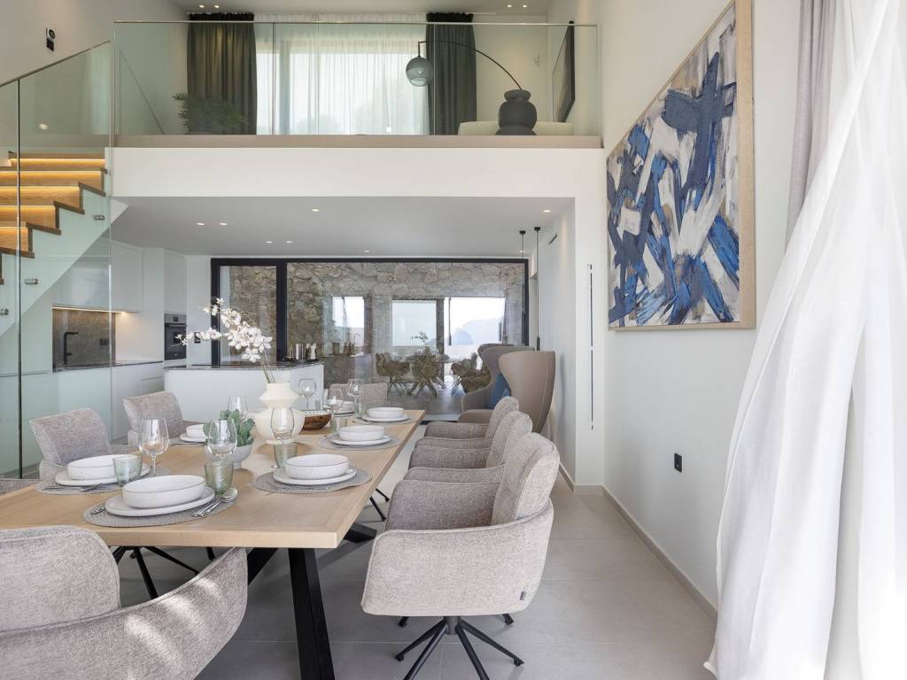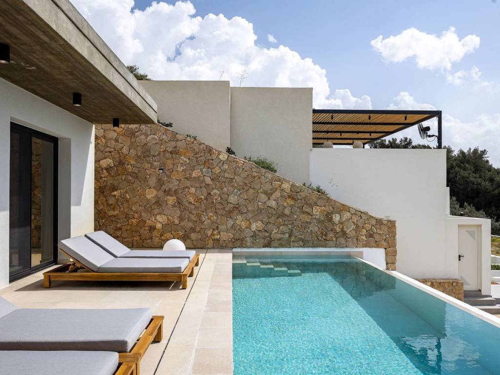 The villa's outdoor space centers on the infinity pool and sun deck, with open sea views from the pool and across the deck. A shaded dining area and open-air kitchen will cater to al fresco dining under the Mediterranean sun.