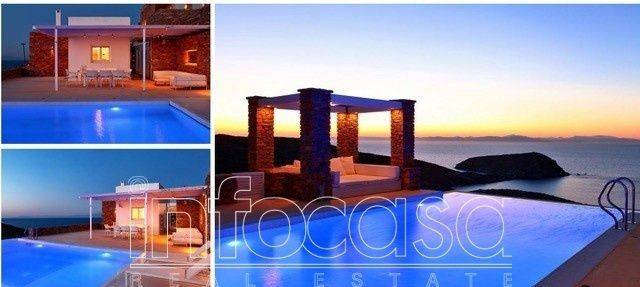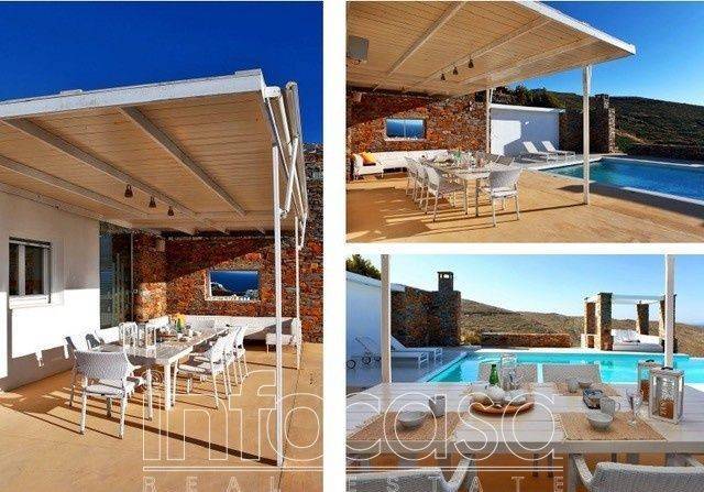 Ozias, Kea: 220-square-meter villa on a 1,450-square-meter lot, located 200 meters from the costline. Luxurious with Cycladic architectural elements and unobstructed northwest views of the Aegean Sea. It consists of living room with fireplace, fully equipped kitchen-dining area with modern appliances, 3 bedrooms, 1 of which is master bedroom, 2 bathrooms and 1 WC. It also includes a separate guest house with bedroom and an ensuite bathroom. It features autonomous heating, ceiling fans and air conditioning. The surrounding area features a 5x10 m swimming pool with electric safety cover, parking for 4 cars, and a covered dining area fully equipped. Additionally, there is an outdoor shower cabin by the pool and a 100 sq.m. storage area. Infocasa, Contact Phone: 2107255653, email: info2@infocasa.gr