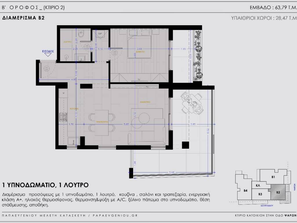 Τετραώροφη πολυκατοικία επί πιλοτής στη συμβολή των οδών Ψαρών και Θουκυδίδου στη Καλαμάτα. Περιγραφή οικοπέδου: Μοναδικό οικόπεδο τριών όψεων με κύριες όψεις Νότο και Ανατολή που βρίσκεται απέναντι από το πάρκο του ΟΣΕ με ανεμπόδιστη θέα και δίπλα στο λιμάνι της πόλης. Η κεντρική πλατεία της Καλαμάτας βρίσκεται σε απόσταση μικρότερη του 1 χλμ. Περιγραφή κτιρίου: Τετραώροφη πολυκατοικία με θέσεις στάθμευσης στην πιλοτή (και στεγασμένες θέσεις στον ακάλυπτο χώρο του οικοπέδου) και υπόγειο με αποθήκες που αντιστοιχούν στα διαμερίσματα. Ειδικά τεχνικά χαρακτηριστικά • Φέρων οργανισμός από οπλισμένο σκυρόδεμα ποιότητας C 30-37 και σιδηρό οπλισμό Β500C. • Κτίριο ενεργειακού σχεδιασμού της υψηλότερης ενεργειακής κλάσης Α+. Επένδυση όψεων με θερμοπρόσοψη, αντλίες θερμότητας για ψύξη/θέρμανση, ενεργειακά κουφώματα, ηλιακοί συλλέκτες για ΖΝΧ και φωτοβολταϊκά συστήματα για ενεργειακό συμψηφισμό (σε κάποια από τα μεγάλα διαμερίσματα). • Υψηλή στεγανοποίηση σε όλους τους εξωτερικούς χώρους. • Ηχομόνωση τόσο μεταξύ των ιδιοκτησιών όσο και μεταξύ των ορόφων. • Ανελκυστήρας(MRL) με στάση σε όλους τους ορόφους και στο υπόγειο. Γωνιακό δυάρι διαμέρισμα B' ορόφου (ενός υπνοδωματίου) επιφανείας 63,79 τ.μ. με ανεμπόδιστη θέα στο πάρκο και το Ταύγετο, που συνοδεύεται από μία(1) στεγασμένη θέση στάθμευσης στο ισόγειο και μία(1) αποθήκη (17 τ.μ.) στο υπόγειο. • Αυτόνομο σύστημα θέρμανσης – ψύξης με τοπικές αντλίες θερμότητας (A/C σύστημα Multi). • Ηλιακός συλλέκτης. • Κεντρική είσοδος διαμερίσματος με πόρτα ασφαλείας. • Ξύλινα πατώματα στα Υ/Δ. • Ηλεκτρολογική εγκατάσταση για τοποθέτηση συναγερμού. • Υποδομή για την εγκατάσταση σταθμού φόρτισης ηλεκτρικών αυτοκινήτων στη θέση στάθμευσης. • Εφαρμογές SMART HOME για έλεγχο των κεντρικών ηλεκτρικών συσκευών του διαμερίσματος(κουζίνα, αντλίες θερμότητας, θερμοσίφωνο). Η κατασκευή ξεκίνησε το Μάρτιο του 2026 και η παράδοση προβλέπεται αρχές του 2028. Στο κτίριο υπάρχουν διαθέσιμα διαμερίσματα δυάρια, τριάρια και τεσσάρια. Α' όροφος: 95 τ.μ. , 91 τ.μ. Β' όροφος: 64 τ.μ. Γ΄ όροφος: 121 τ.μ. , 91 τ.μ. Δ' όροφος: 91 τ.μ. Τηλ : 6942768428, 6945899958, 2721026950