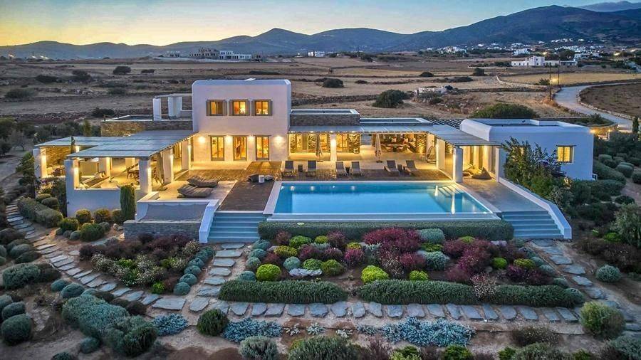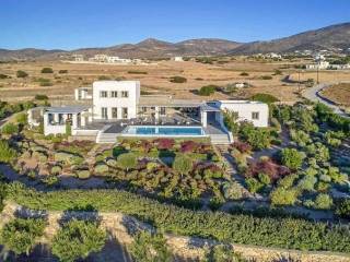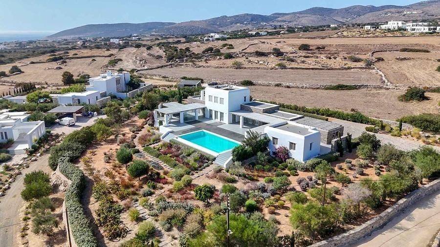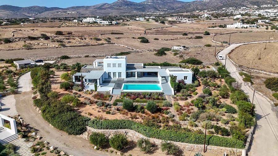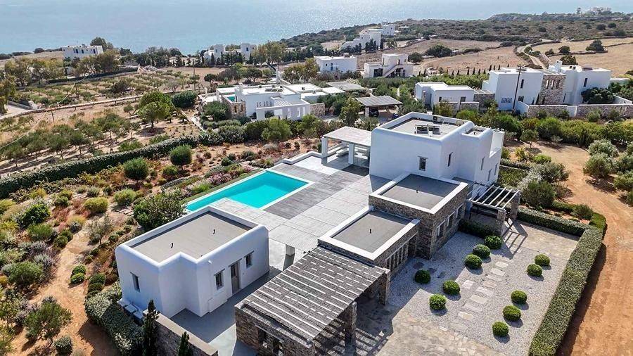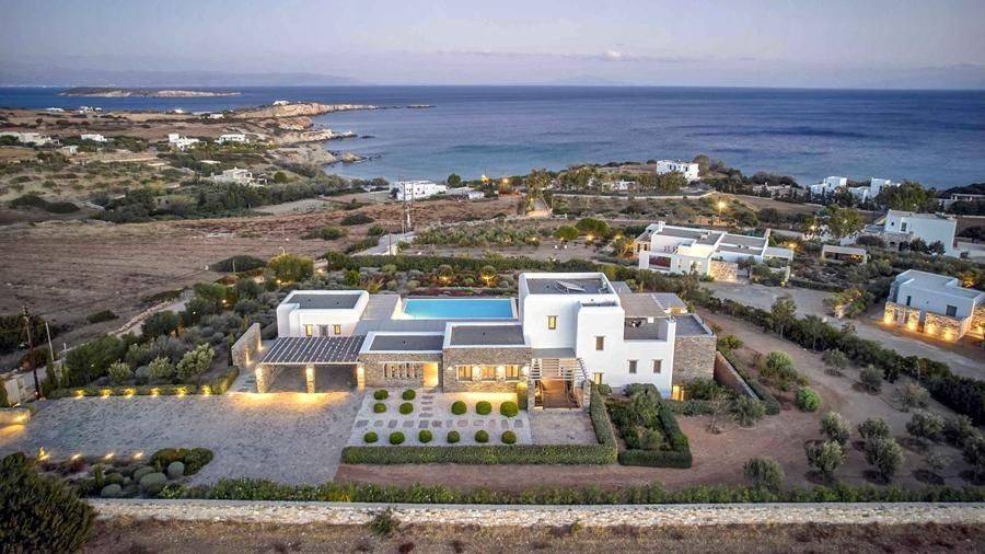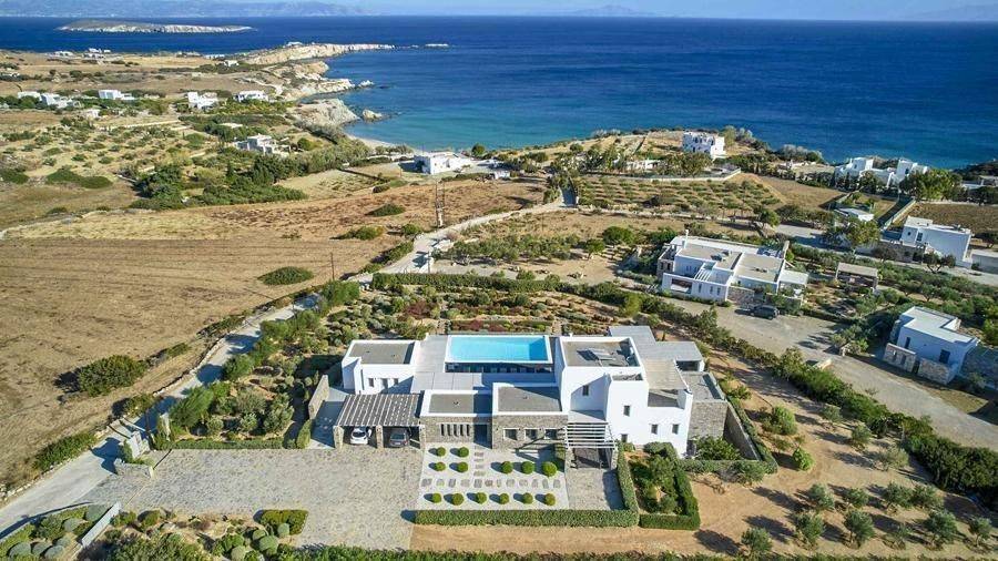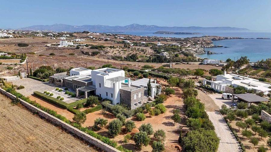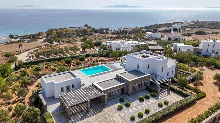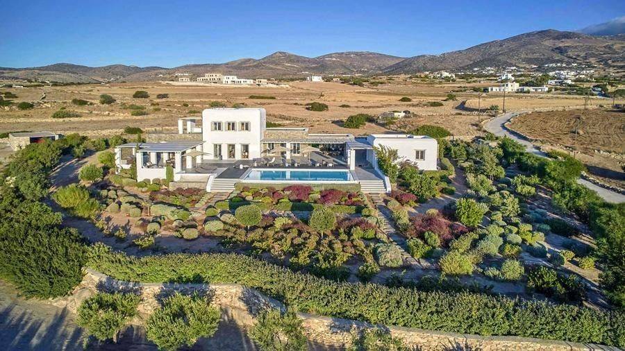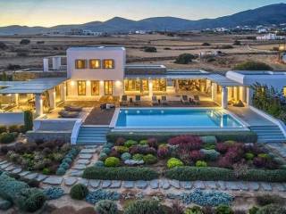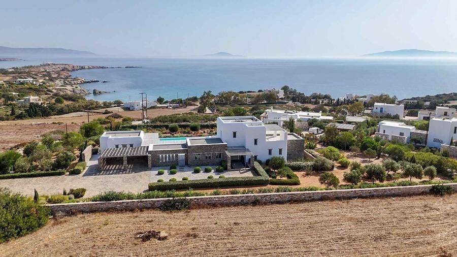 Paros, Lolantonis - Villa 465sqm plot 4000sqm, fully furnished, bedrooms 7, levels 3, excellent condition, energy class D, living room, kitchen, 7 bathrooms, air condition, air condition, parking, quiet, dual aspect apartment, luminous, sea 90 view, painted, storage space, solar heater, fireplace, garden, wooden frames, double glazed windows, without common charges, three phase electricity, secure door, alarm, swimming pool, private pool, internal staircase, barbeque, guest house, internet, residential zone, sea front (1st row), south-eastern orientation, access from asphalt.