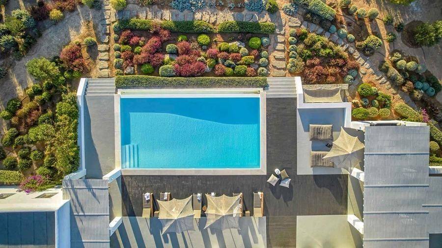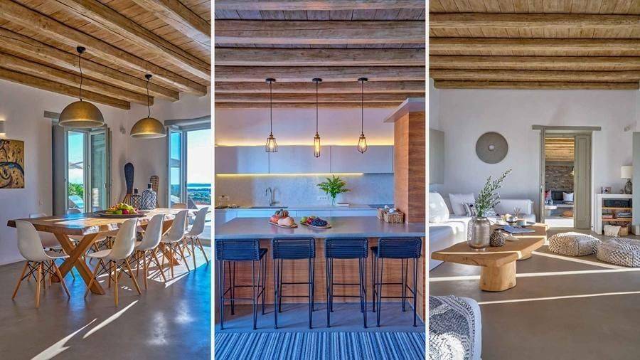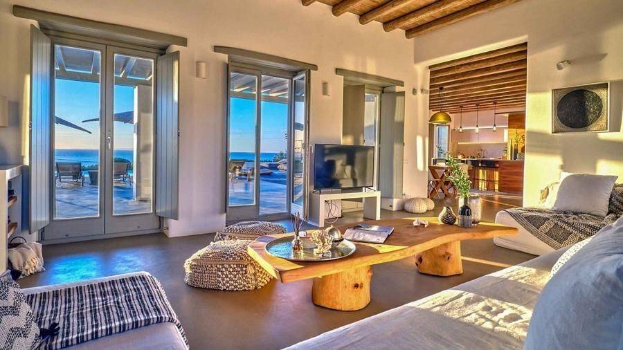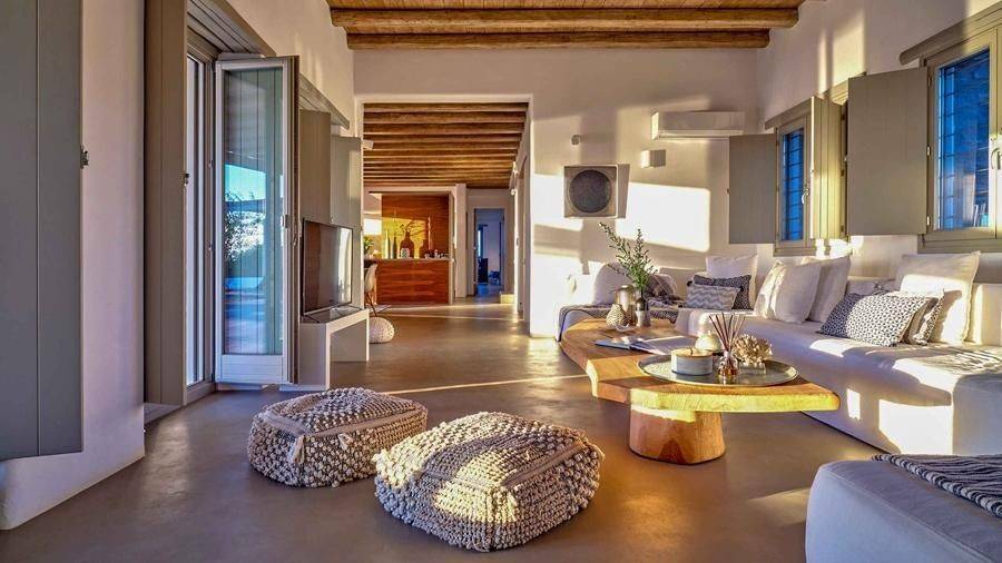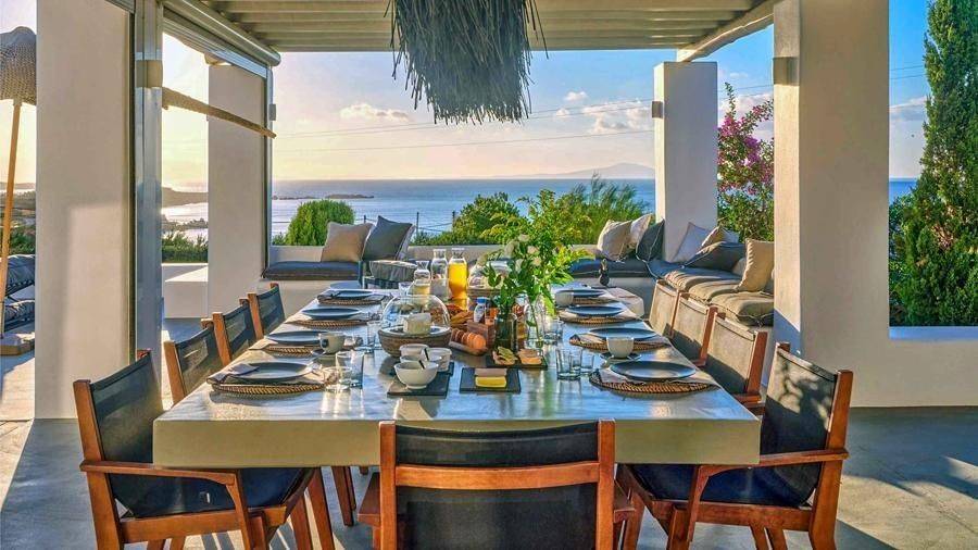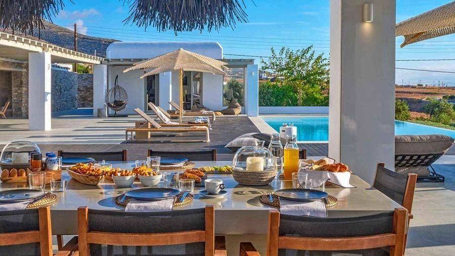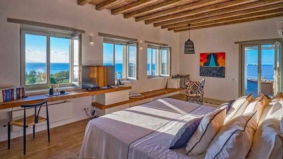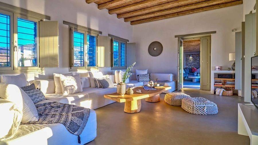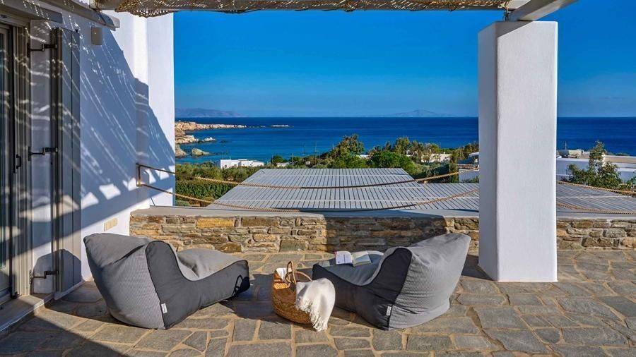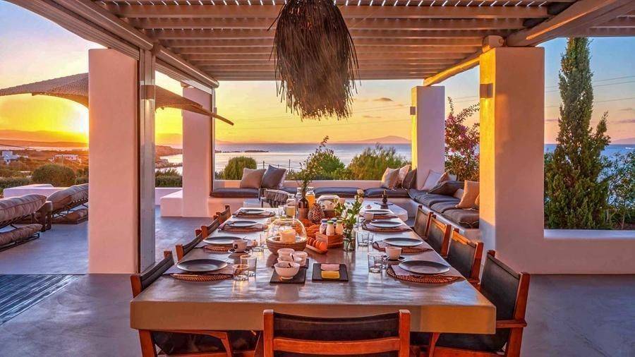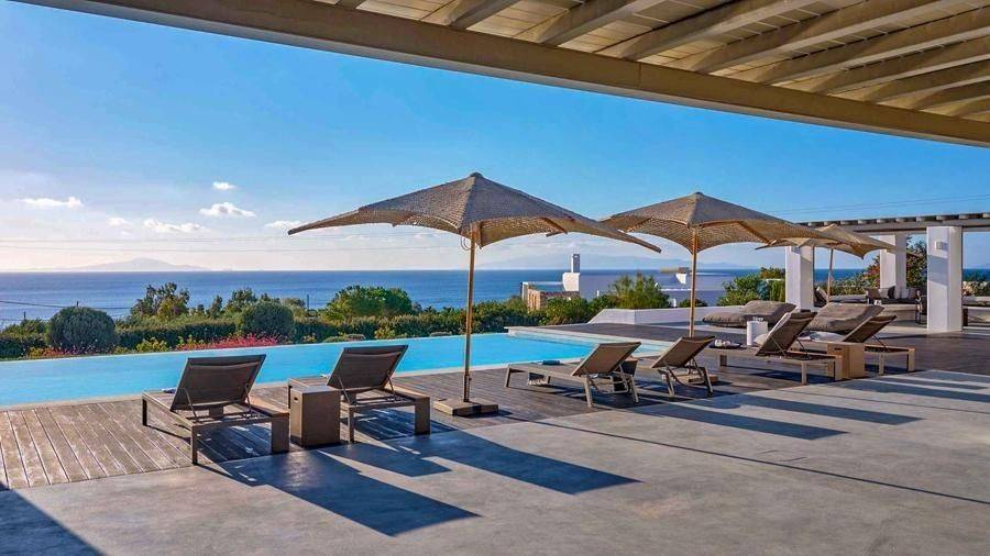 Paros, Lolantonis - Villa 465sqm plot 4000sqm, fully furnished, bedrooms 7, levels 3, excellent condition, energy class D, living room, kitchen, 7 bathrooms, air condition, air condition, parking, quiet, dual aspect apartment, luminous, sea 90 view, painted, storage space, solar heater, fireplace, garden, wooden frames, double glazed windows, without common charges, three phase electricity, secure door, alarm, swimming pool, private pool, internal staircase, barbeque, guest house, internet, residential zone, sea front (1st row), south-eastern orientation, access from asphalt.
