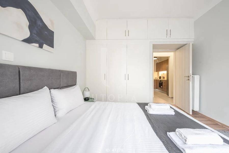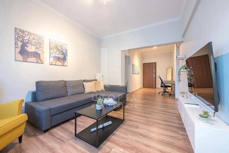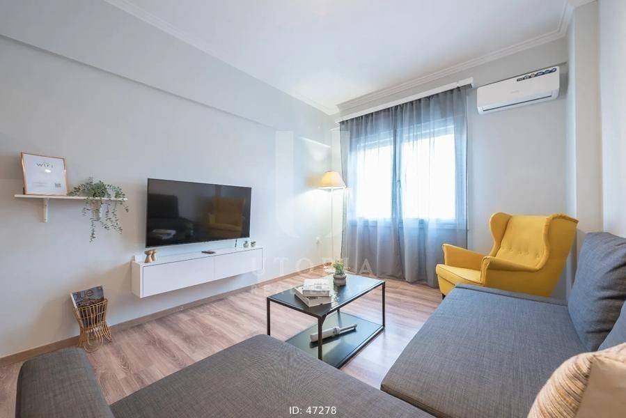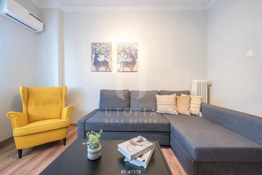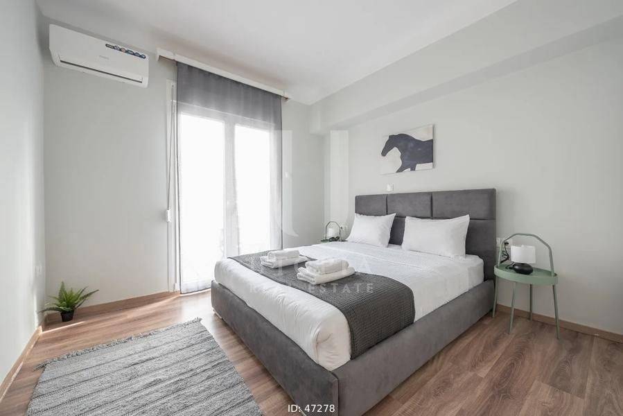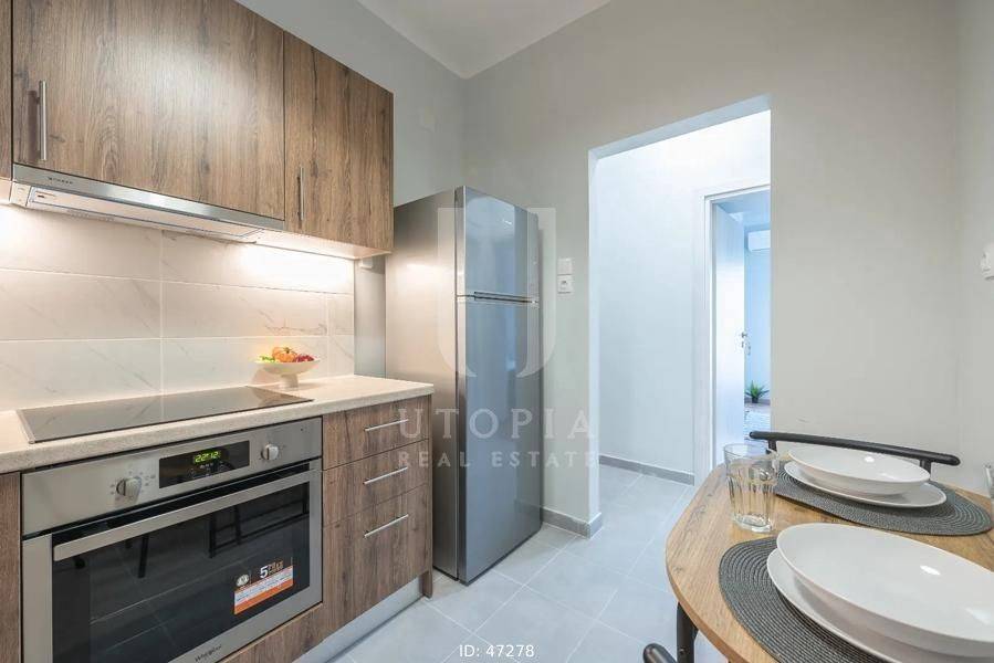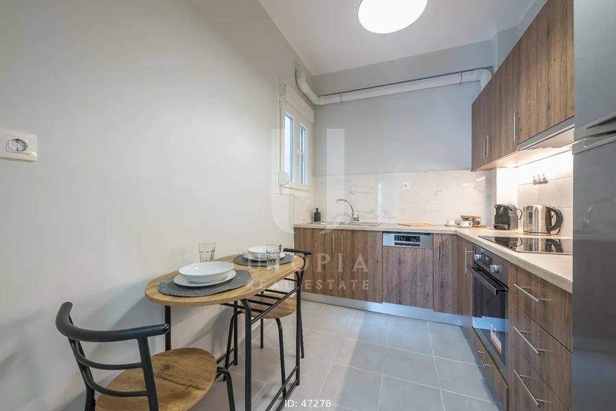 Platia Vathis - Apartment 56sqm fully furnished, bedroom, levels 1, 5th, renovated, year built 1980, renovation year 2025, energy class D, living room, hall, kitchen, bathroom, heating type: no heating, air condition, quiet, dual aspect apartment, luminous, unobstructed view view, frontage, balconies, large balconies, tents, elevator, aluminum frames, double glazed windows, ceramic tiles floors, residential zone, access from asphalt, investment property, special offer, close to market (up to 500m).
