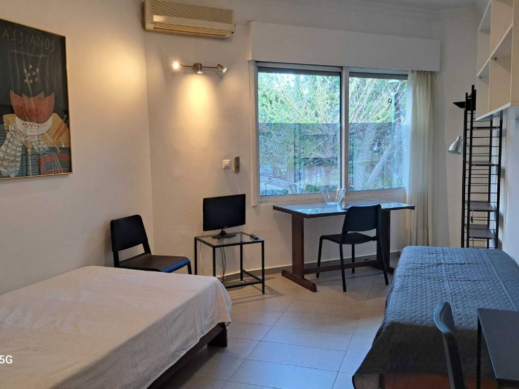 kolonaki - kleomenous & ιrofilou street. fully & recently renovated furnished and equipped bright, quiet and pleasant one-room 1st floor facade apartment, 31 sq m. with unlimited views of the pine trees of lykabετtus. it has a single space (living-dinning-office room and bedroom) with built-in large double wardrobe, equipped separate kitchen and full bathroom. it is equipped with aluminum frames and electric blinds, double glazing windows, security door and air conditioning. the electrical appliances include an electric stove with oven and ceramic hobs, microwave oven, refrigerator, washing machine, television, iron, etc. the apartment is located 5-7' away on foot from evangelismos metro station, 10' from kolonaki square and 15&#***/*******&from syntagma and the university of athens (ekpa). the apartment is addressed to non-smoking people. pets are not allowed. located in an extremely safe and quiet area with many shops and an open-air market on xenokratous street every friday. available on 1 may 2026