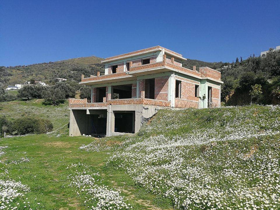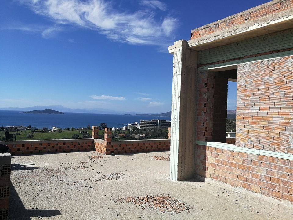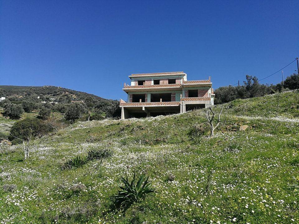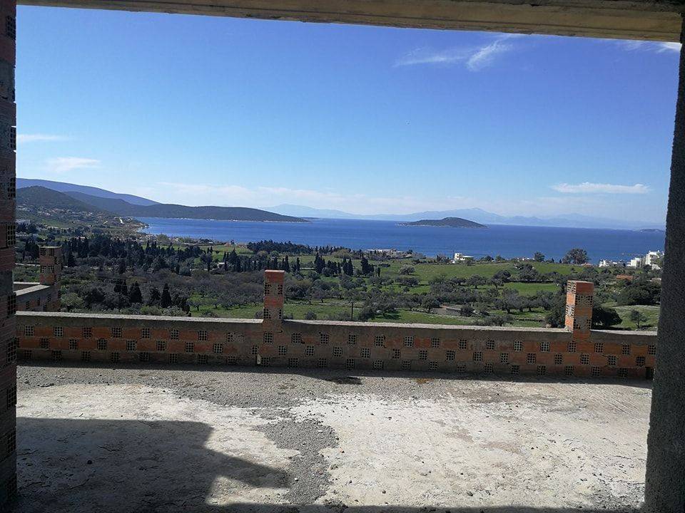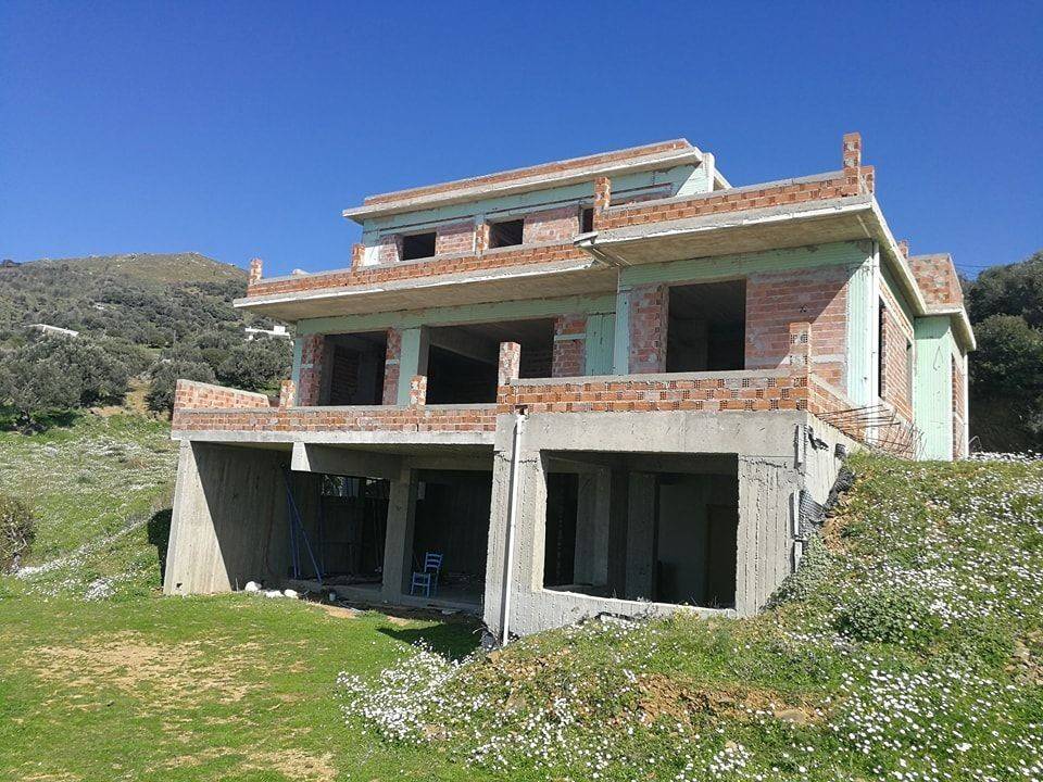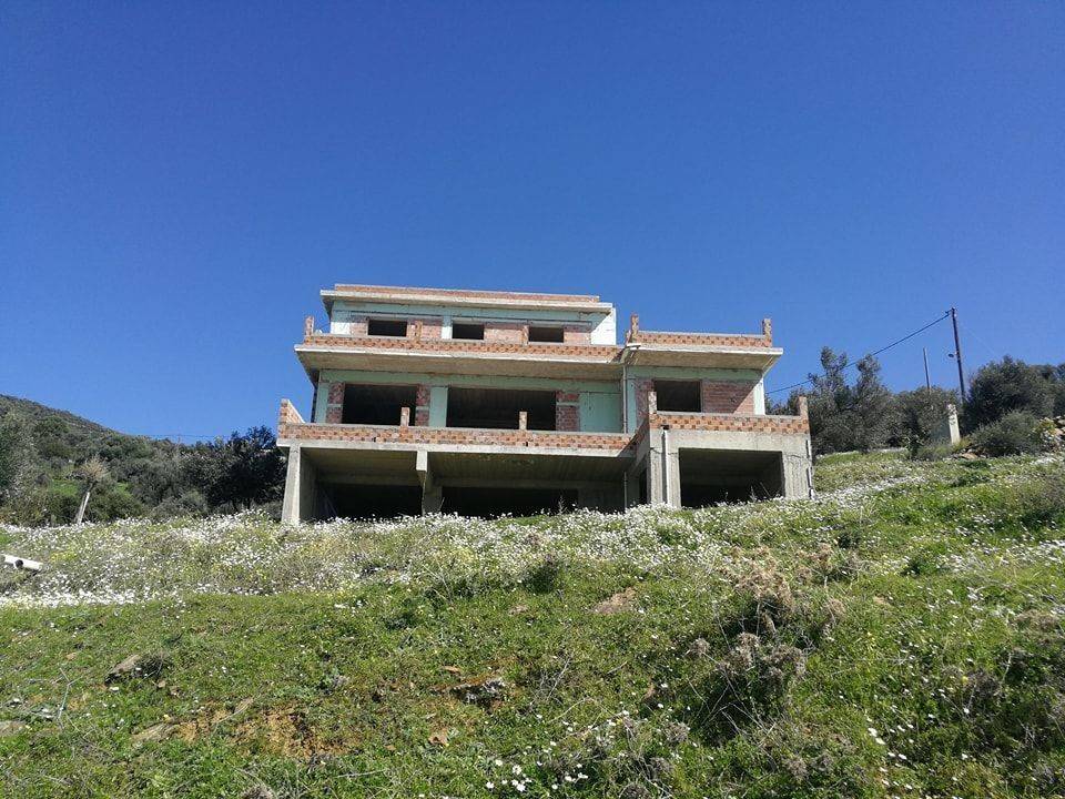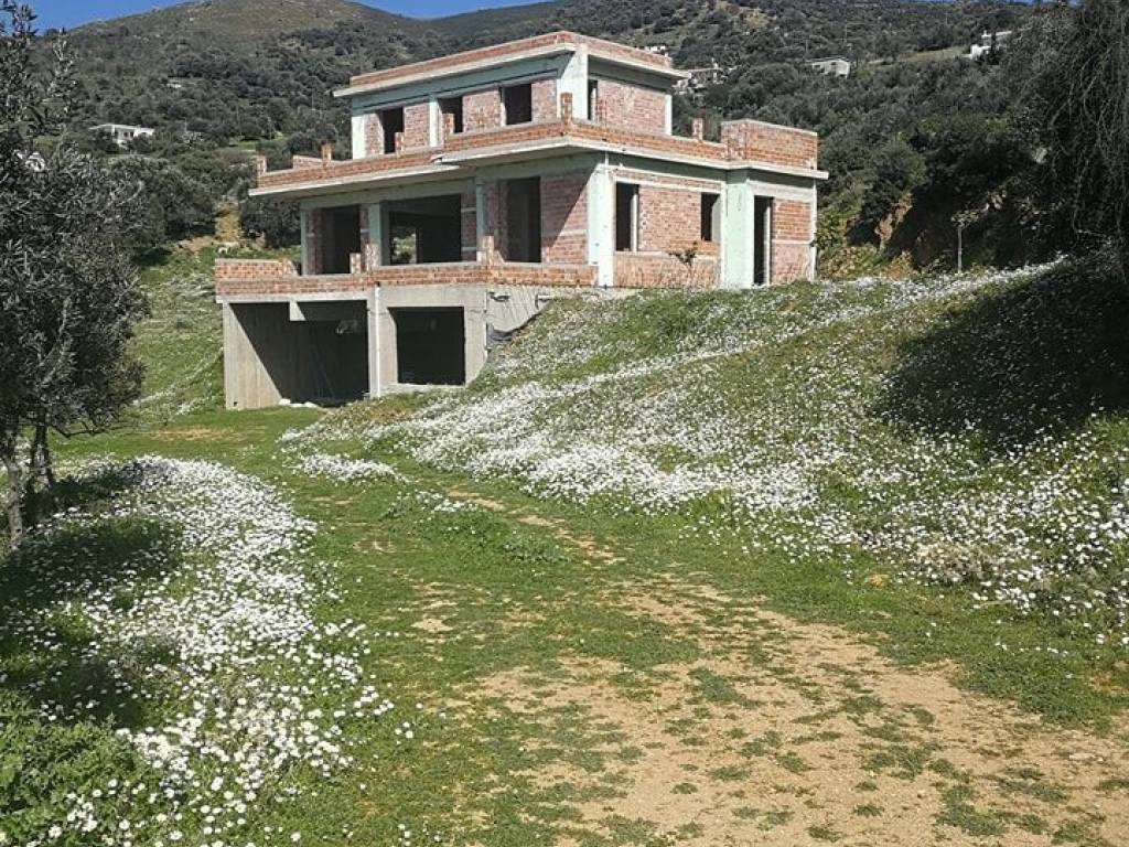 2-level maisonette, 144.60 sq.m (100 sq.m, the 1st floor and 44.60 sq.m the 2nd) and 100 sq.m as auxiliary spaces on the ground floor, unfinished, on a plot of 4 acres with about 50 trees (olive trees, pear trees, orange trees, lemon trees, apricot trees, quince trees, pomegranate trees, fig trees, almond trees, cherry trees, peach trees, tangerine trees), with 4 bedrooms, living room, kitchen, 3 bathrooms, 1 w.c, storage room, terrace, with panoramic sea view , very close to the center of Marmari.