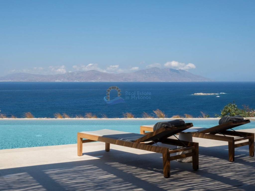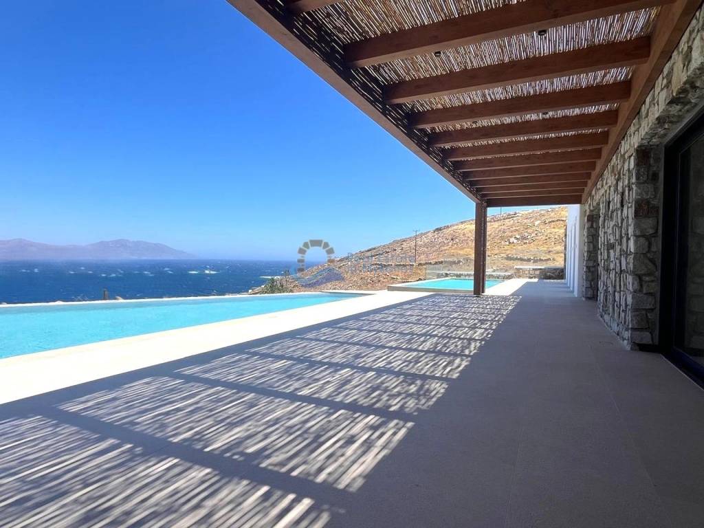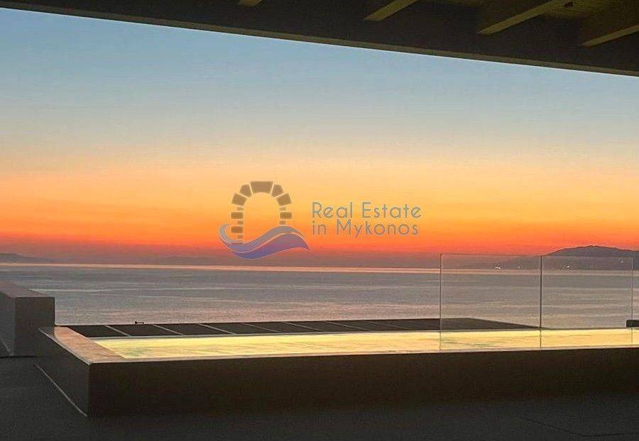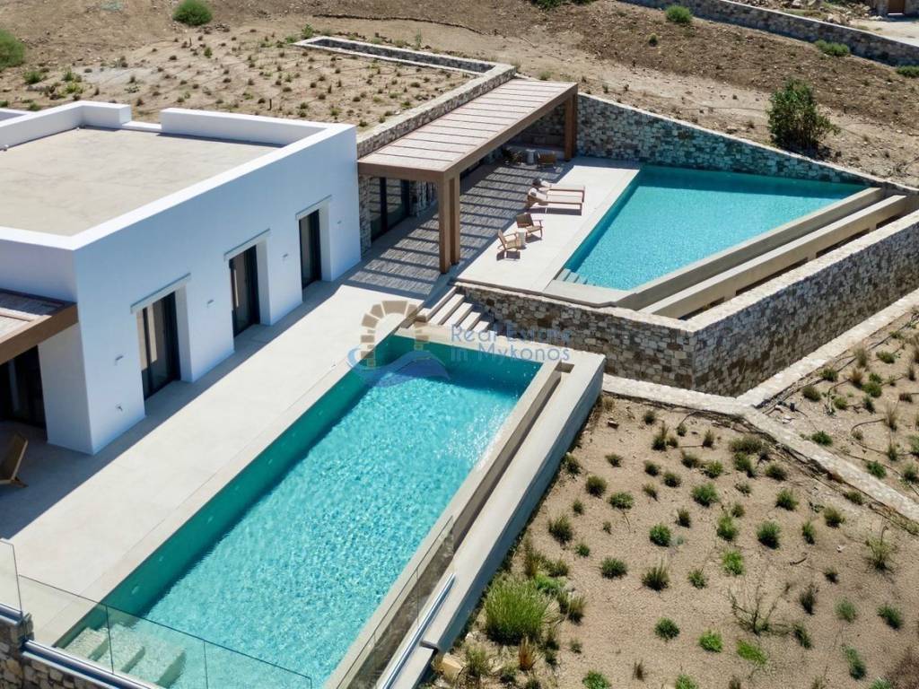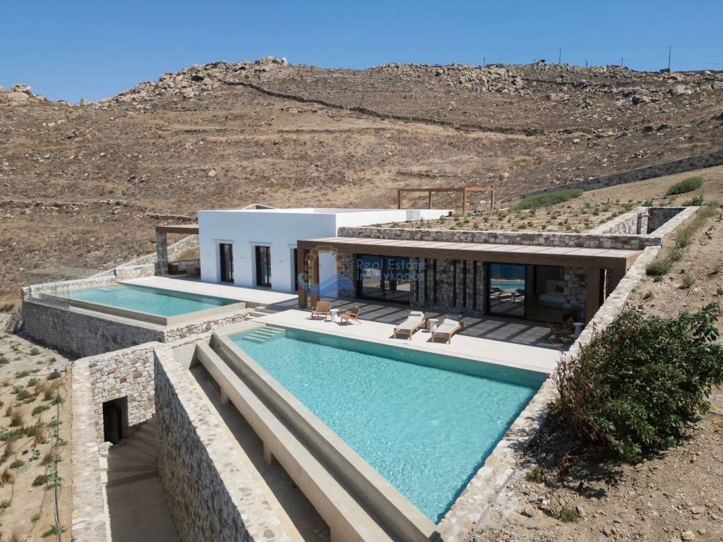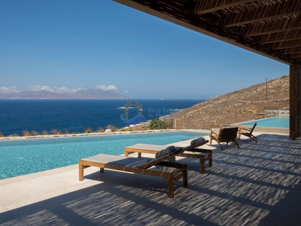 Mykonos, Diakoftis, Pouli. Newly built, souper luxurious villa of 704 sq.m., with unlimited views of the sea, Delos, the sunset and the surrounding islands. On a land of 4.041 sq.m., built on 2 levels, with a total of 2 swimming pools, 8 bedrooms, 8 bathrooms, 2 WC, and many auxiliary spaces. On the main (upper) level, there is a large open space lounge- dining-kitchen, a WC, 2 bedrooms each with bathroom en suite, storage room, large terraces with pergolas, BBQ, a big swimming pool infront of the living room and another pool infront of the bedrooms. On the lower level there are 4 bedrooms each with en suite bathroom and large veranda, gym, laundry, storage, a housekeeper’s room. Contemporary construction of high standards with expensive materials and equipment. With "smart home" technology, air conditioning in all areas and a ventilation system, wooden windows and doors with double glazing. With a very large water tank and biological sewage treatment. In the surrounding area there is a garden and many parking spaces. www.realestateinmykonos.gr, info@realestateinmykonos.gr, +302289027317.