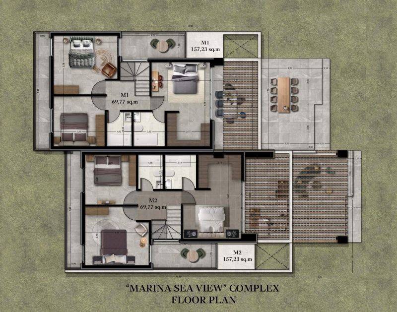 • 2 Διώροφες Κατοικίες 157,23τ.μ, που αποτελούνται από 1 σαλόνι, 1 κουζίνα, 3 υπνοδωμάτια, 1 Master υπνοδωμάτιο και 4 μπάνια.