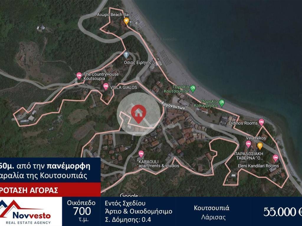 Μία εξαιρετική πρόταση αγοράς σε έναν από τους ομορφότερους οικισμούς του παραλιακού άξονα του Δ. Αγιάς. Απέχοντας μόλις 150μ. από τα κρυστάλλινα νερά του οικισμού, το παρόν οικόπεδο αποτελεί μια ιδανική επιλογή για την εξοχική σας κατοικία. Το οικόπεδο είναι κατάλληλο και για επενδυτική χρήση καθώς είναι Άρτιο & Οικοδομήσιμο με συντελεστή 0.4. Ο οικισμός της Κουτσουπιάς είναι χτισμένος αμφιθεατρικά, πάνω σε πλαγιά του Κισσάβου και δίπλα στη θάλασσα, σε μια κατάφυτη περιοχή. Βρίσκεται ανάμεσα από την Παλιουριά και το Κόκκινο Νερό και απέχει από τη Λάρισα και από τον Αγιόκαμπο 58 και 17 χλμ. αντίστοιχα. Τον οικισμό διαχωρίζουν δύο ρέματα και διακρίνεται από τις πηγές νερού που υπάρχουν. Η παραλία της Κουτσουπιάς είναι γραφική, με ψιλή άμμο και βοτσαλάκι. Για περισσότερες πληροφορίες επικοινωνήστε μαζί μας. Θα χαρούμε να σας εξυπηρετήσουμε. Novvesto Real Estate – Μεσιτικό Γραφείο Οδυσσέας Γραμμένος Τηλέφωνο Επικοινωνίας: 6932 642 227 E-mail: odg@novvesto.gr ◉ Κωδικός ακινήτου: KS-7003 Λίγα Λόγια για τα ευρύτερα παράλια του Δήμου Αγιάς: Εκεί που οι παρυφές του Κισσάβου συναντώνται με τα κρυστάλλινα νερά του Αιγαίου, εκεί ακριβώς θα βρείτε τα μοναδικά σε ομορφιά παράλια του Δήμου Αγιάς, με 26 καθηλωτικές παραλίες. Μια ακτογραμμή μήκους 45 χλμ που ξεκινά από την παραλία του Μύλου Γλυμένη στα όρια με τον νομό Μαγνησίας και φτάνει μέχρι την παραλία Στρίτζου στο Δέλτα Πηνειού. Μικροί κολπίσκοι αλλά και μεγάλες οργανωμένες & ελεύθερες αμμουδερές ακτές περιμένουν κάθε καλοκαίρι τους επισκέπτες τους για να τους αποκαλύψουν τις ομορφιές τους. Υποβρύχιες καταδύσεις σε ναυάγια της περιοχής είναι επίσης εφικτές σε όσους ενδιαφέρονται για μια ματιά κάτω από την επιφάνεια! Η περιοχή εκτός από τον θαλάσσιο θησαυρό της διαθέτει και έναν πλούσιο, καταπράσινο ημιορεινό όγκο που μπορείτε να απολαύσετε μέσα από τα χαραγμένα μονοπάτια της περιοχής: Μονοπάτι Βελίκας – Μελίβοιας, Δάσος Πολυδενδρίου (εξοχικό κτήμα της τέως βασιλικής οικογένειας ) κ.ά. Σημεία θρησκευτικού αλλά και αρχαιολογικού ενδιαφέροντος έρχονται να συμπληρώσουν την μαγεία αυτού του, κατά πολλούς, ευλογημένου τόπου: Μονή Ιωάννου Θεολόγου, Μοναστήρι Αγίων Αναργύρων, Μοναστήρι Αγίου Παντελεήμονος, Κάστρο Βελίκας, Αρχαιολογικός χώρος Κάτω Πολυδενδρίου κ.ά. Στην περιοχή μας δραστηριοποιείται και οργανωμένο γραφείο εξορμήσεων για αυτούς που αναζητούν την περιπέτεια και έχουν διάθεση να συνδυάσουν τις διακοπές τους με τα extreme sports για μια ολοκληρωμένη εμπειρία διακοπών όπως Canoe στο Δέλτα του Πηνειού, Canyoning στο Φαράγγι Καλυψούς, Zodiac Safari στις Σπηλιές Βένετου κ.ά.