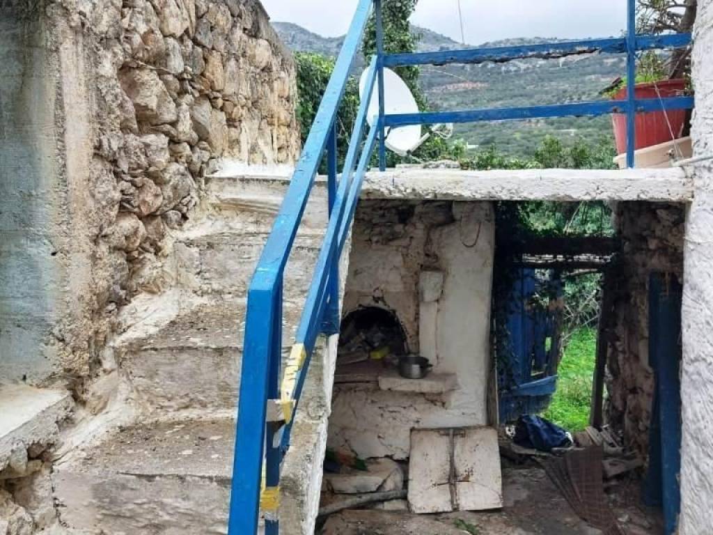 Lapithos, Makry Gialos, East Crete: Stone house on 2 floors with garden in Lapithos, Makry Gialos, East Crete. The property is located on a plot of 160m2. The ground floor is approximately 30m2 consisting of a small kitchen area with fire place and a bedroom. There is a separate entrance to a 20m2 approximately store room as well as a separate entrance to an old bread oven. Next to the bread oven are steps leading to the roof terrace and to an outdoor toilet. The garden has a lemon and orange tree. On the second level of the ground floor which is approximately 65m2, there is an open plan kitchen with living area and fire place, three rooms and a courtyard. It enjoys nice mountain views. There is another separate garden about 170m2 with a storage room. The property is in need of modernization. All services are connected. It enjoys views to the beautiful pine trees and mountains. Lastly it is located 7km from the sea.