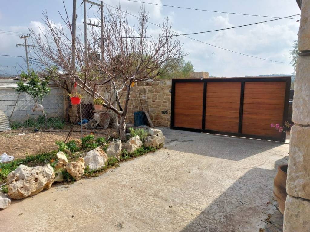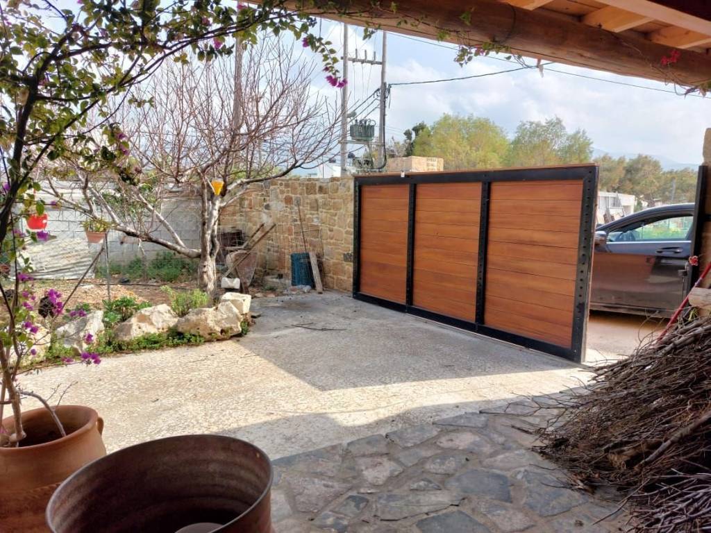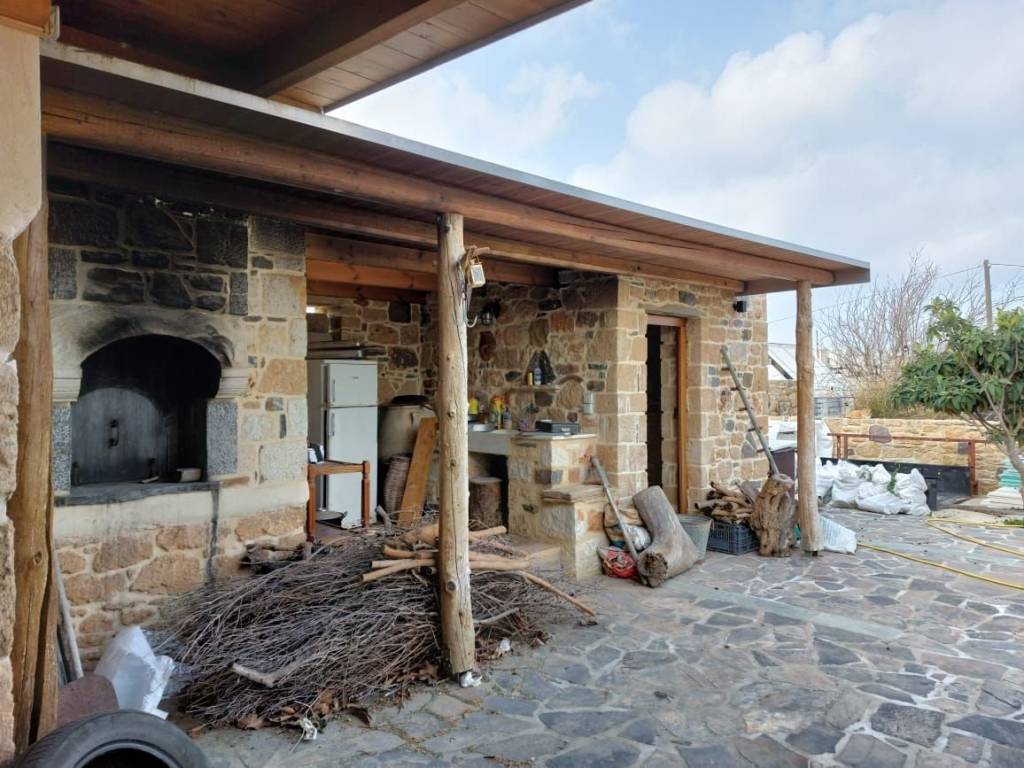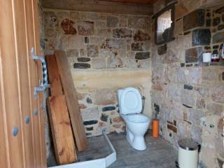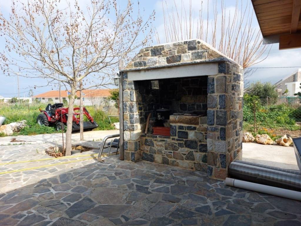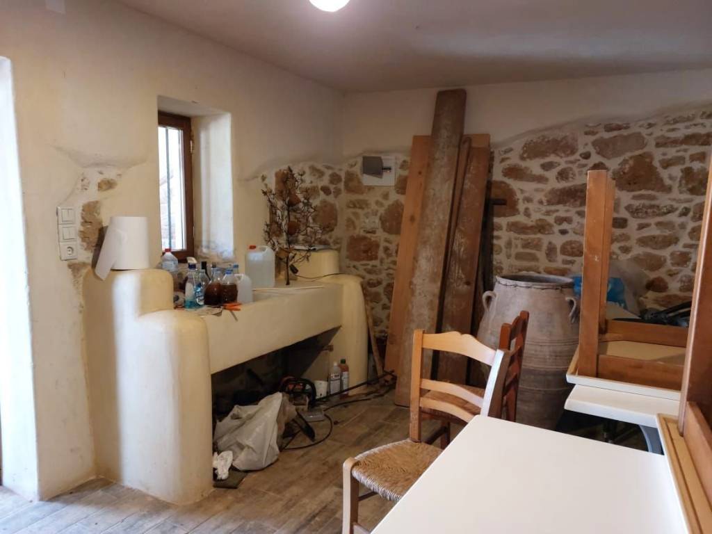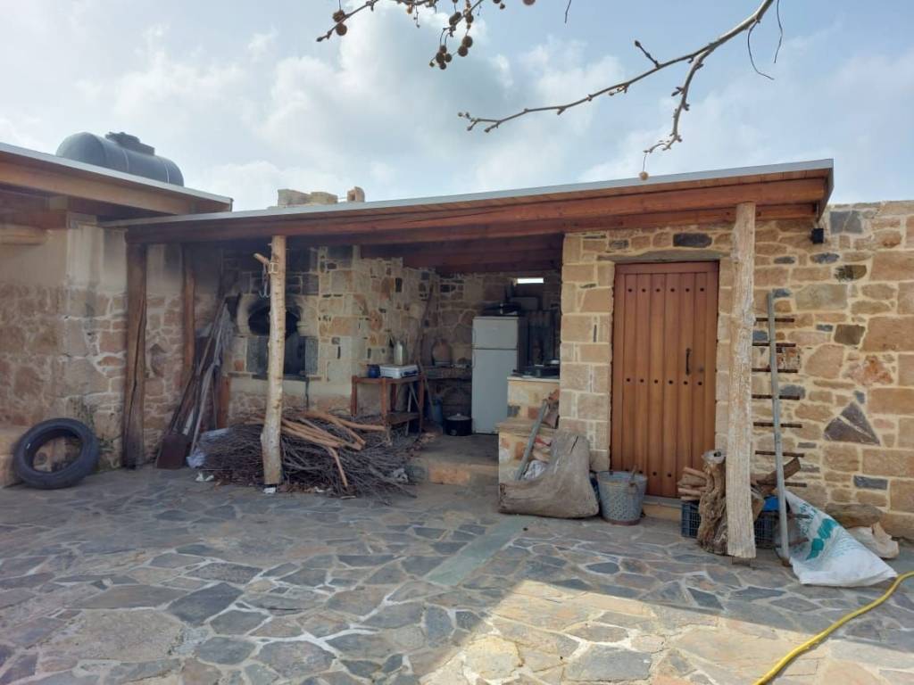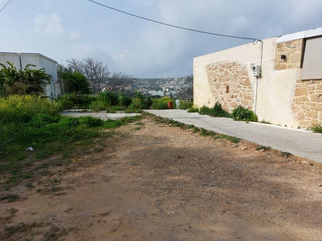 Sitia, East Crete: Stone house with large building plot and views to the sea and mountains. The building plot is 2000m2 with nice flowers, a lemon tree, a traditional stone studio of 25m2 with a separate outdoor bathroom of 6m2. There is an oven, a BBQ and a pergola. All services are connected. There is a building right of 165m2. The property has very good access. It has 650meters from the sea. Lastly, it enjoys views to the sea, mountains and the town.