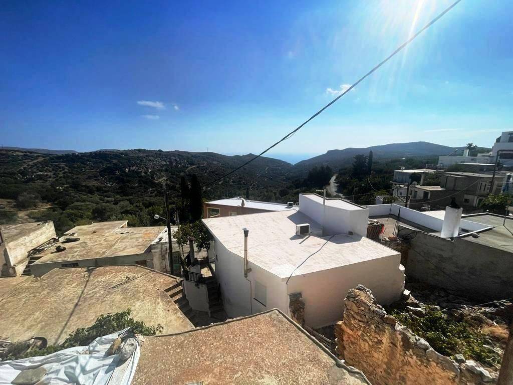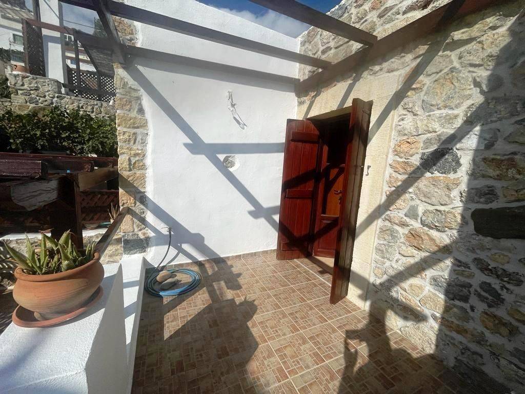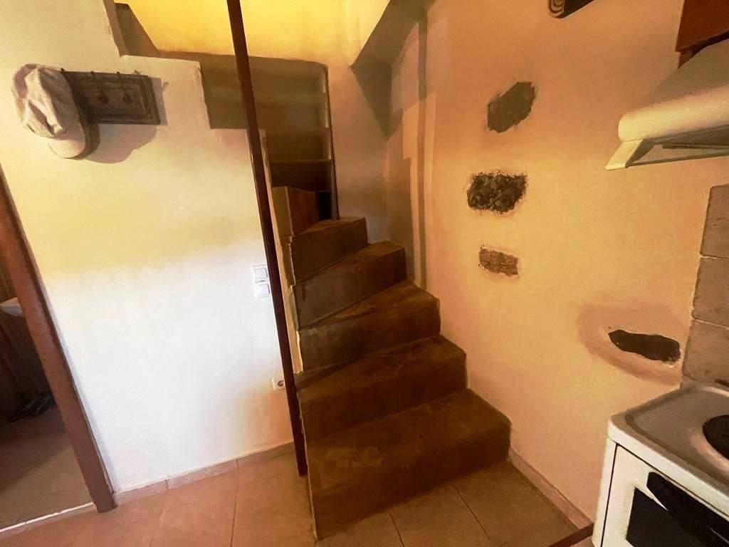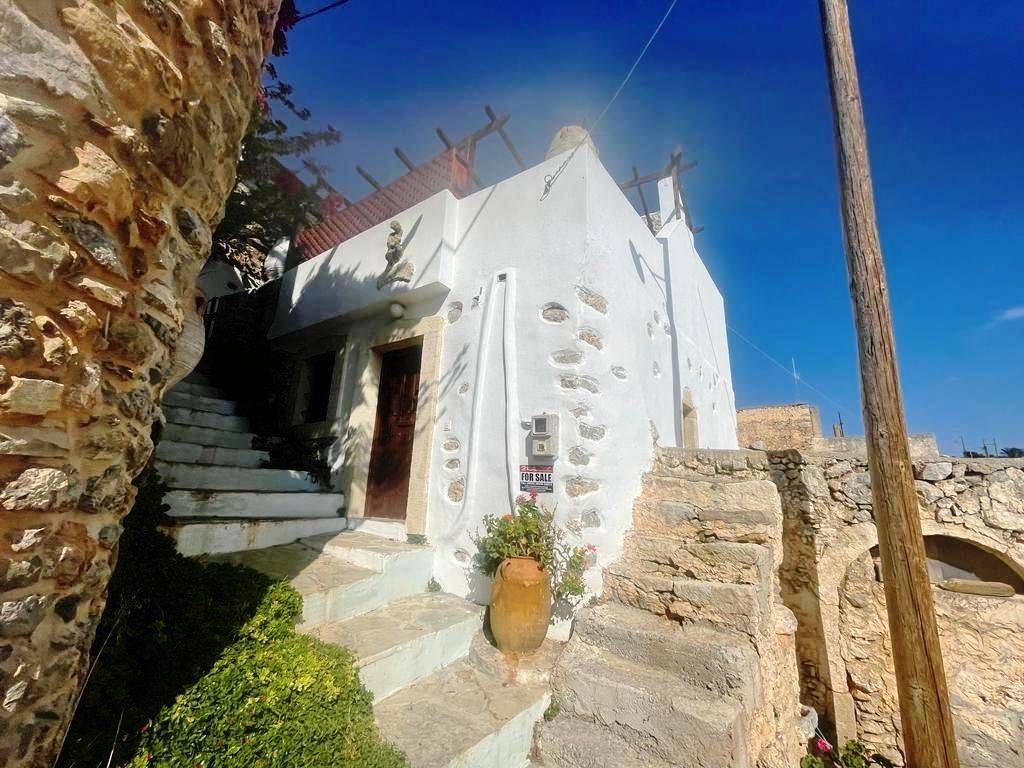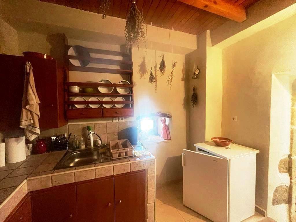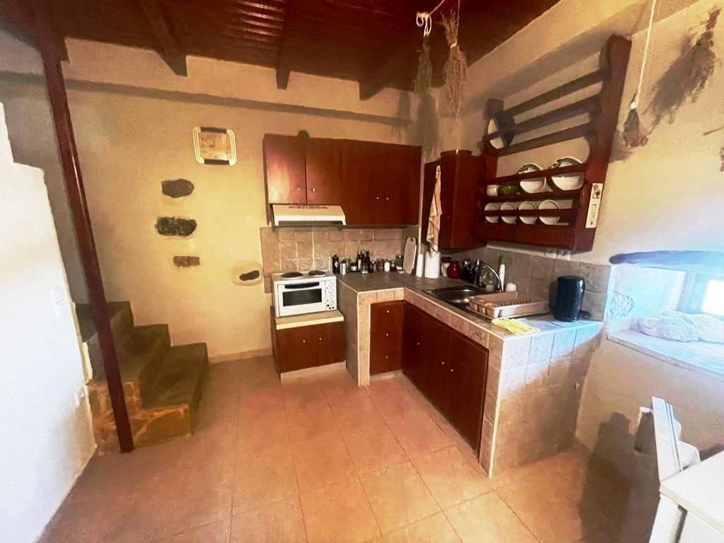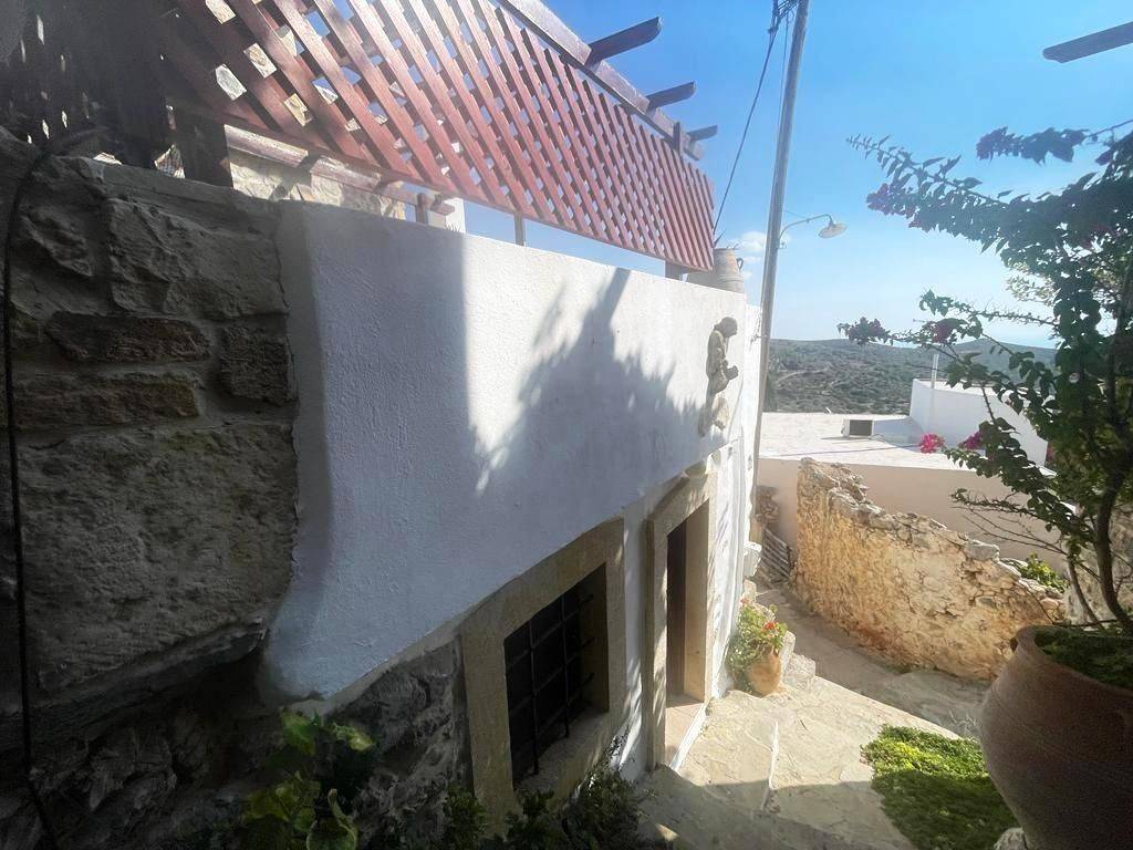 Pefki, Makry Gialos, South East Crete: Lovely traditional house of 96.3m2 for sale in Pefki. The property is on two floors. The ground floor is 48.15m2 and consist of 2 open plan rooms, a kitchen, a utility room with sink, a W.C/store room. The upper floor which is 27.25m2 consists of a bedroom and a bathroom. The property also has seat pads for stone seats, a coffee table, a fire place, a fridge, kitchen cabinets and shelves, a microwave, a bed frame with mattress and a patio table. There are also terraces of 20.9m2. Lastly, the location of the property enjoys beautiful mountain and sea views.