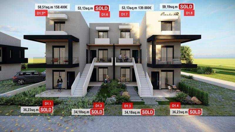 • 12 ground floor apartments ranging from 34.18 sq.m to 36.23 sq.m, comprising a living room with kitchen, 1 bedroom, and 1 bathroom.