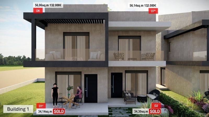 • 5 ground floor apartments from 33,82 sq.m to 34,18sqm, consisting of living room with a kitchen, 1 bedroom and 1 bathroom.