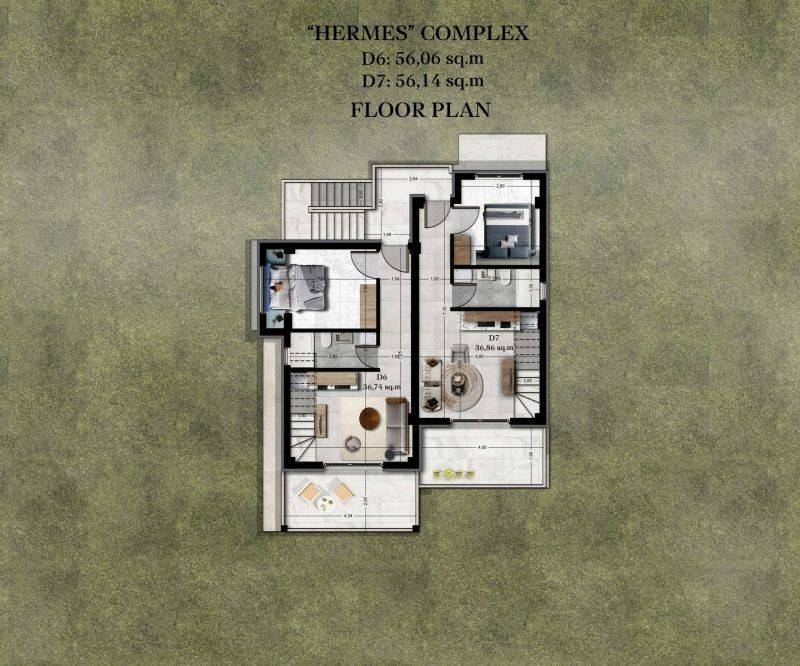• 2 two-storey residences of 57,86 sq.m, consisting of a living room with a kitchen, 1 bedroom and 2 bathrooms.