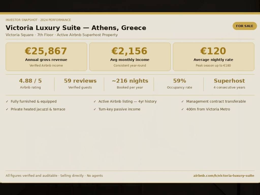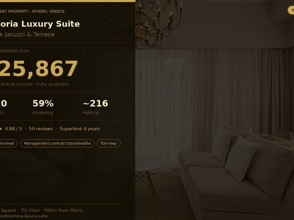 **Property Overview A rare opportunity to acquire a meticulously renovated luxury apartment in the heart of Athens, listed on Airbnb with an outstanding 4-year track record and verified annual revenue of €25,867. Redesigned by an interior designer, this property is located on the 5th floor of a residential building in Victoria Square — just 400 metres from Victoria metro station and 20 minutes on foot from Athens city centre. Every detail has been curated to perfection, from the quartz countertop kitchen to the marble-clad bathroom with underfloor heating. **Key Property Details - Location: Victoria Square, Athens — 400m from Victoria Metro Station - Floor: 5th floor (elevator access) - Configuration: 1 bedroom + sofa bed in living room - Capacity: Up to 4 guests · 3 beds · 1 bathroom - Interior designer renovation — premium finishes throughout - Marble & quartz surfaces, underfloor heating in bathroom - 4K Flat TV + electric fireplace set on marble feature wall - Designer chandelier lighting — statement piece in living room - Fully equipped kitchen: induction hob, dishwasher, washing machine, espresso machine - Self check-in via lockbox — fully autonomous operation - Supermarket 350m away (3-minute walk) - Parking available nearby (multi-level car park + free street parking) **The Crown Jewel — Private Jacuzzi & Rooftop Terrace The standout feature is its spectacular private rooftop terrace with a heated jacuzzi — one of the very few properties in the area offering this exclusive amenity. The spacious terrace with ambient lighting and premium outdoor furniture creates an ideal setting for al fresco dining or relaxing under the Mediterranean sun. This feature consistently drives higher booking rates and premium nightly prices, and is the most praised element in all guest reviews. **Financial Performance — Verified Figures 2025 -> Annual Airbnb Revenue: €25,867 -> Average Monthly Income: €2,156 -> Average Nightly Rate: €120 / night -> Peak Season (Jun–Sep): up to €180 / night -> Estimated Booked Nights/Year: ~216 nights -> Occupancy Rate: ~59% -> Airbnb Rating: ★ 4.88 / 5 -> Number of Reviews: 59 verified reviews -> Host Status: Superhost — 4 consecutive years All revenue figures are real and fully verifiable directly through the Airbnb account. No projections — actual results. **What Is Included in the Sale - Fully furnished and equipped apartment — ready to operate from day one - Private heated jacuzzi + fully furnished rooftop terrace with outdoor furniture - All appliances: espresso machine, induction hob, dishwasher, washing machine - 4K Smart TV, electric fireplace, designer chandelier, all linen and towels - Active Airbnb listing with 4-year history, 59 reviews and Superhost status - Property management contract can be fully transferred to the new owner - Lockbox self check-in system — fully operational The property management contract can be transferred to the new owner, guaranteeing uninterrupted rental income from day one — with zero operational hassle. **What Guests Are Saying With a rating of 4.88/5 across 59 verified reviews, guests consistently highlight: * The private jacuzzi and terrace — mentioned in virtually every review as the highlight * Immaculate cleanliness and premium-quality finishes * Excellent location — fast metro access and proximity to the city centre * Seamless, responsive communication and hospitality * Exceptional value — frequently described as a 5-star hotel experience **Why This Is a Smart Investment Athens is one of Europe's fastest-growing tourist destinations. Properties with a private jacuzzi and terrace command premium nightly rates and consistently high occupancy. This property comes fully loaded: an active listing, an established reputation, a functioning management system, and proven cash flow. The buyer acquires a turnkey passive income asset — not a project to build from scratch. Contact Full financial data and virtual tour available upon request. Τηλέφωνο: 0030 6934530903 Email: nicusor.rosianu @ gmail.com Airbnb: http://****.**/victoria-luxury-suite