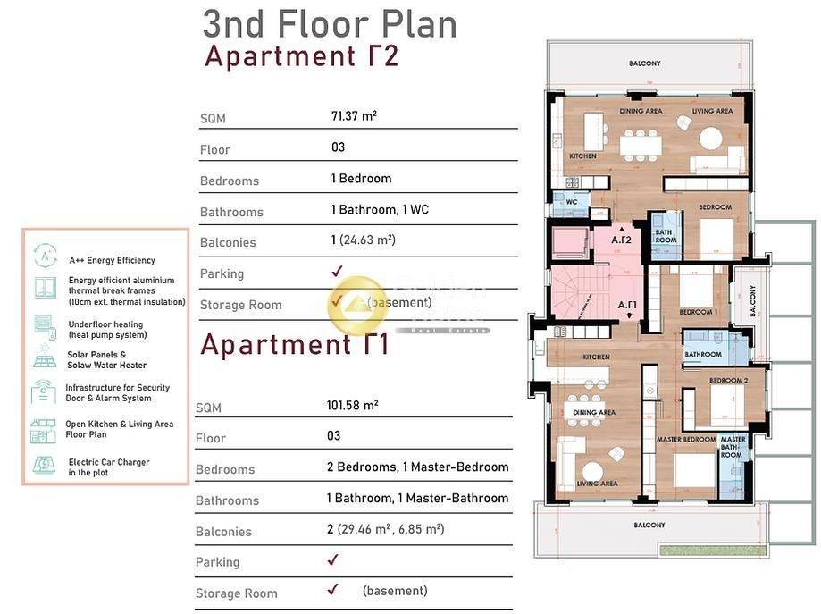 C2 72 sqm Apartment C floor - 1 parking space-storage Apartments of modern and high quality construction. They have 2 bedrooms, bathroom & wc, independent underfloor heating, air conditioning, natural gas standby, individual heat pump in each apartment, solar, security door, alarm, electric awnings, 1 parking space, warehouse 6-7sqm, east meridian, thermal break, of superior energy class, in an ultra-luxurious building of high standards . For Sale, apartment, Full Bathrooms: 2, Living Area: 72 Sqm, Rooms: 2, Year Built: 2024, Air Conditioning, View, Balcony, Elevator, Garden, Internal Stairs, Secure Door, Solar Water Heating, Storage Space, Garage, Floor Number: 3, Pets Allowed, Bright, Joinery: Aluminium, Floor Type: Wood, Heating Controller: Central, Road Type: Asphalt, Zoning: Residential, Energy Class: Bp, Orientation: Em