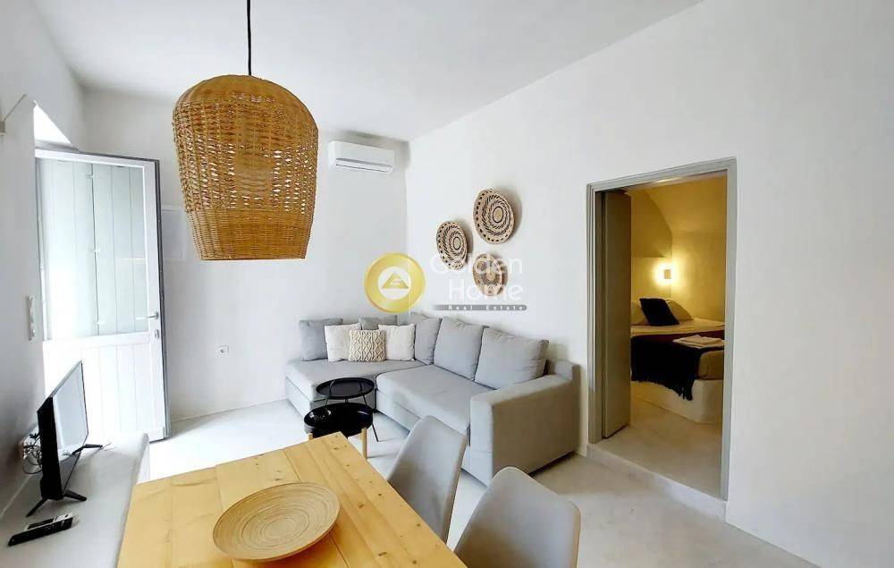 1st floor apartment of 47 sq m fully furnished and equipped for sale in Santorini-Thira, in the area of Karterados, 1 km from the center of Fira (15 minutes on foot), near a bus stop (500 m), outdoor parking (300 m) and a market (500 m), consists of 1 bedroom, 1 fully equipped kitchen, 1 bathroom, 1 living room, 2 aircodition, solar water heater, refrigerator, oven, washing machine and dishwasher, yard/outdoor area, independent external entrance, external staircase. It has been completely renovated in 2018, combining Cycladic architecture with all modern comforts. It has energy-efficient German-style wooden frames with screens, floors and bathrooms with traditional pressed cement mortar, modern electrical and plumbing installations, wardrobes, sofas and beds, lamps and high-quality switches. Suitable for business use, holiday home or investment. For Sale, apartment, Full Bathrooms: 1, Living Area: 47 Sqm, Rooms: 1, Year Built: 1980, Holiday Home, Air Conditioning, View, Balcony, Furnished, Solar Water Heating, Floor Number: 1, For Commercial Use, Facade, Pets Allowed, Renovated, Awning, Airy, Bright, Kitchens: 1, Joinery: Wooden, Levels: 1, Heating Controller: Autonomous, Heating Medium: Current, Road Type: Pedestrian, Zoning: Residential, Energy Class: Under_issuance, Renovation Year: 2018