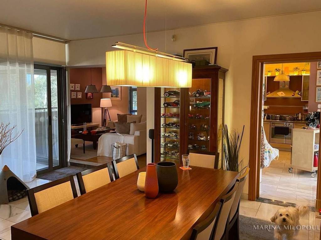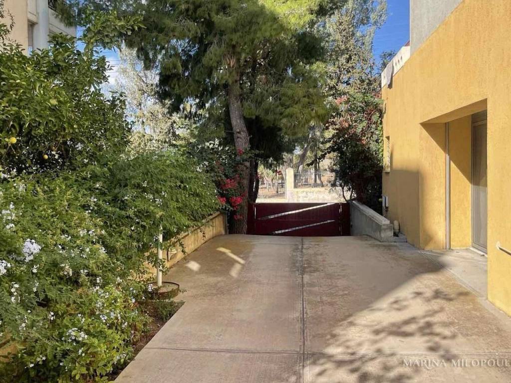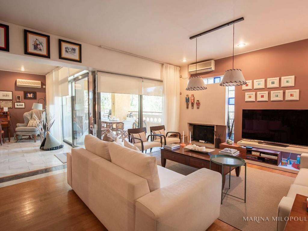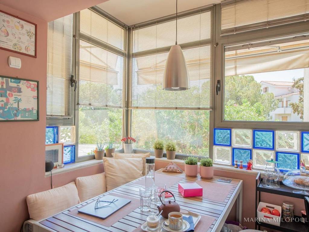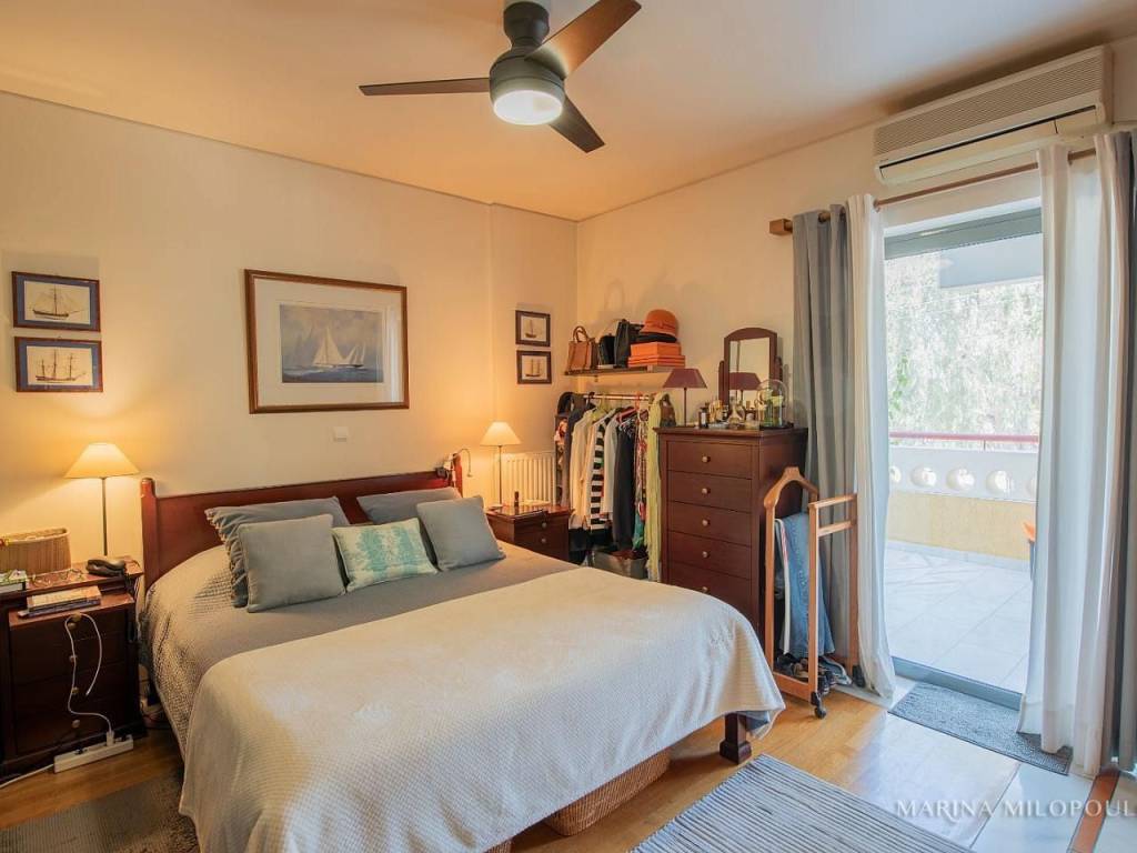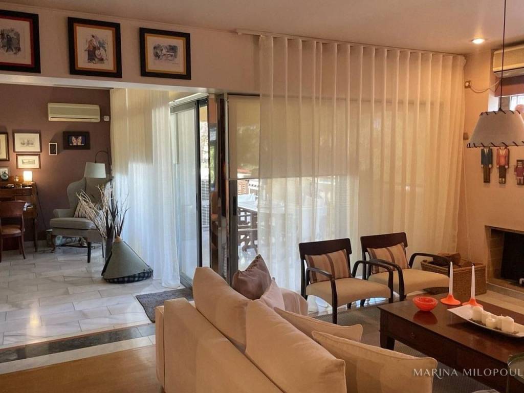 VOULA, 600m from the sea, a 1st floor apartment, 147 sqm with ground floor studio (35 sqm), total area 182 sq m. - 1st floor, reception-dining area, separate kitchen with small living room, 2 bedrooms (1 master), 1 additional bathroom, 1 office space, large front veranda. - The ground floor studio of 35 sq m, consists of an open-plan living room with kitchenette, 1 bedroom and 1 bathroom. It is accessed via an internal staircase, but can also function independently as a guest house or office, thanks to its private entrance and direct access to a secluded part of the garden, where two covered parking spaces are located. The apartment features a security door, double glazing, screens, autonomous oil heating, solar water heater, fireplace, 5 A/Cs, oak floors in the bedrooms and marble in the rest of the rooms, alarm, built-in electrical appliances, large verandas, 8sqm storage room, 2 outdoor parking spaces with open horizon, green view and north orientation. The apartment is located on a light traffic street, within walking distance of the organized beach of Voula, 500m from a local market, 950m from a sandy public beach, 1.2 km from the center of Voula, 2.5 km from the shopping area of Glyfada, 6 km from the Hellinikon Metropolitan Park and 22km from Athens airport.