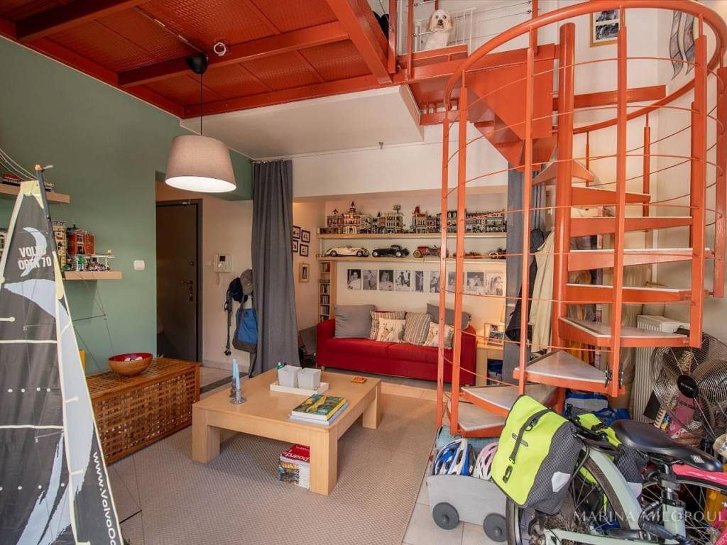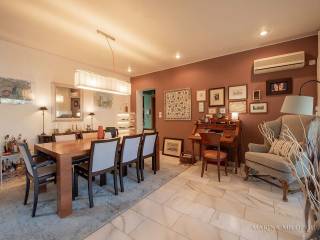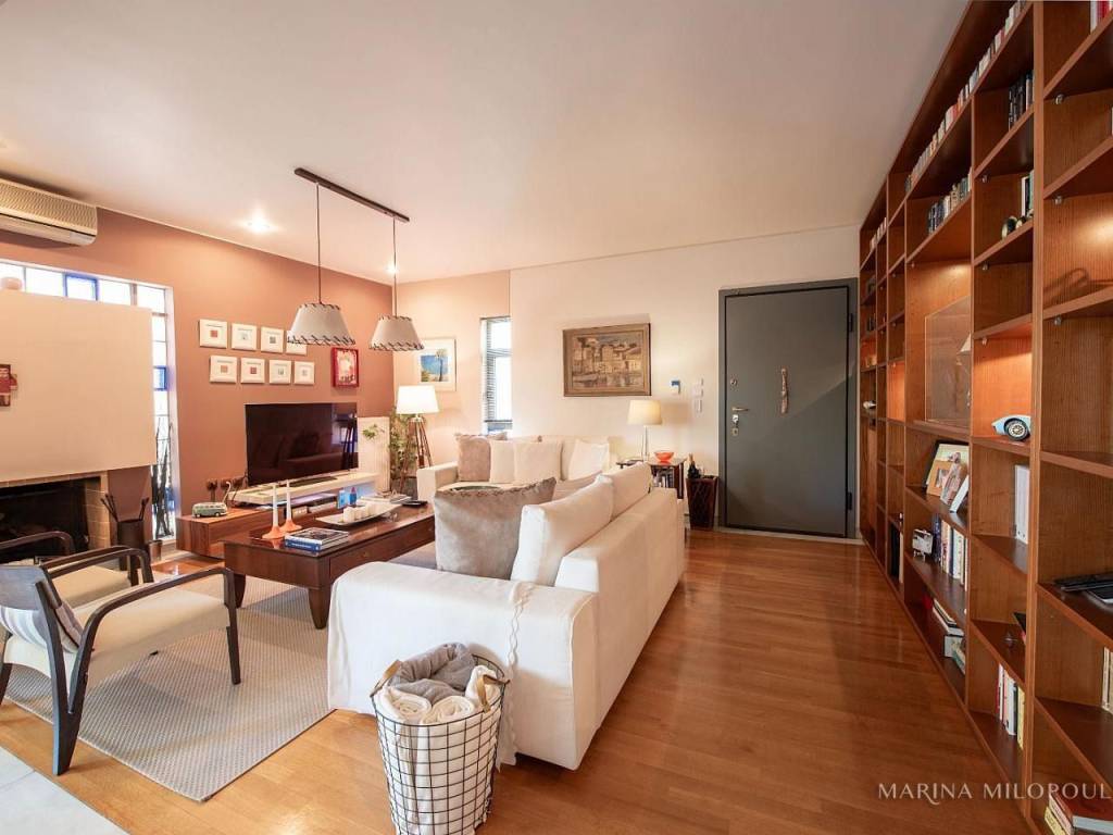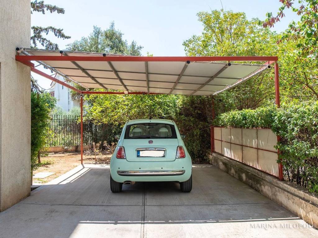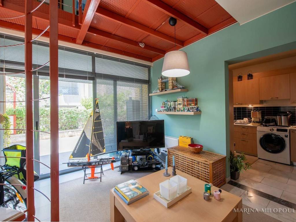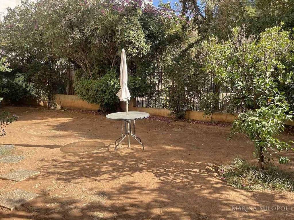VOULA, 600m from the sea, a 1st floor apartment, 147 sqm with ground floor studio (35 sqm), total area 182 sq m. - 1st floor, reception-dining area, separate kitchen with small living room, 2 bedrooms (1 master), 1 additional bathroom, 1 office space, large front veranda. - The ground floor studio of 35 sq m, consists of an open-plan living room with kitchenette, 1 bedroom and 1 bathroom. It is accessed via an internal staircase, but can also function independently as a guest house or office, thanks to its private entrance and direct access to a secluded part of the garden, where two covered parking spaces are located. The apartment features a security door, double glazing, screens, autonomous oil heating, solar water heater, fireplace, 5 A/Cs, oak floors in the bedrooms and marble in the rest of the rooms, alarm, built-in electrical appliances, large verandas, 8sqm storage room, 2 outdoor parking spaces with open horizon, green view and north orientation. The apartment is located on a light traffic street, within walking distance of the organized beach of Voula, 500m from a local market, 950m from a sandy public beach, 1.2 km from the center of Voula, 2.5 km from the shopping area of Glyfada, 6 km from the Hellinikon Metropolitan Park and 22km from Athens airport.