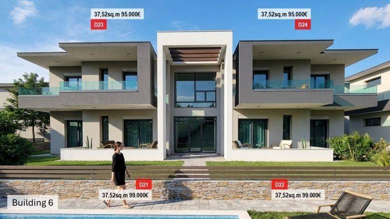 • 12 Διαμερίσματα ορόφου από 36,95τ.μ. έως 37,52τ.μ. που αποτελούνται από σαλοκουζίνα, 1 υπνοδωμάτιο και 1 μπάνιο.