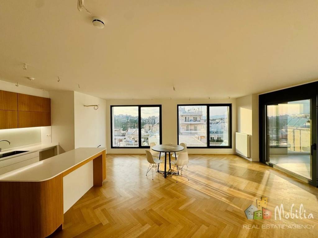 Wonderful newly built apartment of 121,5 m² in the heart of Athens, close to commercial shops, with stunning view of the city, the sunset and the Acropolis! The apartment covers the entire 6th floor, with a spacious 32,1 m² balcony, a total of three bedrooms and a lovely living room area. The apartment has a very special design with large windows overlooking the view of Athens: the living area with its wooden floor and open kitchen will satisfy even the most demanding guests. The kitchen is equipped with high quality electrical appliances, ideal for all needs. There are 3 bedrooms: the master bedroom has its own bathroom and a discreet dressing room area. The apartment has a second bathroom as well as a guest WC. In addition, the apartment offers amenities such as parking, energy efficient triple glazing, electric shutters and smoke detection system, intercom and fire protection for the entire building. The apartment is conveniently located in a quiet street, just a few meters from shops you need for your daily needs, as well as from restaurants, public services, school and kindergarten, the renovated Messolonghi square and the refreshing green park of Pagrati, and about 15 minutes walk from Evaggelismos metro station. Mobilia Real Estate, contact phone: 2107563200, 2107563202, email: info@mobilia.gr, website: www.mobilia.gr