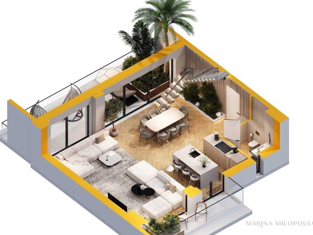 GLYFADA Ano (below Gounari Ave) in a building under construction, a 2nd-3rd maisonette (Loft type), 129 sqm, with west-east orientation. - 2nd, 59 sqm, reception erea (double height) - dining area, open plan kitchen, 1 wc and 2 verandas. - 3rd (Loft), 70 sqm, 3 bedrooms (1 master) and 1 additional bathroom. It is part of a modern 5-storey corner building with a total of 12 properties. It features air conditioning, underfloor heating, thermal break energy windows, hybrid solar panels for hot water, basement parking space and storage. Zone price €2350. It is located very close to a local market, 2.2 km from the Elliniko metro station and the shopping area of Glyfada, 3 km from the beach of Glyfada, 3.5 km from the Ellinikon Metropolitan Park and 26 km from the Intern airport. Estimated delivery 12/2026.