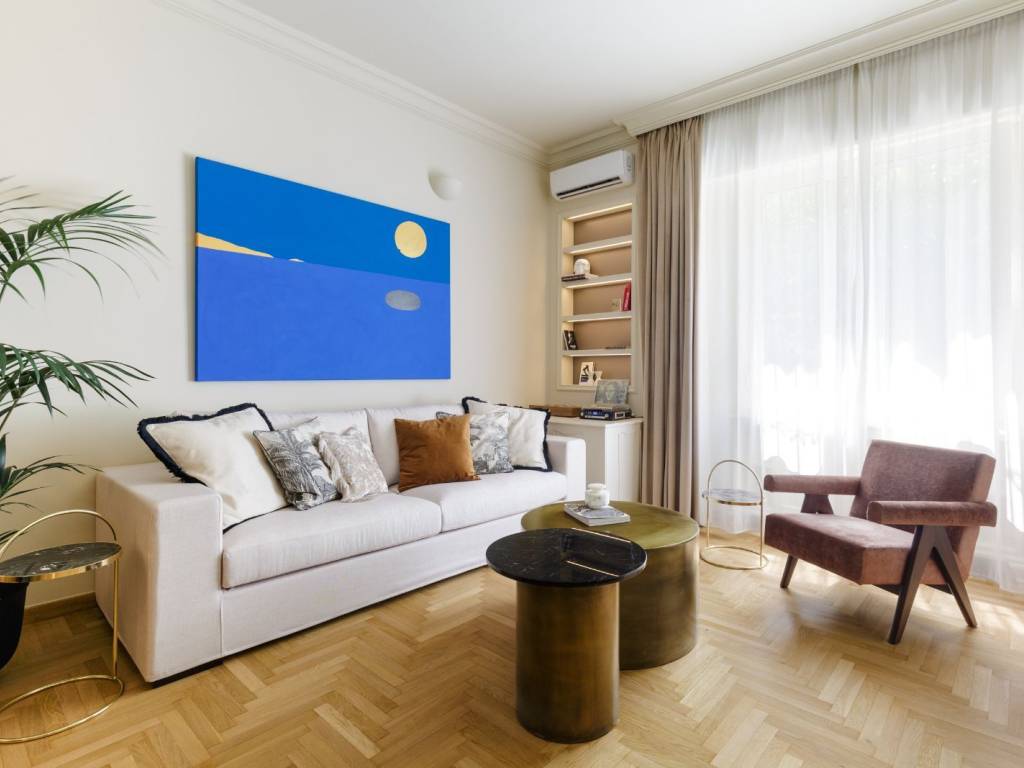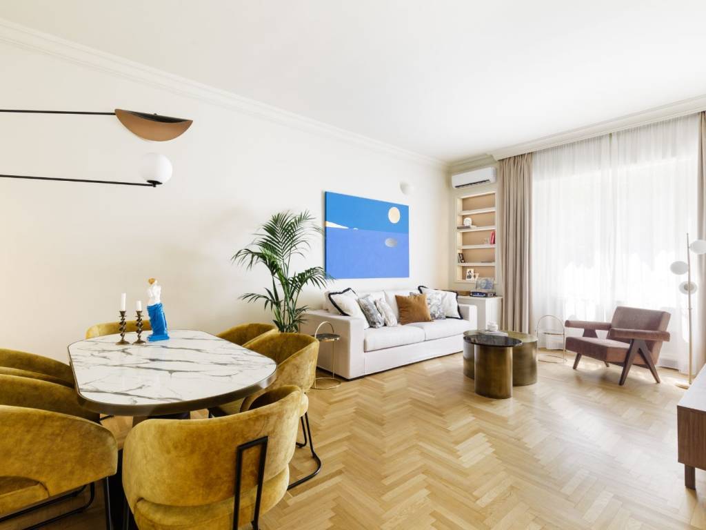Located in a prestigious building of the Royal Palace district, on a quiet street, this high-ceiling 105 m² apartment combines classic elegance with modern luxury. Fully renovated in 2019 with brand new plumbing and electrical systems, energy-efficient and soundproof windows with electric shutters, brand new bathrooms and kitchen, alarm system, A++ Wi-Fi air conditioners, unique interior design and original works of art. Fully furnished with all-new appliances including washer/dryer, dishwasher, microwave, fridge, electric cooker, Nespresso machine and vintage kettle. It offers two bedrooms, two bathrooms and accommodates up to six guests. The living room is spacious with comfortable sofas and a Smart TV, and the apartment is fully insulated against heat, cold and noise. Available for both long-term and short-term rentals, also suitable for commercial use. Price: €2,700per month.Available from 1/4/2026