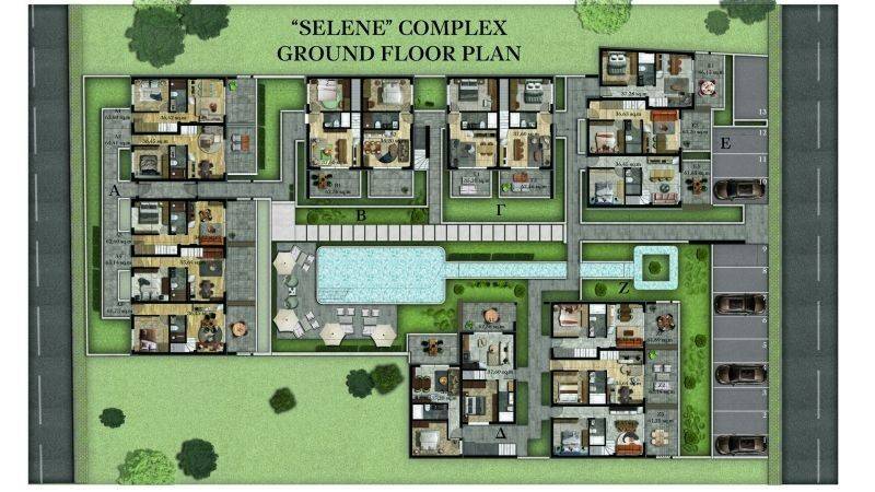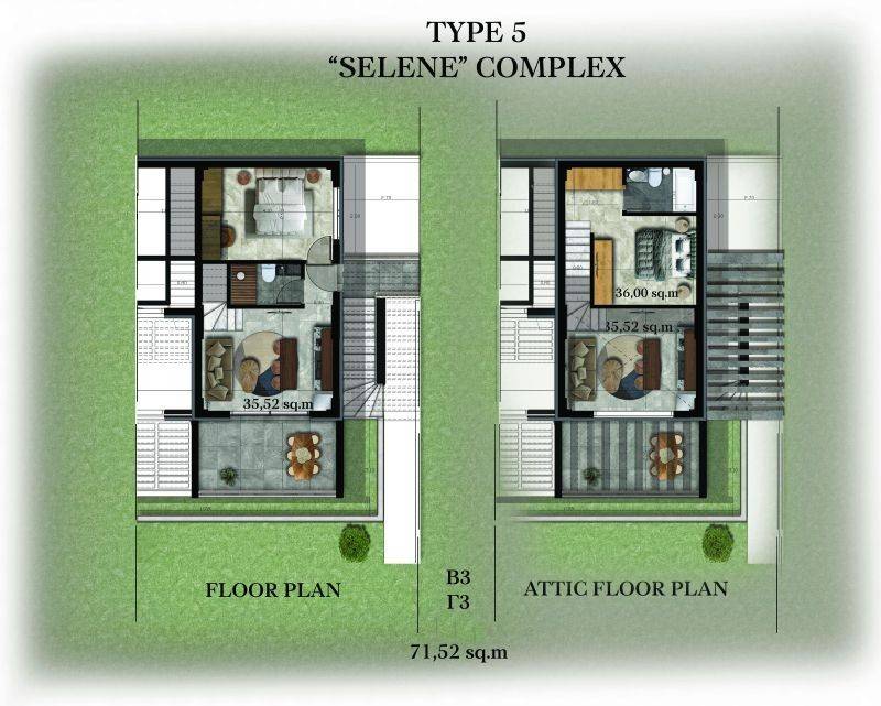 • 14 Maisonettes, 61.40 m², consisting of a living room with kitchen, 2 bedrooms, and 2 bathrooms.