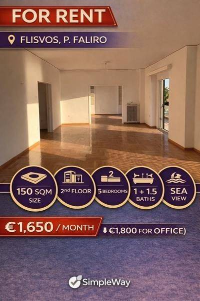 Paleo Faliro, Flisvos - Apartment 150sqm bedrooms 2, levels 1, 2nd, renovated, year built 1980, renovation year 2021, energy class E, 2 living rooms, kitchen, bathroom, wc, heating type: central (natural gas), luminous, corner, panoramic view, frontage, balconies, large balconies, elevator, aluminum frames, double glazed windows, wood & tile floors, secure door, residential zone.