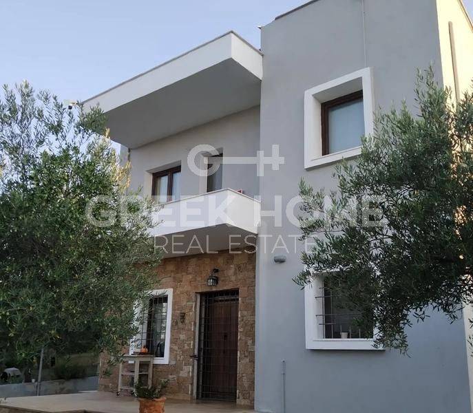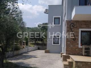 Hortiatis, Exochi - Detached House 265sqm plot 4050sqm, unfurnished, bedrooms 4, levels 3, ground floor - 1st - attic, excellent condition, year built 2004, energy class C, living room, hall, kitchen, 4 bathrooms, wc, heating type: autonomous (oil), parking, quiet, dual aspect apartment, luminous, unobstructed view view, frontage, storage space, solar heater, fireplace, balconies, garden, garden 3785sqm, aluminum frames, double glazed windows, door screen, wood & stone floors, secure door, alarm, surveillance cameras, luxurious, internal staircase, barbeque, playroom, guest house, pets allowed, east-southern orientation.