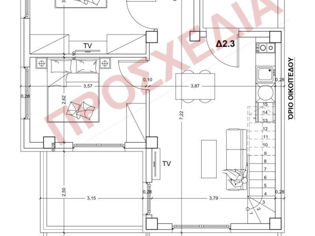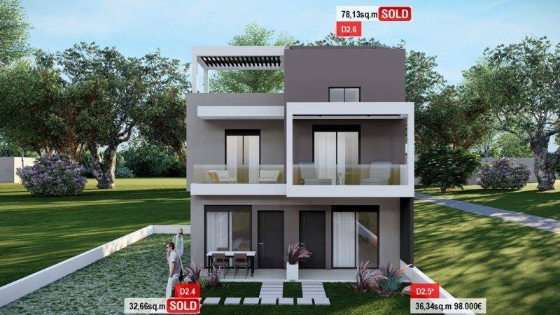 • 2 Διαμερίσματα ορόφου με σοφίτα 78,13τ.μ, που αποτελούνται από σαλοκουζίνα, 3 υπνοδωμάτια, 2 μπάνια.
