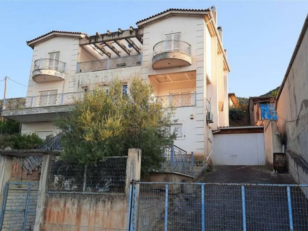 Three-storey residence of a total area of 355.10 sq.m. located in Selinounta, in Aigialeia region, close to the town of Aigio in Achaia. The property was built in 2000 in a rectangular shaped landplot of 557.60 sq.m. with frontage to a municipal street. It comprises of a ground floor with a living room, kitchen, bathroom, storage space & 1 bedroom, a 1st floor with a living room, kitchen, bathroom & 1 bedroom and a 2nd floor with a bathroom & 3 bedrooms. All levels have verandas or balconies with northern orientation. A general renovation is required. The house has been designed to feature a staged garden in the front area and an uncovered area in the back yard (185 sq.m.), part of it is paved. There is unobstructed view to the surrounding area of Corinth Gulf and of the mountain range of Dorida in the north.  There is also an inclining ramp leading to a closed garage area, suitable to cover 1 car spot. Other cards can be also parked in front of it within the property's fenced perimeter. Selinounta is a small village with prevailing residential uses and some scattered local convenience businesses. Shops, supermarkets, pharmacies etc. are located in Aigio, which is the focal point of interest in the broader area. Due to the distance and road network configuration, a car is essential for travelling to Aigio. Distances: Supermarkets in Aigio (3.9 km. - 5 min. drive), Aigio centre (6,4 km. - 11 min. drive), Nikoleika Beach (6,8 km. - 10 min. drive), Patra centre (46 km. - 38 min. drive).