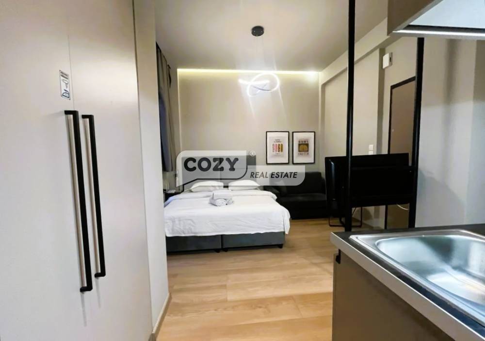 For rent: a luxury, fully renovated 28 sq.m. studio on the 3rd floor with elevator, located at Fragkon 24. It consists of an open-plan bedroom–kitchen area and a bathroom. Fully furnished and equipped with all electrical appliances.
