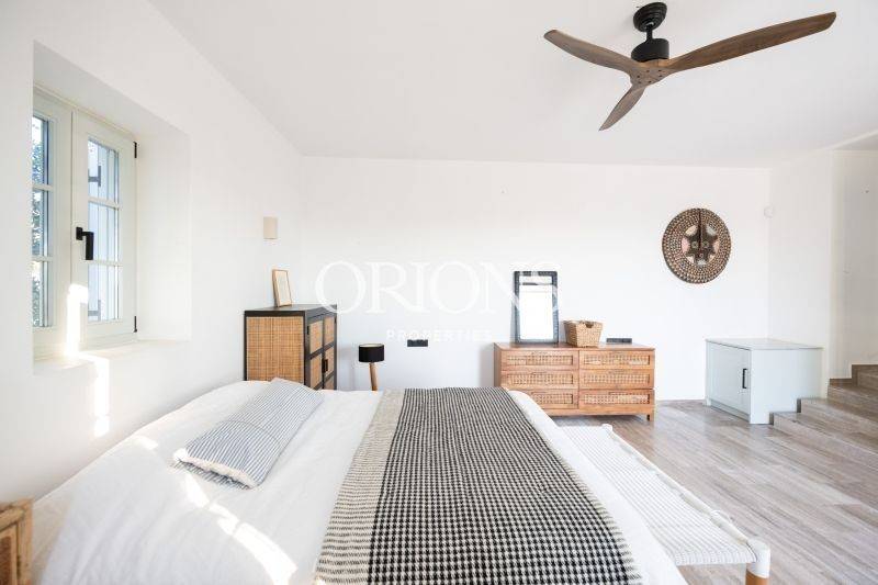 The property includes two independent houses. The primary residence features three master bedrooms, each designed as a private suite, a large living room with a fireplace, a guest WC, a dedicated office corner, and a spacious kitchen. All bedrooms are above ground level and enjoy natural light, open views, and direct access to their own private terraces.