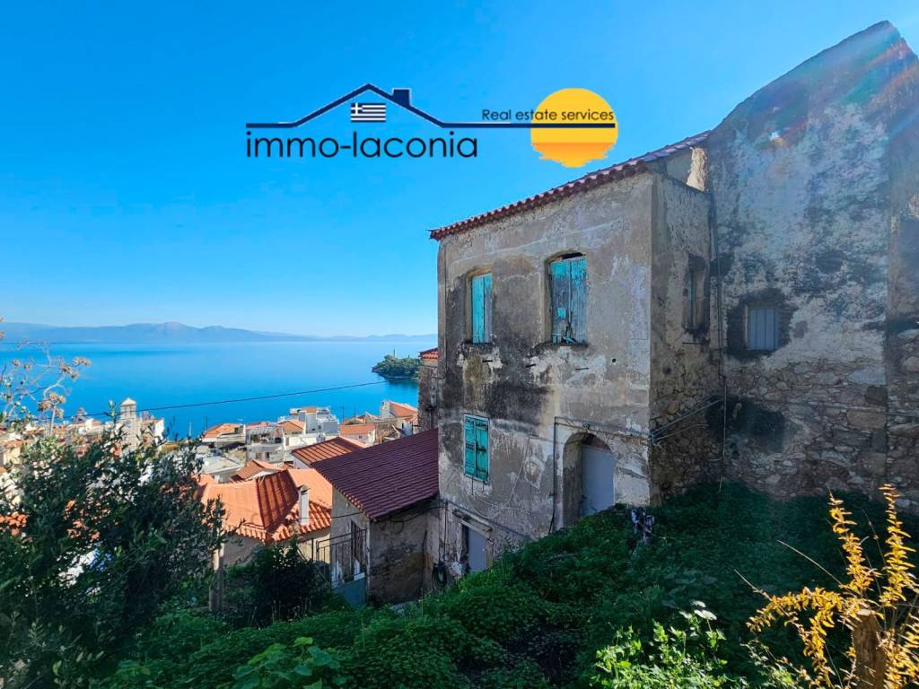 This authentic stone house, constructed 1870, sits on a 595 sq.m plot elevated on the Akoumaros hillside in the town of Gythio. The property boasts exceptional, unobstructed panoramic views of the town, sea, and the entire Laconian Gulf. The house comprises approximately 180 sq.m distributed across three levels. While structurally sound, it requires extensive renovation. The ground floor features a 19 sq.m vaulted room with two windows, accessible via an external door at the front of the house, where a public municipal footpath passes. An external staircase along the side of the house provides access to the upper-level entrances. The first floor entrance opens to a hallway with a small bathroom, followed by a compact kitchenette and two rooms. This level also includes a separately accessed vaulted chamber, with a second, lower vaulted space at the rear containing a cistern. The second floor features a corridor leading to a central vestibule, from which one accesses one large room, two smaller rooms, a kitchen, and a storage area. An internal staircase—partially stone, partially wood—ascends from the vestibule to the third floor, which contains two rooms. From this level, an external door provides the sole access to the larger portion of the terraced plot behind the house, where a traditional built-in oven stands adjacent to the building. This residence, respectful of the local architecture and historical character of the area, contributes to the enduring charm of the traditional settlement. The undeveloped portion of the plot extends laterally and predominantly behind the house, terraced at varying levels and planted with several olive trees. The plot is remarkably level and buildable, with potential for additional construction in accordance with current urban planning regulations. This distinctive tower house offers truly spectacular panoramic views. A significant drawback of this property is its lack of direct vehicular access; it can only be reached on foot via a public stepped pathway comprising approximately 70 steps. Consequently, all renovation materials must be manually carried up this route. LOCATION The property is located on a high point of Akoumaros within the town of Gythio, next to the Church of St.Demetrios (Sanctuary of Apollo-Dionysus). Distances Straight line from the sea: 170 m Petrobeis Mavromichalis Square of Gytheion: 230 m (3 minutes walk) Shopping center of Gytheion: 900 m (13 minutes walk). Mavrovouni beach: 2,7 km . NOTE: The sales price of 90,000 € is non-negotiable. Our commission is 2,000 € + 24 % VAT. The commission is due for payment, either half on the day of signing a preliminary contract, the other half or the full amount at the day of signing the final contract or any other agreement. Under no circumstances is there any entitlement to a refund of the commission or the share thereof. For further information and the position data of the property, it is necessary to sign a "Brokerage and Commission Acknowledgement" including identification by valid passport or identity card. as well as by greek tax number if available. DISCLAIMER All information is given without guarantee and is based solely on information provided to us by our clients. We assume no responsibility for the completeness, accuracy and timeliness of the information. Mistakes, changes and intermediate sale are reserved.