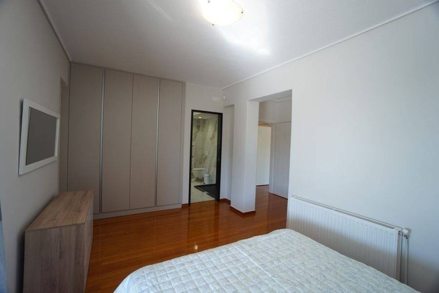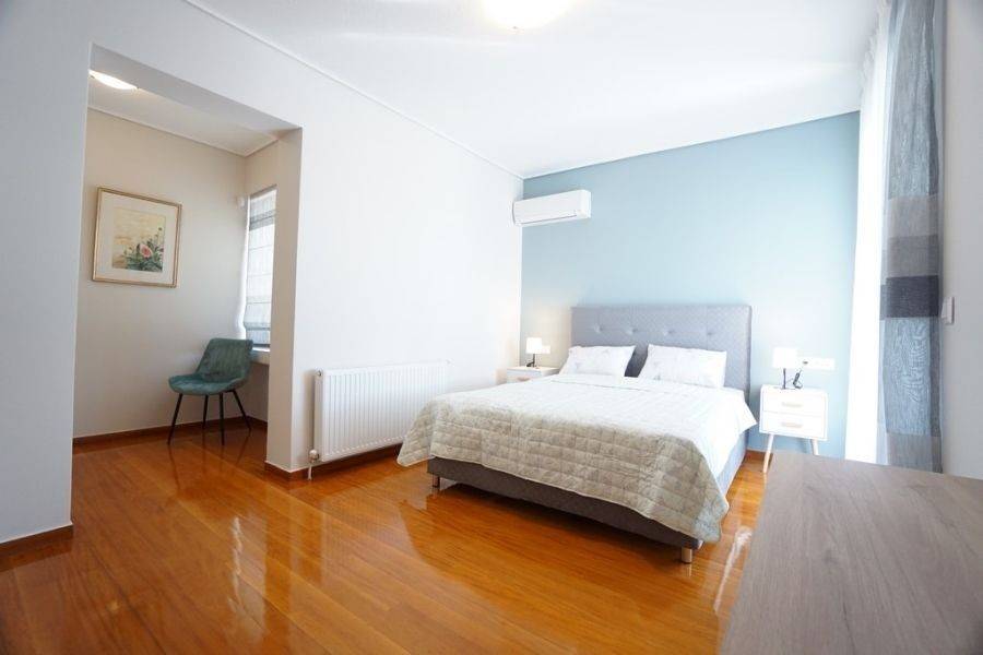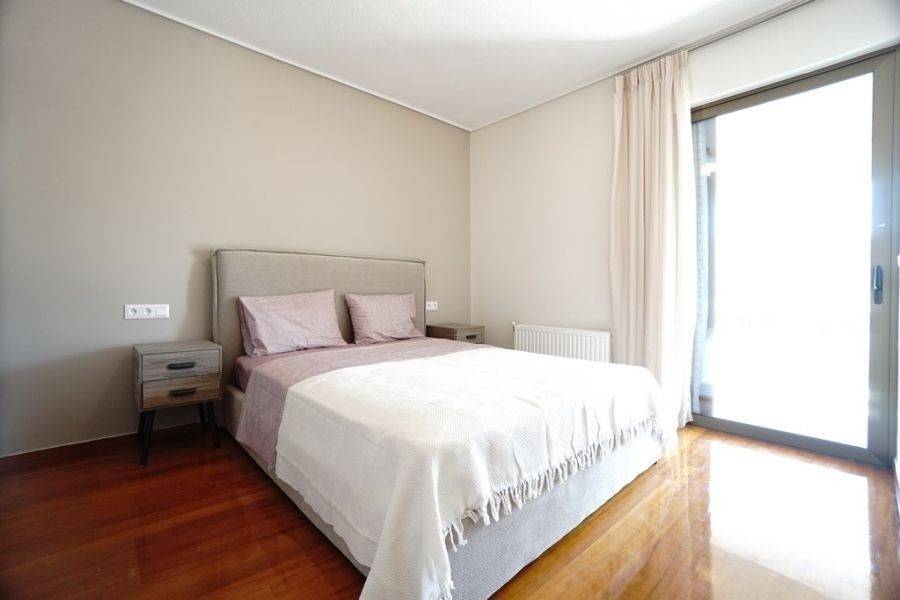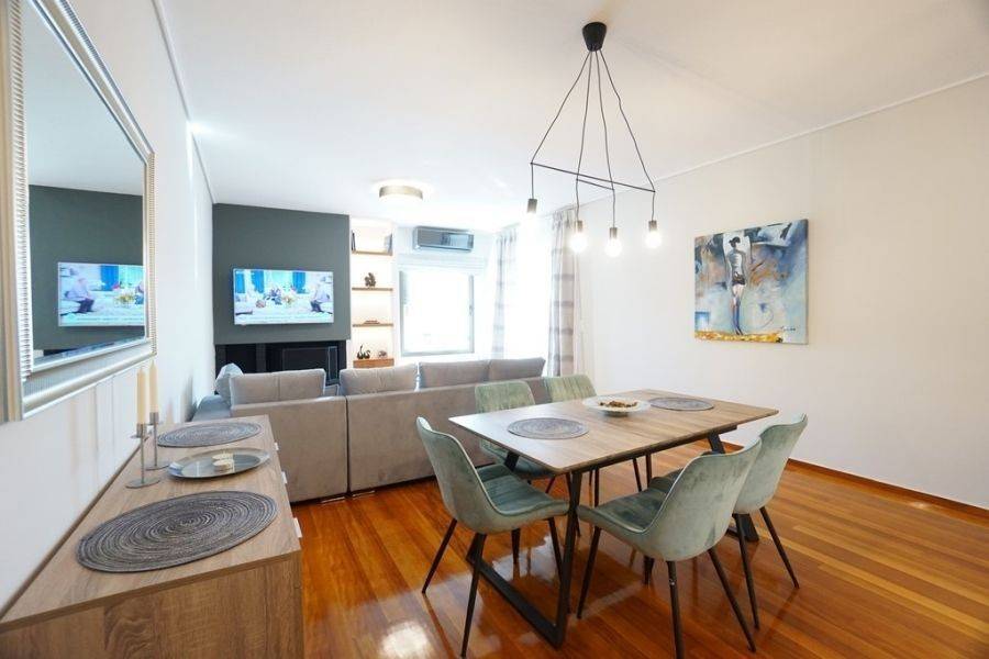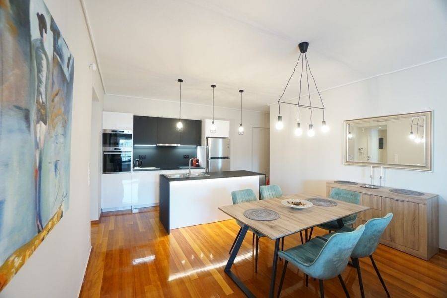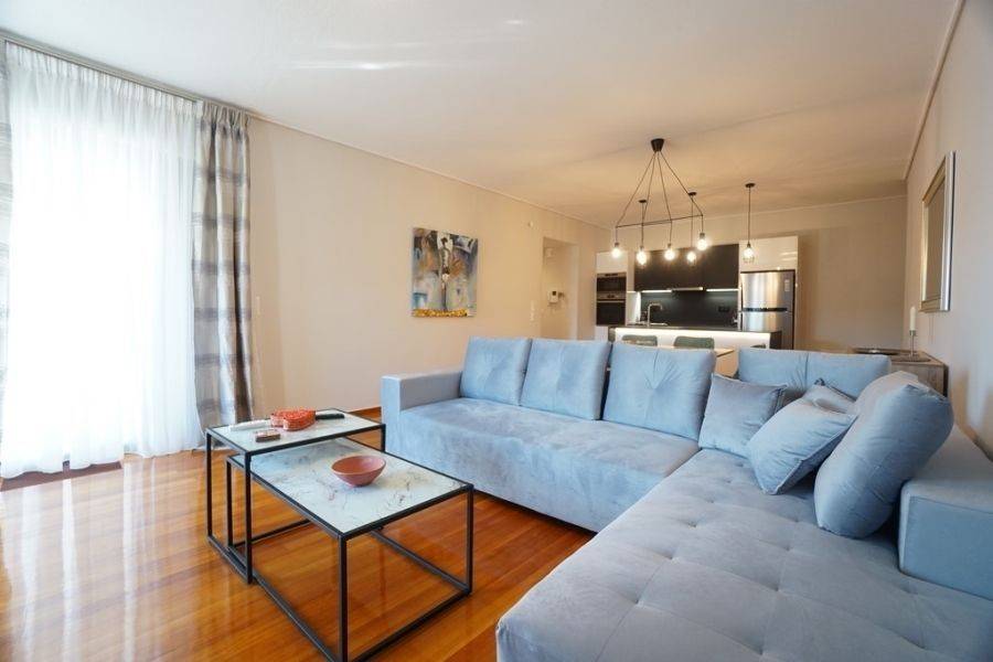 In the southern suburbs, in Glyfada, in Hesperidon Square, a fully furnished apartment of 130sq.m., 2nd floor, is available for rent. It is a fully and luxuriously renovated apartment in 2022, front view, corner and very bright. It consists of 3 bedrooms (one of which is a master), 2 bathrooms, a functionally equipped kitchen with electrical appliances and a bright living room with wooden floors and a fireplace. It has a parking space, a security door, an alarm system, a video phone door, double glazed windows and large verandas. The heating is autonomous with natural gas, while air conditioners for cooling and boilers for heating the water are also available. It is located in an amazing location, in the center of Glyfada with the very developed market and public transportation, in front of a square and very close to the beach.