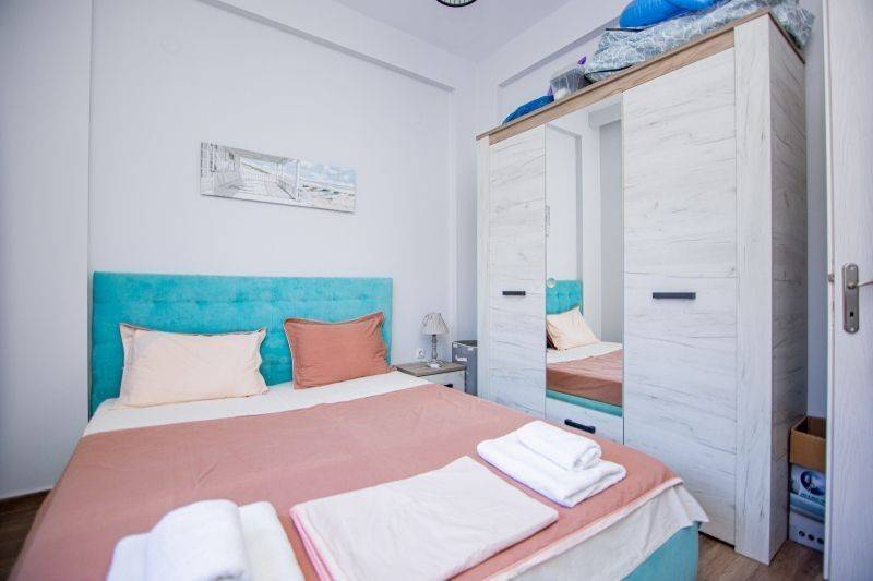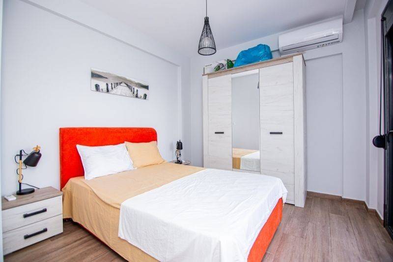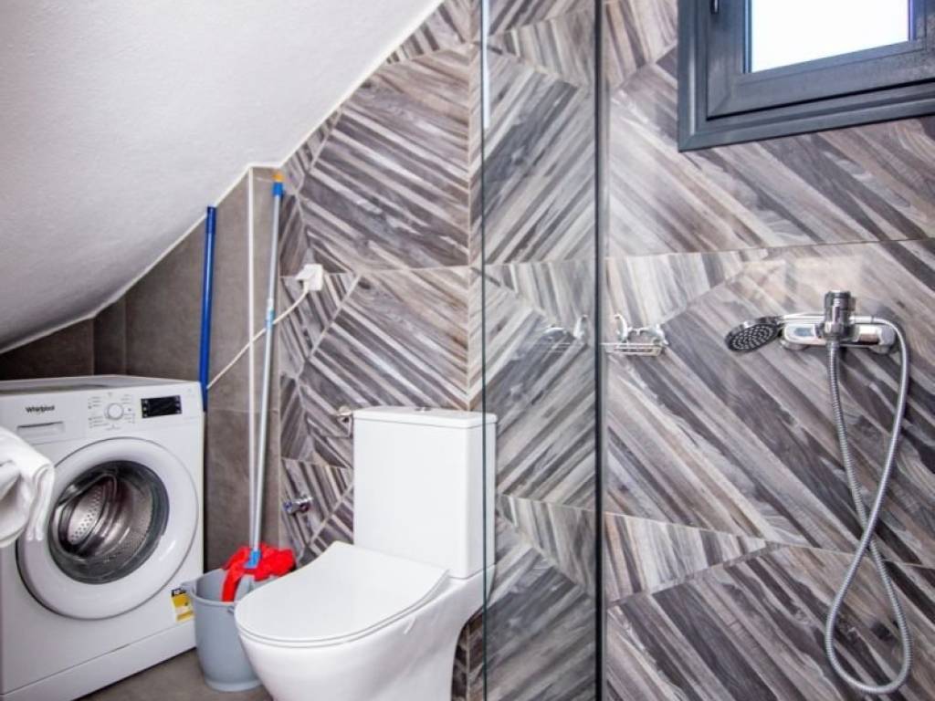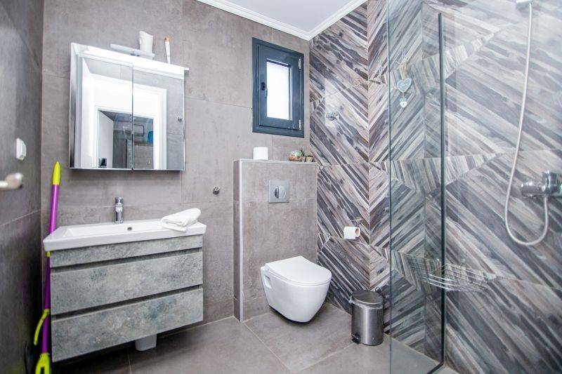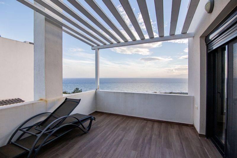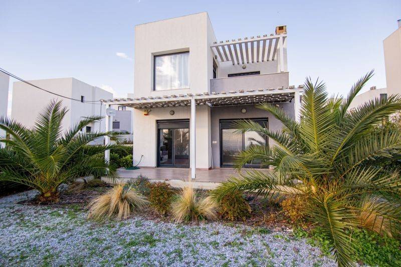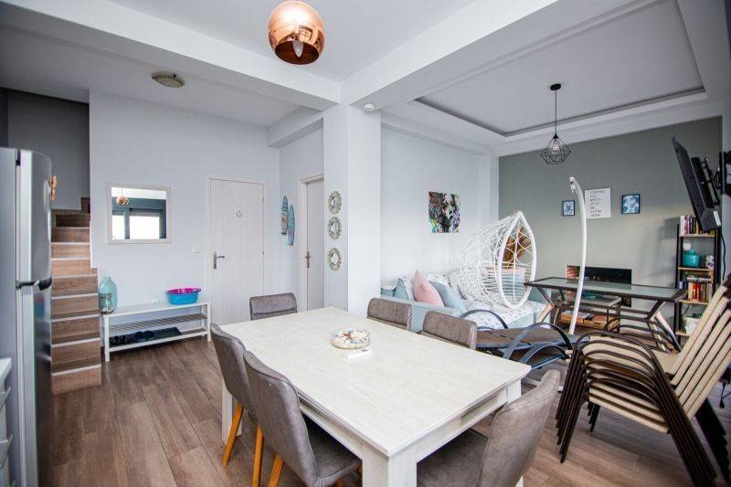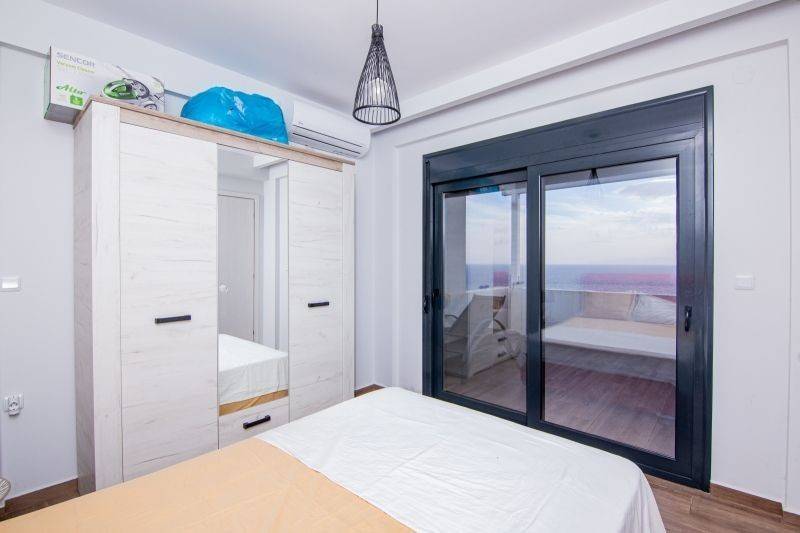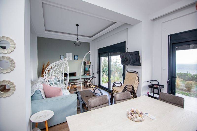 The first floor, accessed via an internal staircase, consists of two spacious bedrooms and one bathroom. The property features synthetic window frames, a solar water heater, and air-conditioning units. The residence has a southeast orientation and is located 350 meters from the sea.