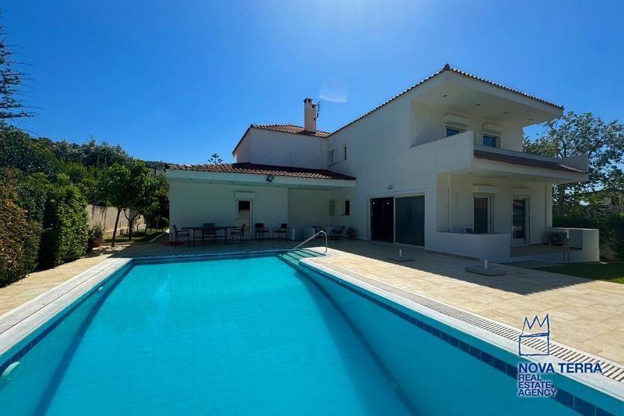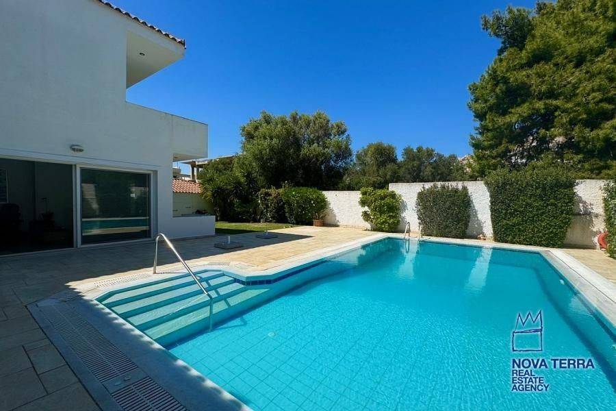 SARONIDA, House,, Sale, 290 sq.m, on a plot of 750 sq.m, year built 1990, 4 rooms, Ground Floor, 1st, View: Partial Seaview, Various Characteristics: Balcony, Bath (3), Fire Place, Garden, Kitchen (2), Living room, Store Room, Swimming Pool, Toilet, Master Bedrooms: 2 Master Bedrooms, Flooring: Tile, Heating: Air Conditioning, Αutonomous oil heating, Access road, Bright, Double-glazing, Facade, From Side to Side, Luxury, Night charge, Painted, Residential area, Screens, Security Door, Tents, In perfect condition: Parking area: Garage, Energy class: C. property ID: 49865, www.nova-terra.gr