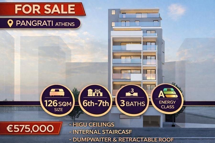 Vyronas, Neo Pagkrati - Apartment 126sqm bedrooms 3, levels 2, 6th - 7th, year built 2025, energy class A+, living room, kitchen, 3 bathrooms, heating type: autonomous (natural gas), air condition, parking covered, dual aspect apartment, mountain view, storage space, solar heater, balconies, elevator, aluminum frames, door screen, wood floors, night electricity discount rate, secure door, ev charger, pets allowed, residential zone.