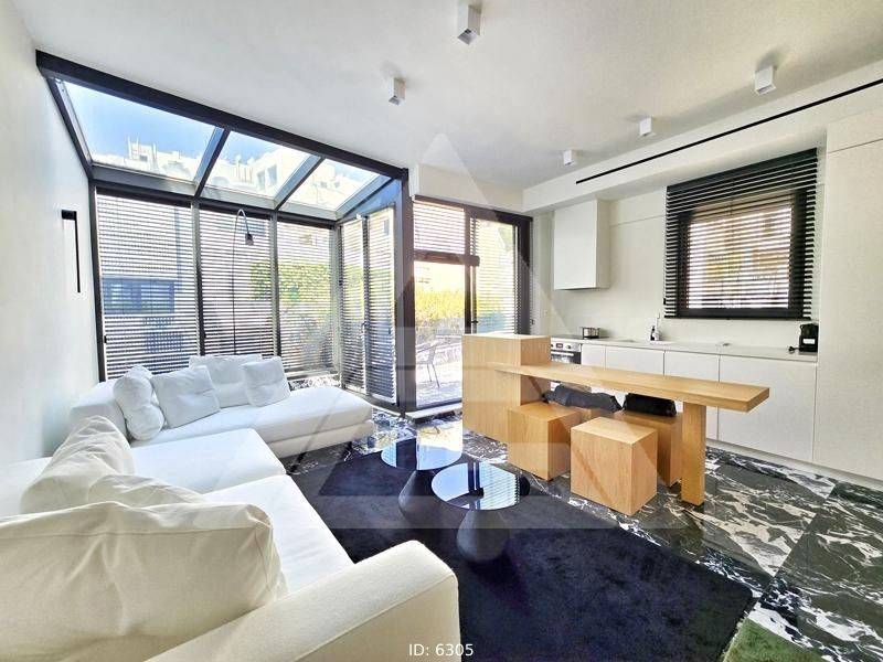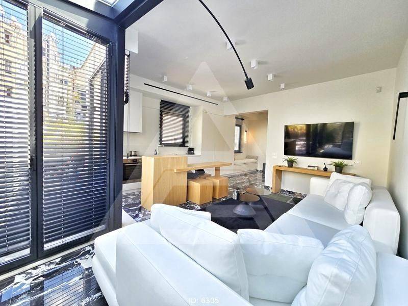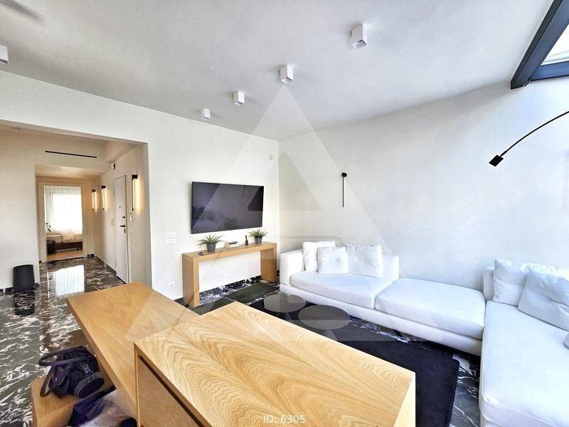 Kolonaki - Floor Apartment 116sqm fully furnished, bedrooms 2, master bedrooms 2, levels 1, 5th, fully renovated, year built 1970, renovation year 2023, energy class A+, living room, kitchen, 2 bathrooms, wc, heating type: autonomous (heat pump), air condition, quiet, dual aspect apartment, luminous, frontage, painted, drop ceiling, balconies, large balconies, balcony 60sqm, elevator, built in appliances, aluminum frames, double glazed windows, door screen, wood & tile floors, secure door, alarm, luxurious, jacuzzi, smart home, residential zone, southern orientation, access from asphalt, close to square (up to 100m), close to market (up to 100m), close to metro/train (up to 100m).