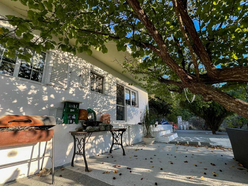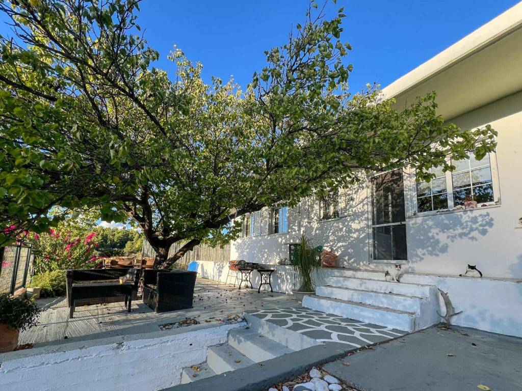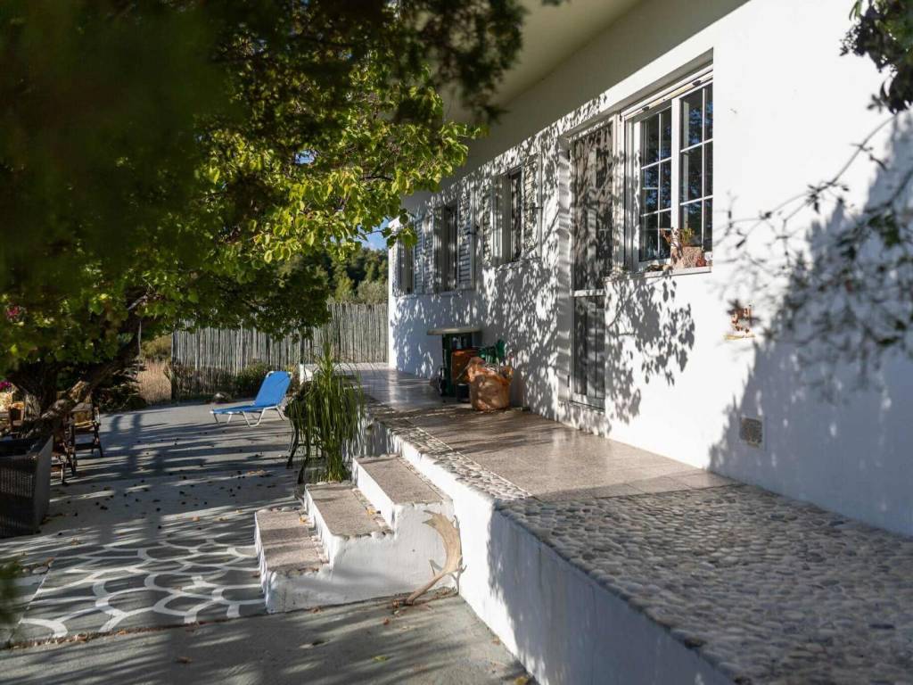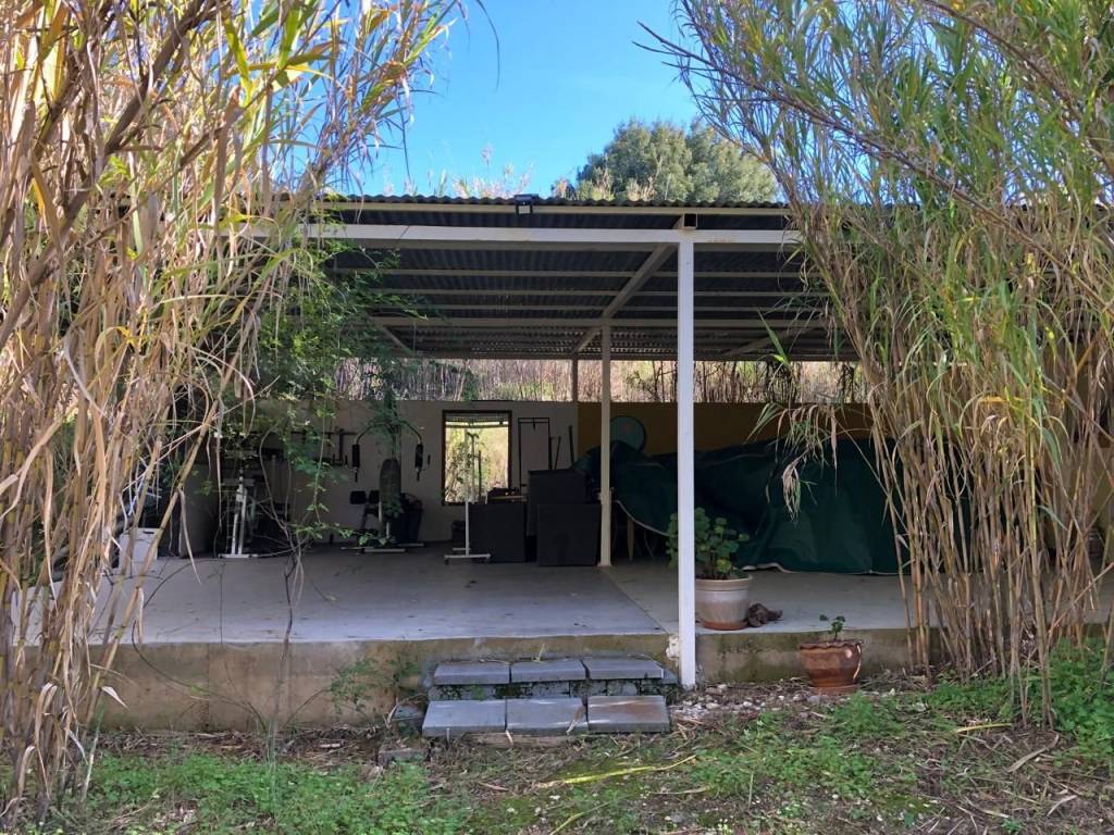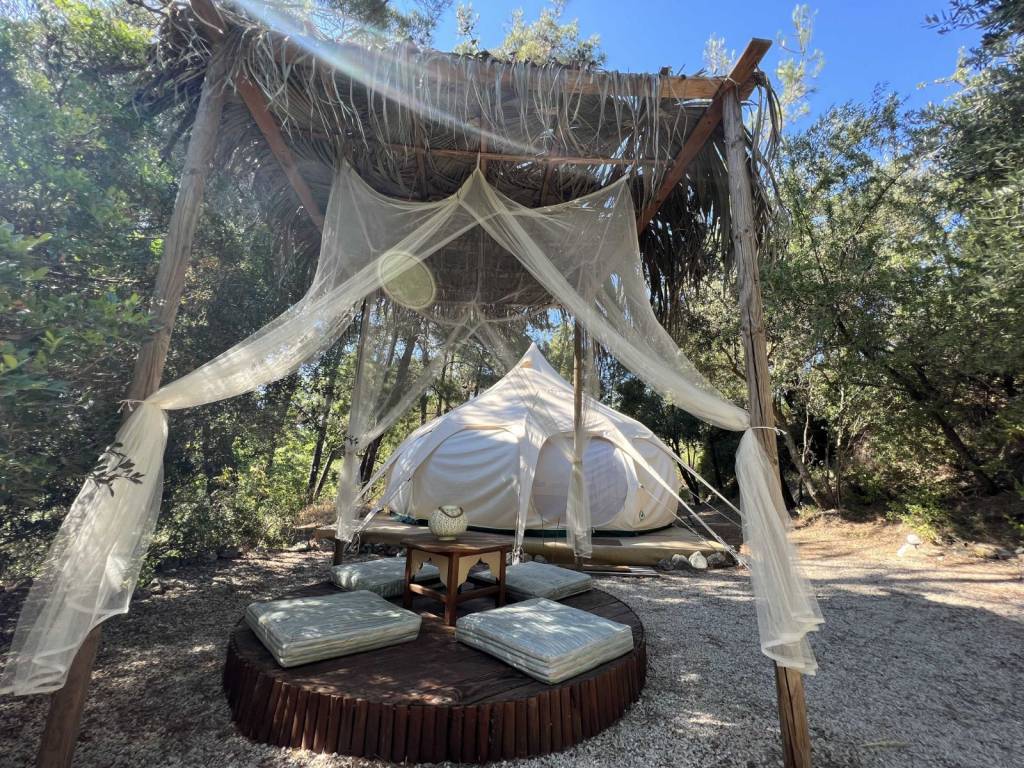 61.16 m² home is for sale with a potential rent / entertainment business onsite. The land is 1.4 ha with 50 mature olive trees, private road, completely surrounded by nature (hills and forests). The land is divided into 4 levels at different elevation. The house is at the highest level (4) thus with a view of the land. It has an open plan kitchen – dining area, a bedroom and a bathroom and another en-suite bedroom with a seperate entrance. On a lower level (3), there is a large stage with wooden poles prepared for a roof (fabric or straw) – an area that could be used for entertainment or events. At the 2nd level, there is a kitchen for guests to use with a large open-plan sitting area and a gym, as well as utility/storage room. At the lowest level (1), 4 Lotus Belle Tents are built on solid pitches each with installed eco certified composting WCs (low impact, odor free) and showers with water boilers. Check VinSan Glamping & Wellness Centre for more photos. Local Eleousa shops and restaurants – 2 mins drive, ~20 km to airport, ~15 min to beaches.