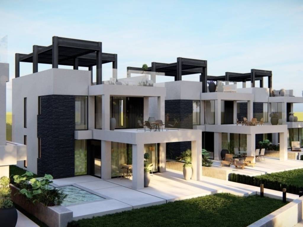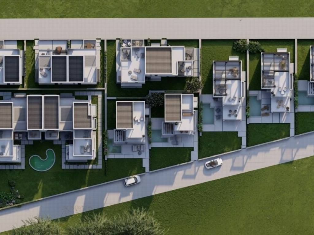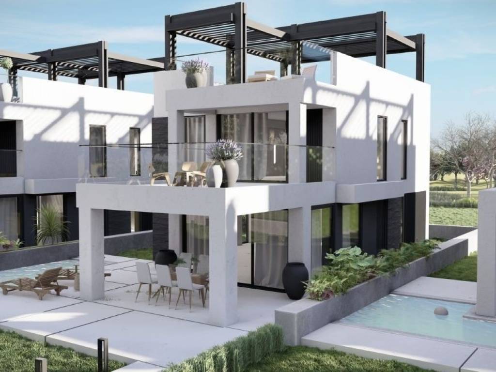 • 3 two-storey houses 139,75 sq.m. (living room/kitchen, dining room, 3 bedrooms, 3 bathrooms). On the ground floor of the house there is a living room/kitchen, dining room, one bedroom and bathroom. An internal staircase leads to the first floor of the house which accommodates the 2 bedrooms, 2 bathrooms, a cloakroom area and terraces. With modern aesthetics and luxury, we gave life to the terrace of the house by creating a unique atmosphere with pergolas and glass overlooking the endless blue sea for moments of relaxation and carefree moments. The courtyard is beautifully landscaped with barbecue and private pool, while next to the house there is a parking area.