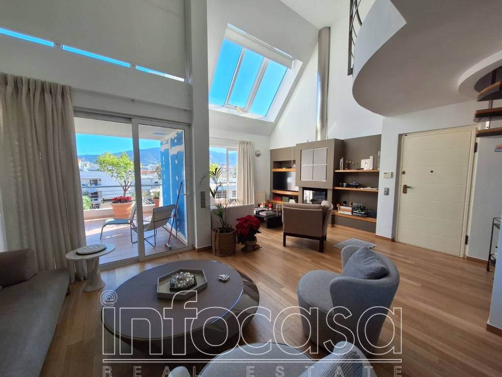 Chalandri (Kato Chalandri bordering with Neo Psychiko): An excellent sunny duplex 4th floor apartment of 145 sqm is available for sale. On the 4th floor, we find the apartment's entrance with a beautiful living room with double height, a dining area, a closed kitchen with built-in appliances, 2 bedrooms, 1 bathroom, and a guest WC. The loft contains a master bedroom that leads to a beautiful large terrace and a small office space. The apartment features beautiful wooden floors throughout, natural gas heating, solar panels, A/C, aluminum window frames with double glazing, a security door, alarm system, and large terraces with unobstructed views of greenery and Mount Hymettus. Additionally, it includes a large underground space suitable for storage and 2 garage spaces. The apartment is located in a prime area, close to all public transportation, local shops, supermarkets, dining centers, and schools. Price: €630,000 Contact person: Katerina Kogia: 6974040009, 2106233945, www.infocasa.gr, info@infocasa.gr