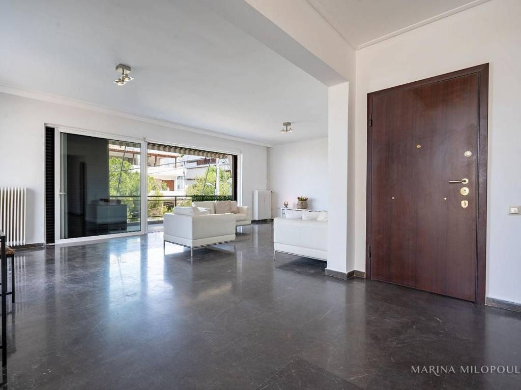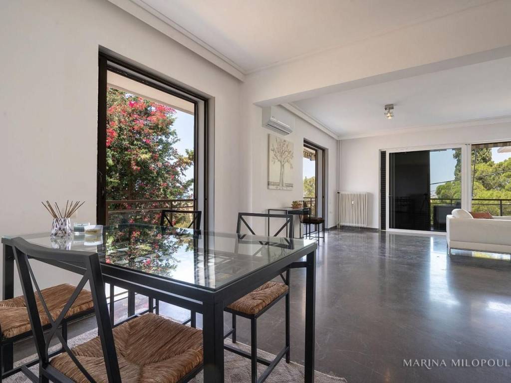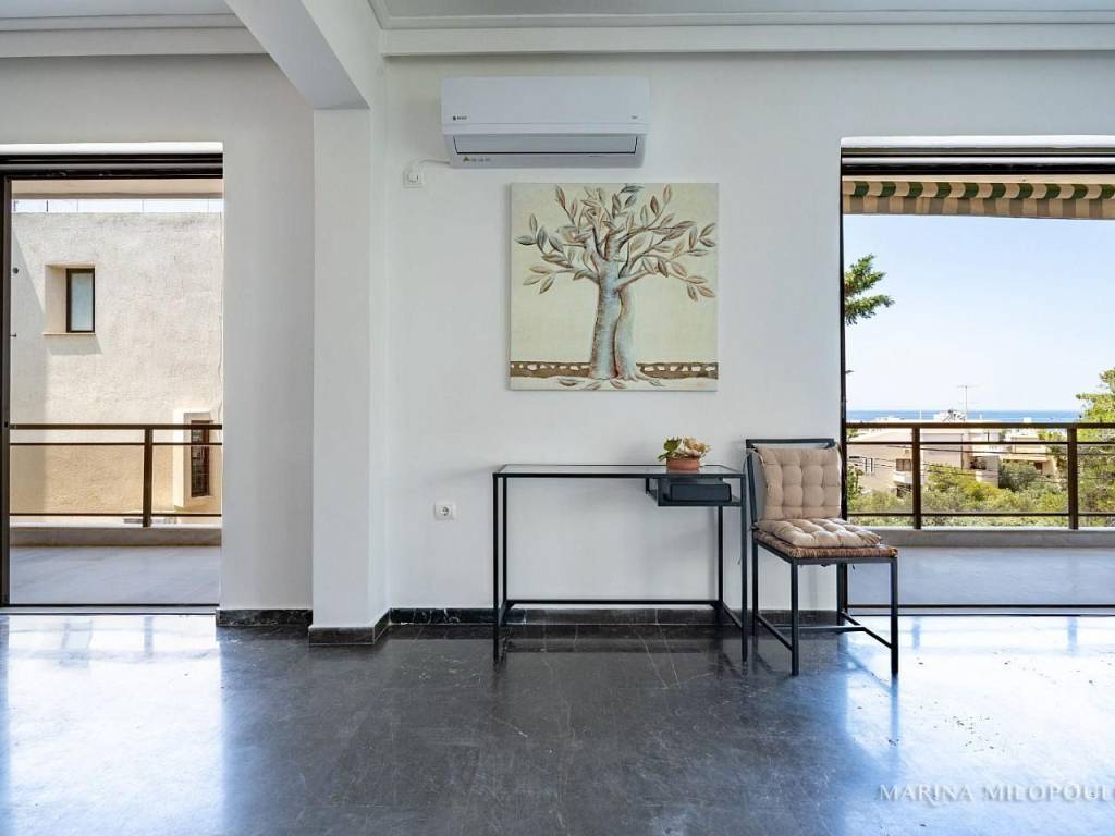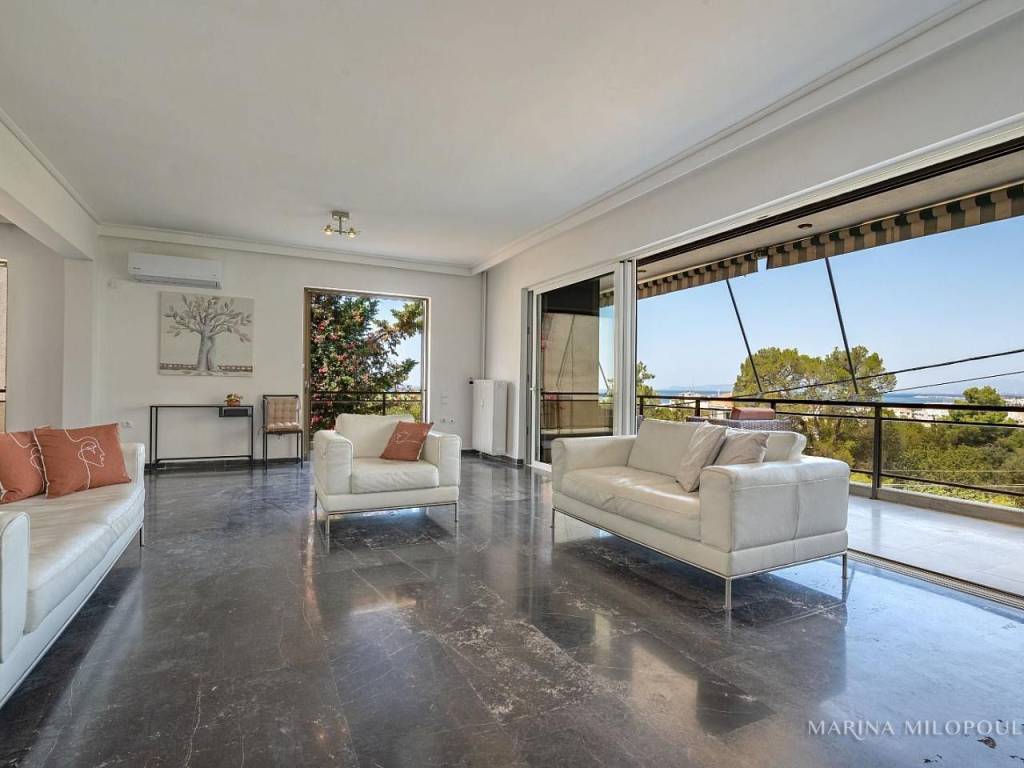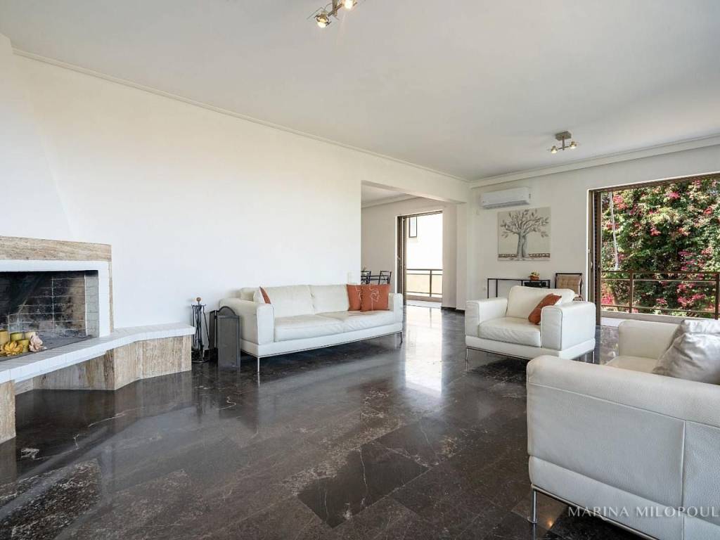 VOULA - Pigadakia, a 2nd floor apartment, 145 sq m, at the border with Vouliagmeni with fabulous sea view. Spacious reception - dining area with fireplace, separate renovated kitchen with electrical appliances, 3 bedrooms, 1 study space, 2 renovated bathrooms and large verandas with beautiful views. The apartment features oak floors in the bedrooms and marble in the rest areas, oil autonomous heating (also per room), 3 A/Cs, double glazing in the living room, 2 storage lofts above the bathrooms and a 2 sqm storage room on the ground floor, parking space in the yard. It is part of a well-maintained, 4-story building with a total of 4 properties, an elevator and beautiful garden. Zone price 2400€. Maintenance expenses aprox. 40€. This elegant residence offers open sea views and a tranquil, elevated setting with direct access to a pine-covered hill, providing a unique sense of countryside living just 850 meters from the coastline. Distance 1.3 km from the organized beach of Apollon Beach Hotel in Kavouri, 2 km from Voula's center, 3 km from Vouliagmeni and Varkiza, 5 km from the shopping area of ​​Glyfada and 18 km from the intern airport.