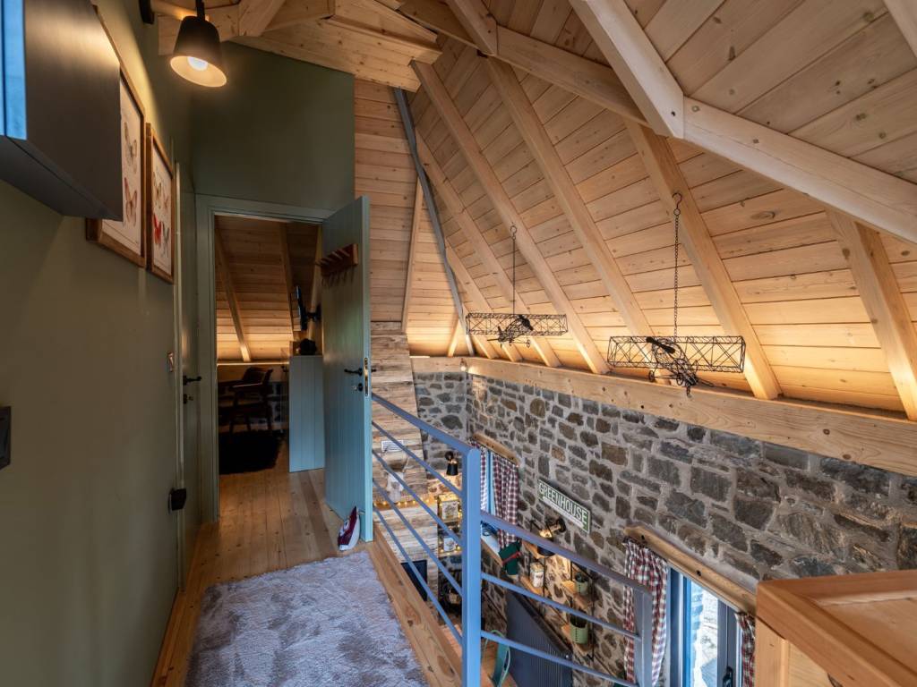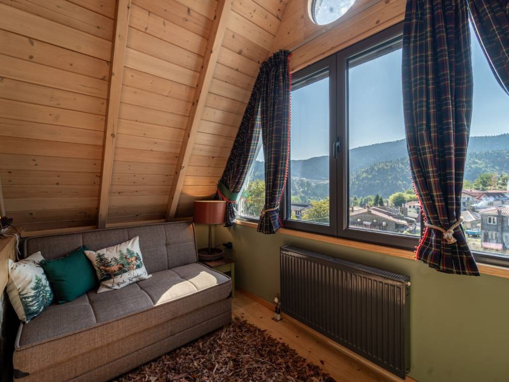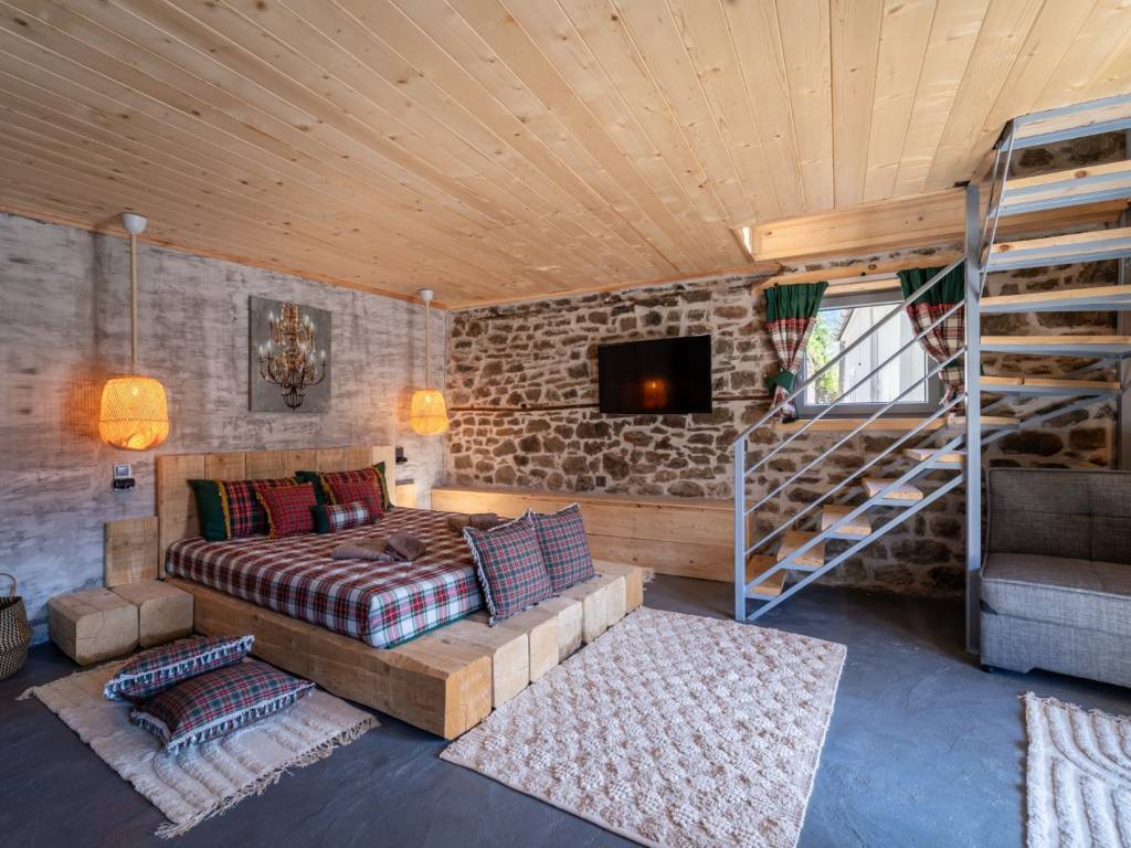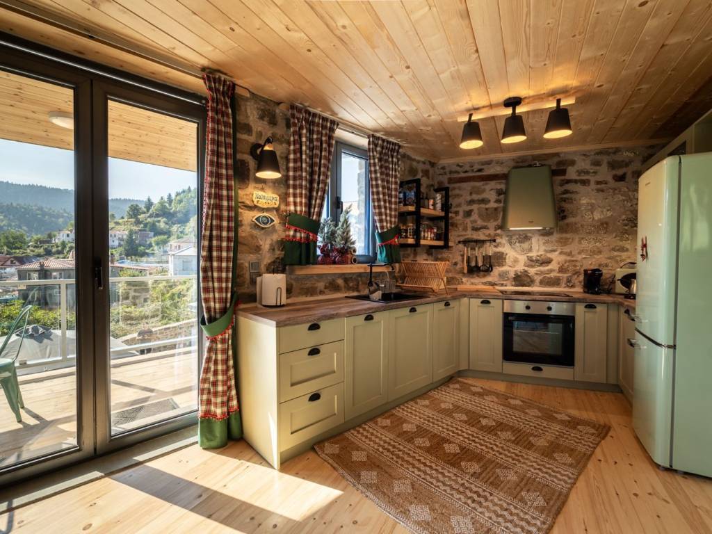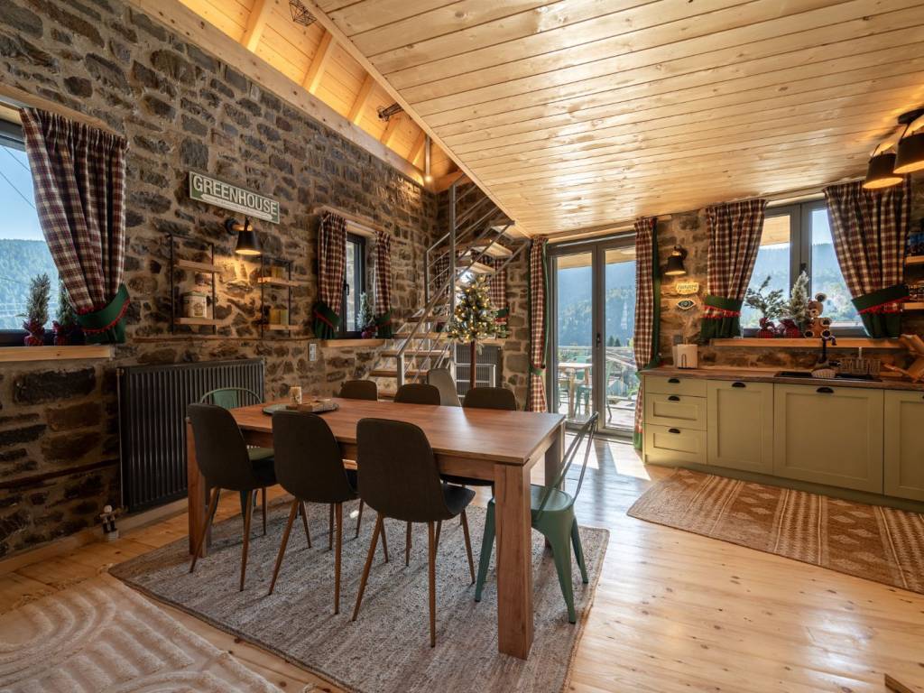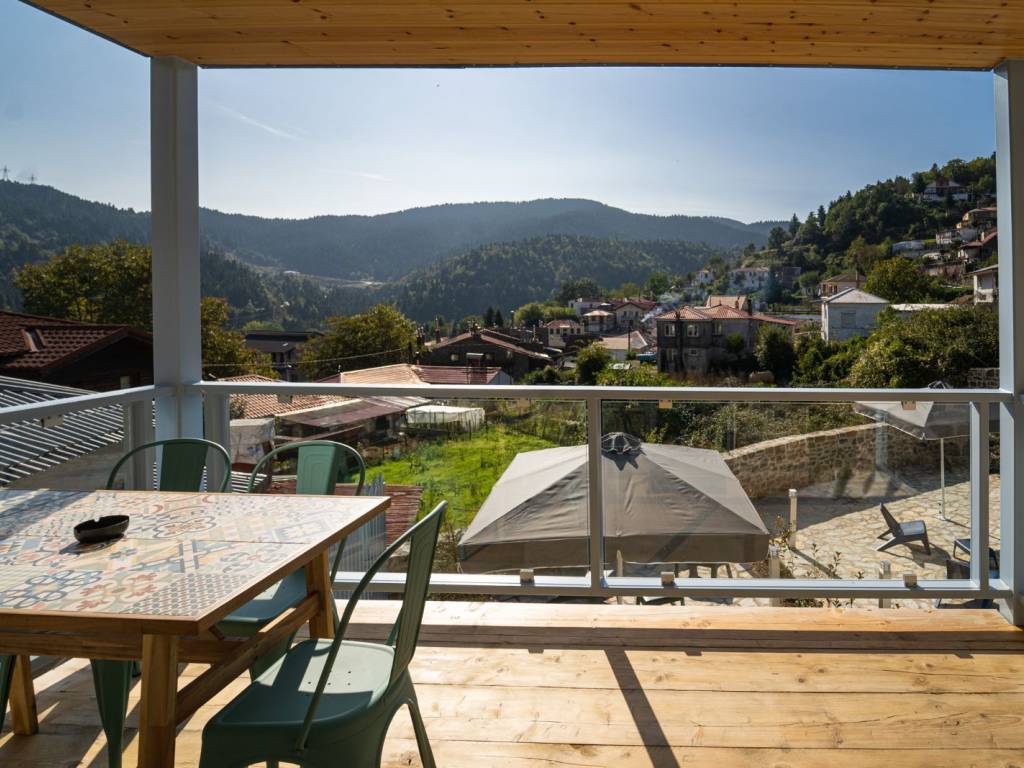 ΠΡΑΣΙΝΟ Στους χώρους μας, σε ένα τριώροφο πλήρως ανακαινισμένο κτίριο, μπορούμε να φιλοξενήσουμε ιδανικά έως 9 άτομα ( 8 ενήλικες + 1 παιδί ) από τα οποία το ένα να είναι παιδί. Ας ξεκινήσουμε την εικονική περιήγηση: Μπαίνοντας από την κεντρική είσοδο του σπιτιού αντικρίζεται την τραπεζαρία. Στον ίδιο χώρο υπάρχει μία πλήρως εξοπλισμένη κουζίνα με και ένα ιδιαίτερο μπάνιο με ντουζιέρα. Η μπαλκονόπορτα στον ίδιο όροφο οδηγεί στο μαγευτικό μπαλκόνι με την πανοραμική θέα. Ανεβαίνοντας στον επάνω όροφο (σοφίτα) μέσω μιας εσωτερικής ξύλινης σκάλας, υπάρχει ο καθιστικός χώρος (open space) με καναπέ – κρεβάτι (1,40×1,90 cm) απ’ όπου μπορείτε να απολαύσετε τη φανταστική θέα προς το χωριό. Στον ίδιο όροφο υπάρχουν άλλα δύο υπνοδωμάτια. Στο ένα υπνοδωμάτιο υπάρχει ένα διπλό κρεβάτι (2,60×1,20 cm) με ένα παράθυρο στο πλάι. Στο δεύτερο υπνοδωμάτιο υπάρχουν δύο μονές υπερμεγέθεις κρεβάτες (2,00×1,60 cm και 2,00×0,90 cm) όπου μπορούν να κοιμηθούν ένα άτομο στην κάθε μία. Εδώ, υπάρχει το τεράστιο παράθυρο με θέα στο πίσω μέρος του σπιτιού και σε ένα καταπράσινο τοπίο. Κατεβαίνοντας από την κουζίνα στον κάτω όροφο υπάρχει ενιαίος χώρος με γωνιακή ντουλάπα κοντά στο κορμόχτιστο king size κρεβάτι (2,00×1,60 cm). Στον ίδιο χώρο υπάρχει το απαραίτητο μπάνιο με ντουζιέρα και στο υπνοδωμάτιο φιγουράρει η «έξυπνη» πολυθρόνα – κρεβάτι – πιθανά για το παιδί του ζευγαριού που θα κοιμηθεί σε αυτό το master bedroom. Αυτός ο τελευταίος χώρος έχει πρόσβαση στην αυλή του σπιτιού. Έξω από το κατάλυμα υπάρχει ελεύθερο παρκινγκ.