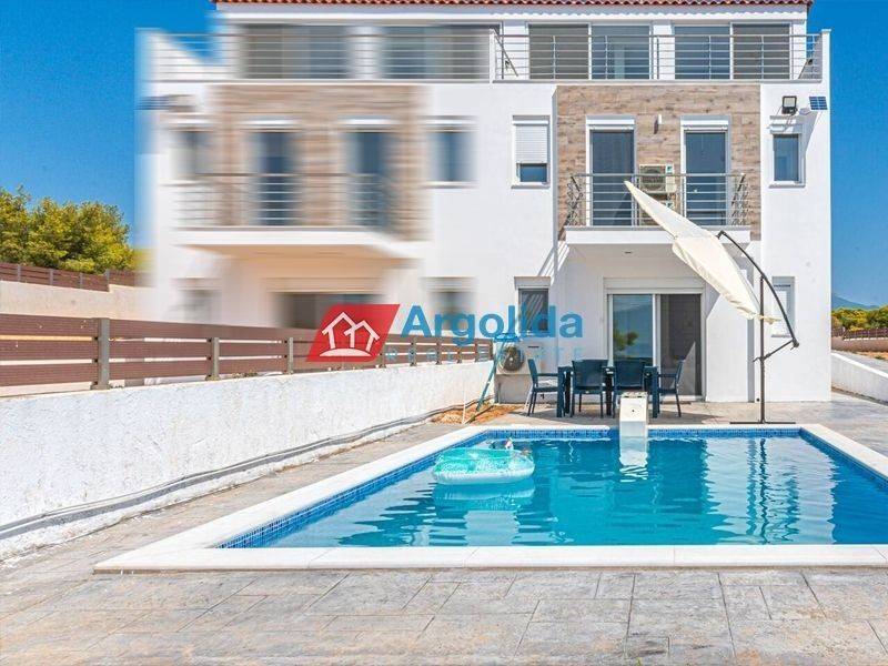 In one of the best neighborhoods of the area in Kavos, Corinthia, just 250 meters from the beach, two adjoining detached houses of excellent construction are for sale, each with a total area of 135 sq.m. on a 640 sq.m. plot. Each house features a superb layout with spacious and functional rooms. The ground floor includes an open-plan kitchen and living area with a WC and direct access to the beautiful garden. On the mezzanine level, there are two large bedrooms, one with an en-suite bathroom, plus an additional bathroom for residents’ convenience. The top floor offers an extra space suitable for a room or office, with a large terrace and WC, providing unique views and tranquility. Built in 2022 with great attention to detail, the property has Energy Class A, individual oil heating, aluminum sliding frames with double glazing and screens, as well as built-in wardrobes. The exterior features a beautiful garden with trees and lawn, a private swimming pool, a 3 sq.m. storage room, parking, and easy access via an internal staircase. This property is ideal for a permanent residence or holiday home, combining immediate access to the sea, peace, and high-quality living in a quiet neighborhood.